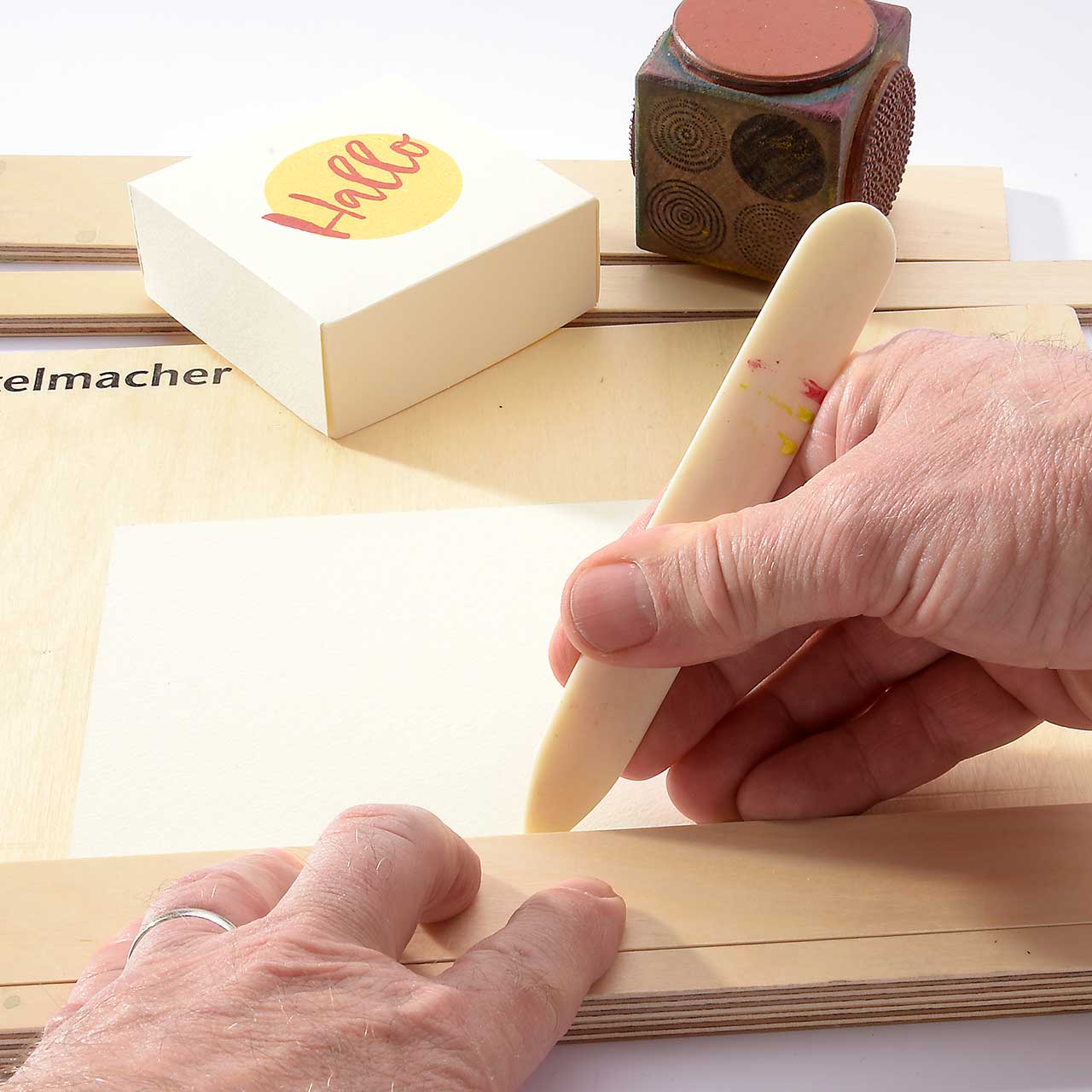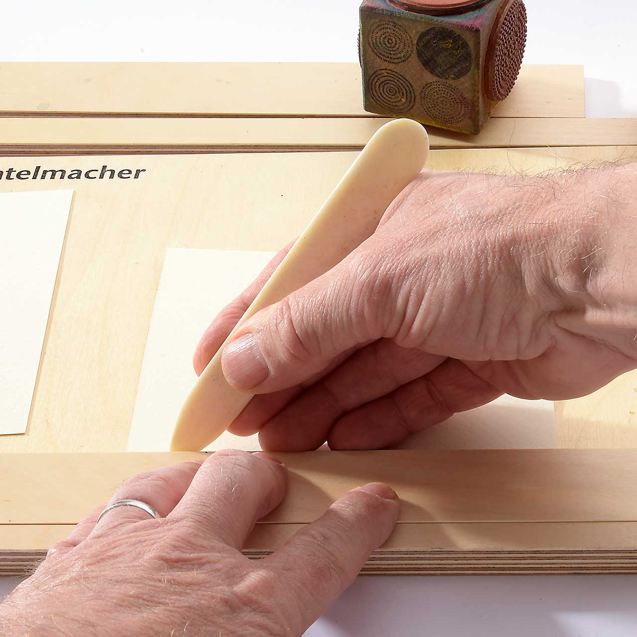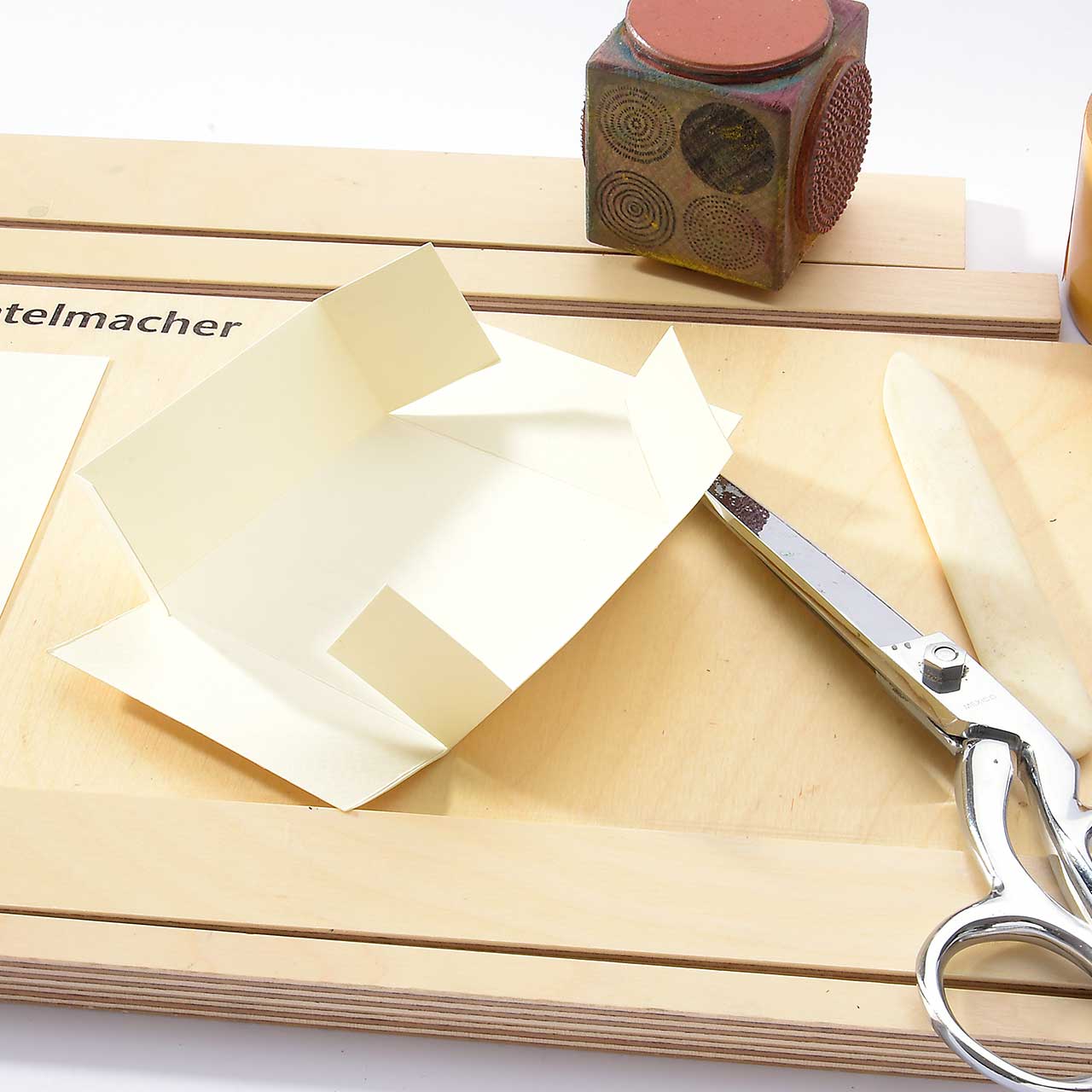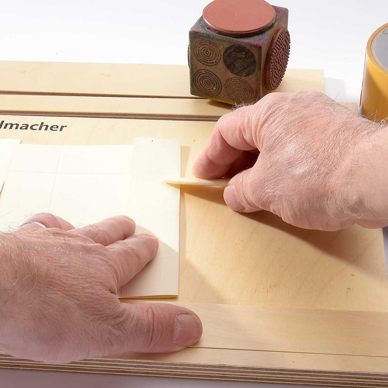Ziehen Sie mit dem Falzbein je eine Nut mit 3 cm Abstand zum Rand des Deckelkartons und falten die Ränder.