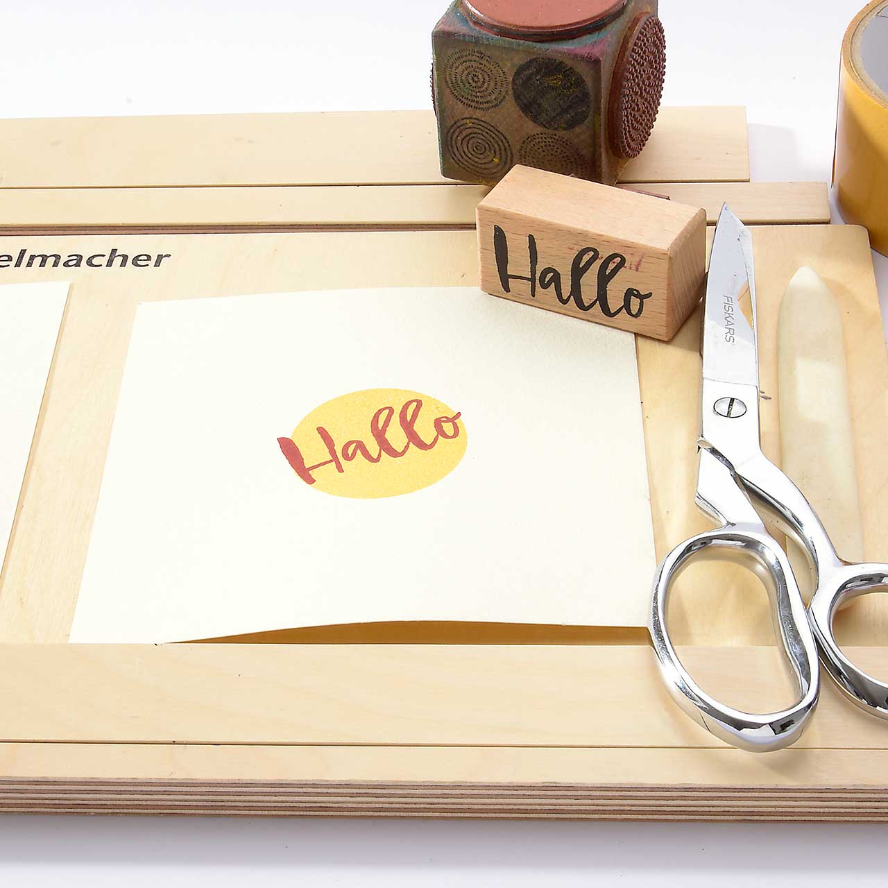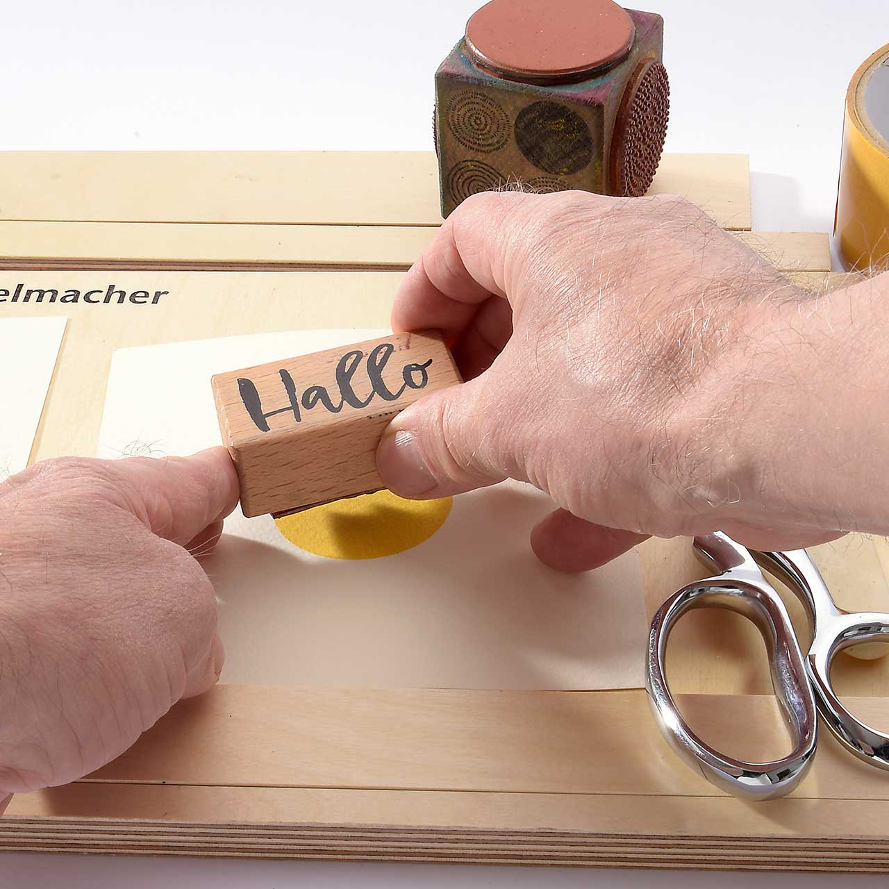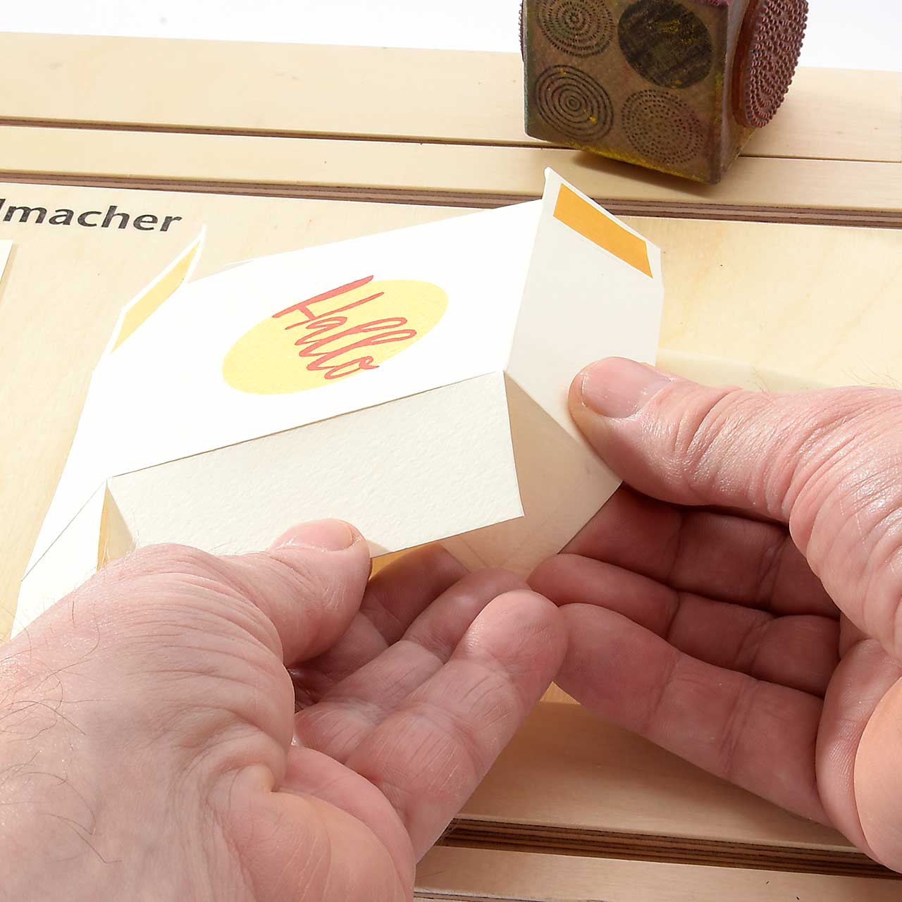 Stempeln Sie das „Hallo“ Textmotiv mit dem roten Stempelkissen etwas schräg auf den gelben Kreis. Lassen Sie die Farbe kurz trocknen.