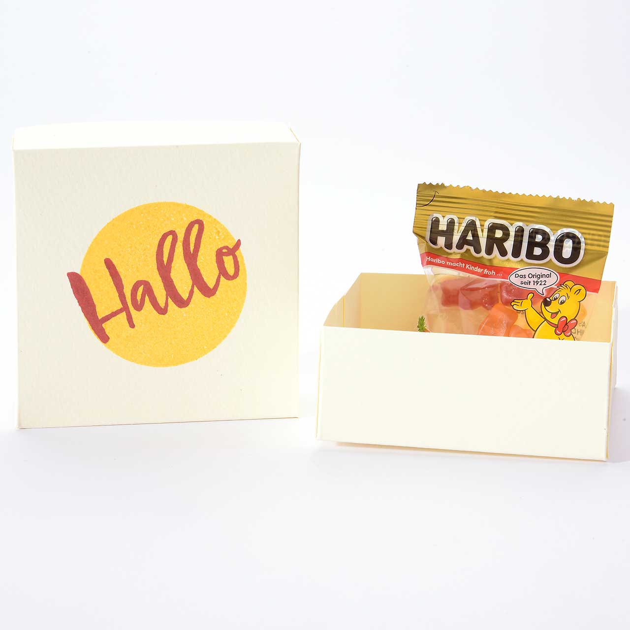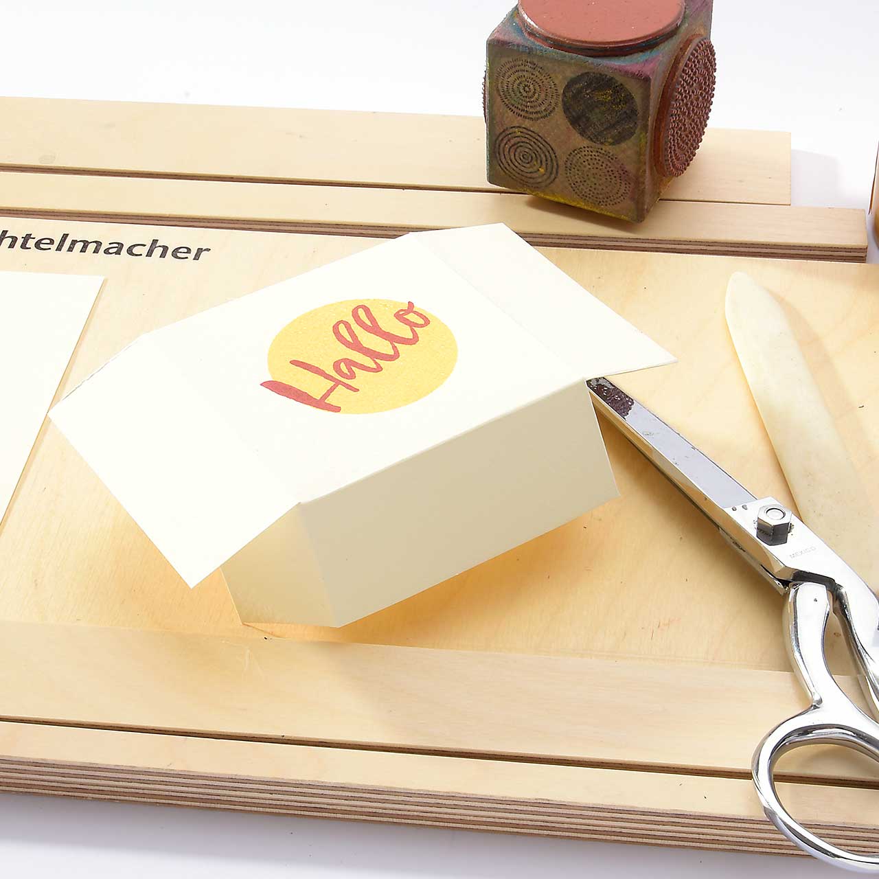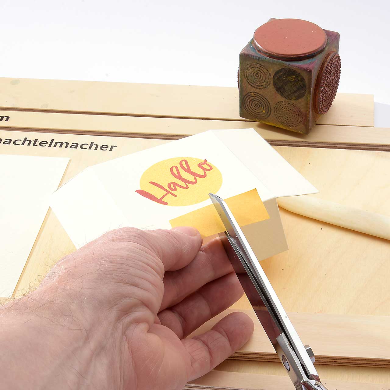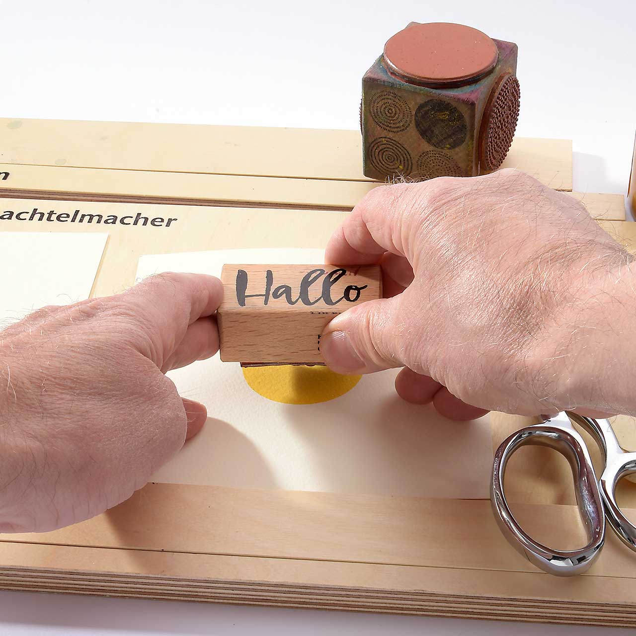 Stempeln Sie das „Hallo“ Textmotiv mit dem roten Stempelkissen etwas schräg auf den gelben Kreis. Lassen Sie die Farbe kurz trocknen.