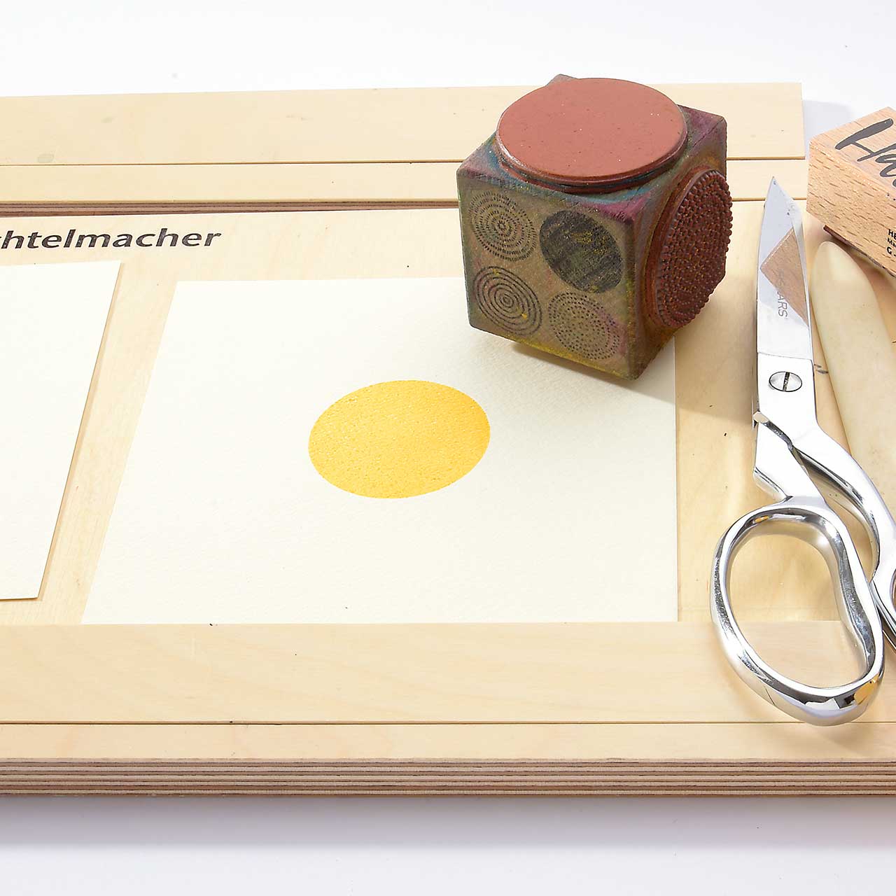 Stempeln Sie das Kreismotiv mit dem gelben Stempelkissen in die Mitte des Deckelkartons. Lassen Sie die Farbe kurz trocknen.