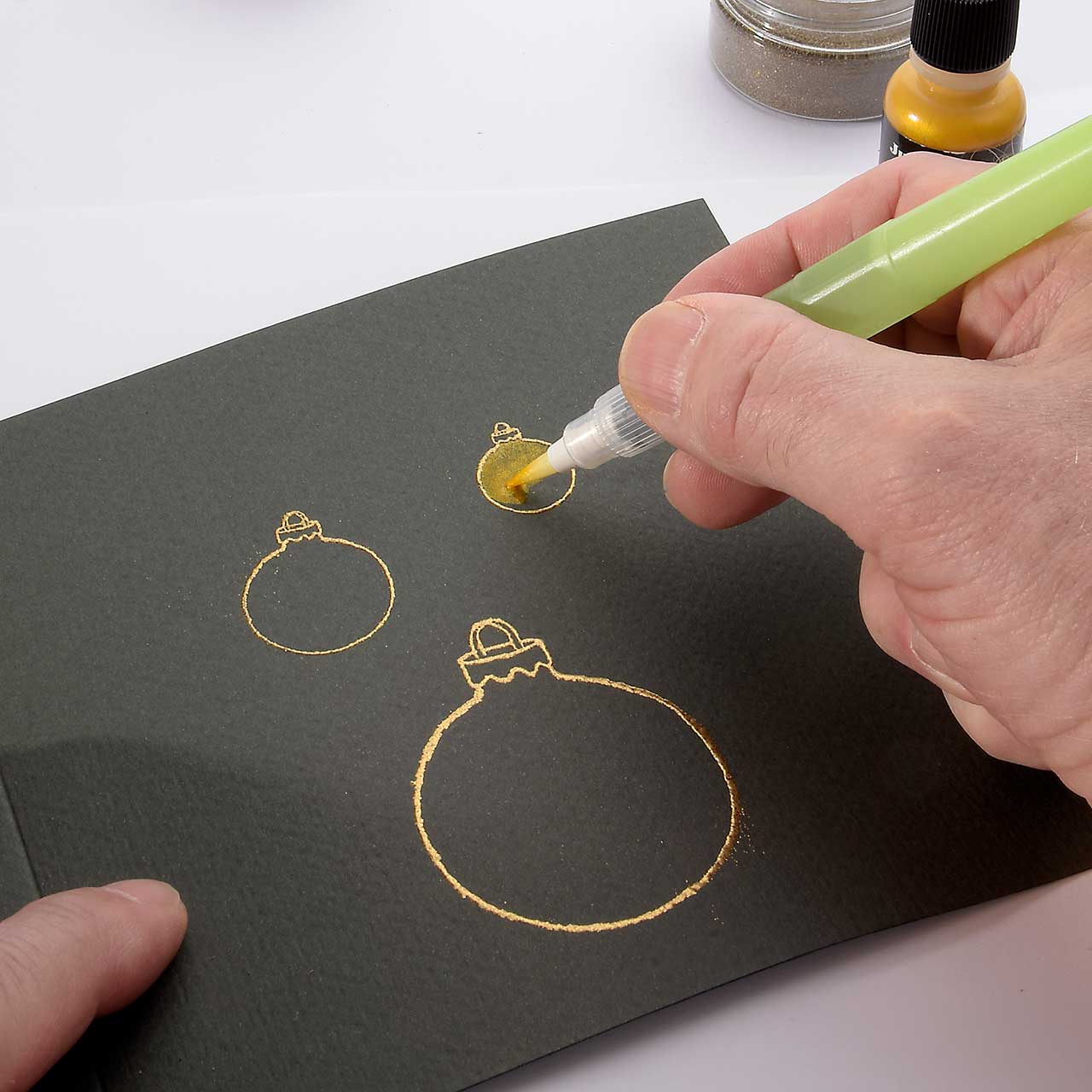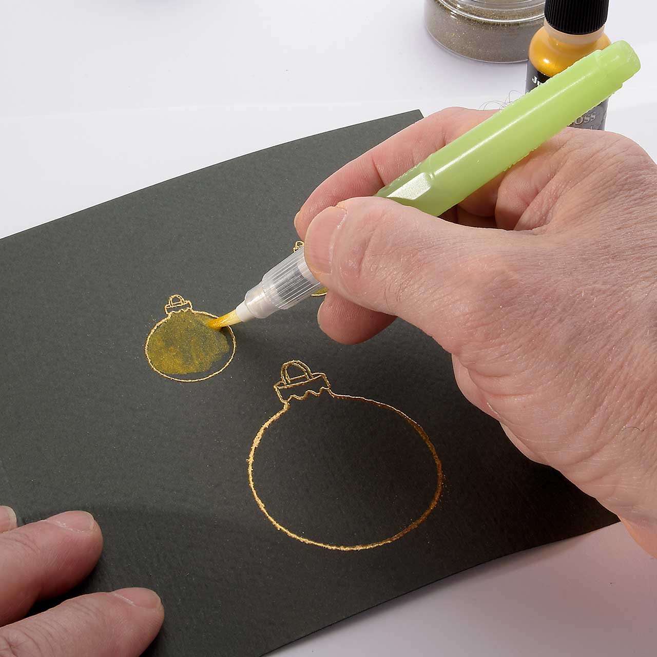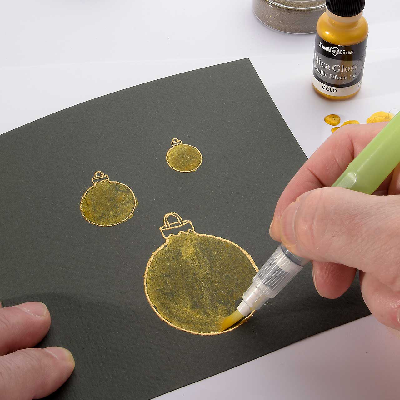Kolorieren Sie die drei Christbaumkugel Motive mit der goldenen Mica Gloss Farbe.