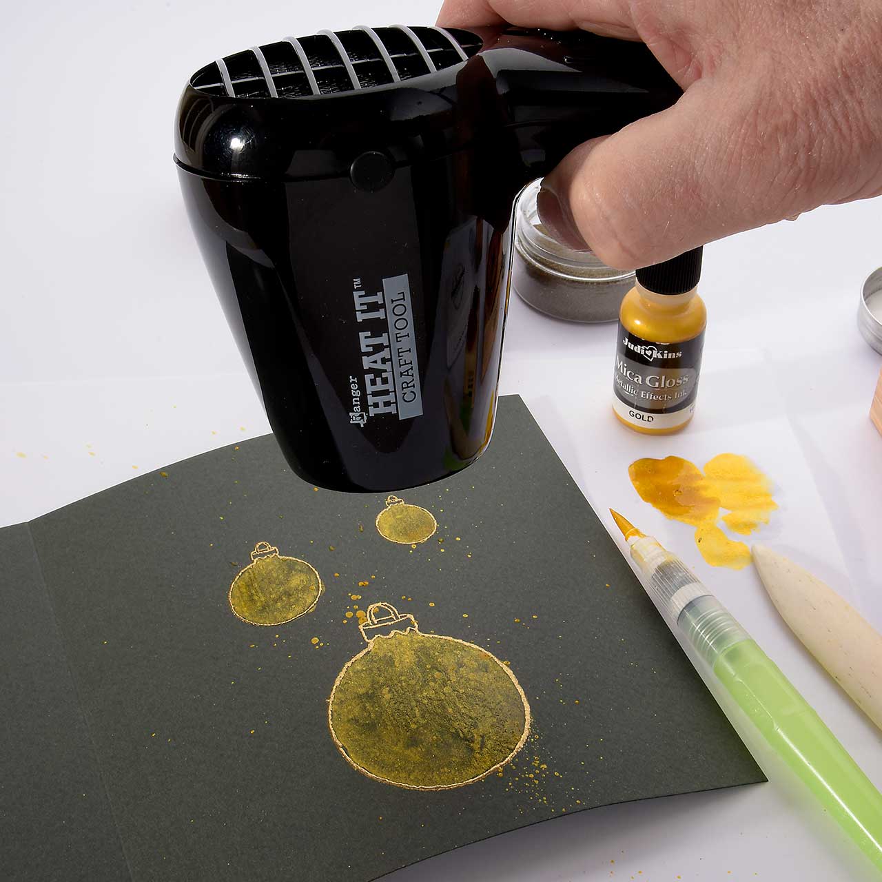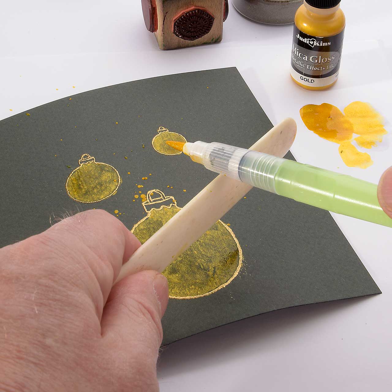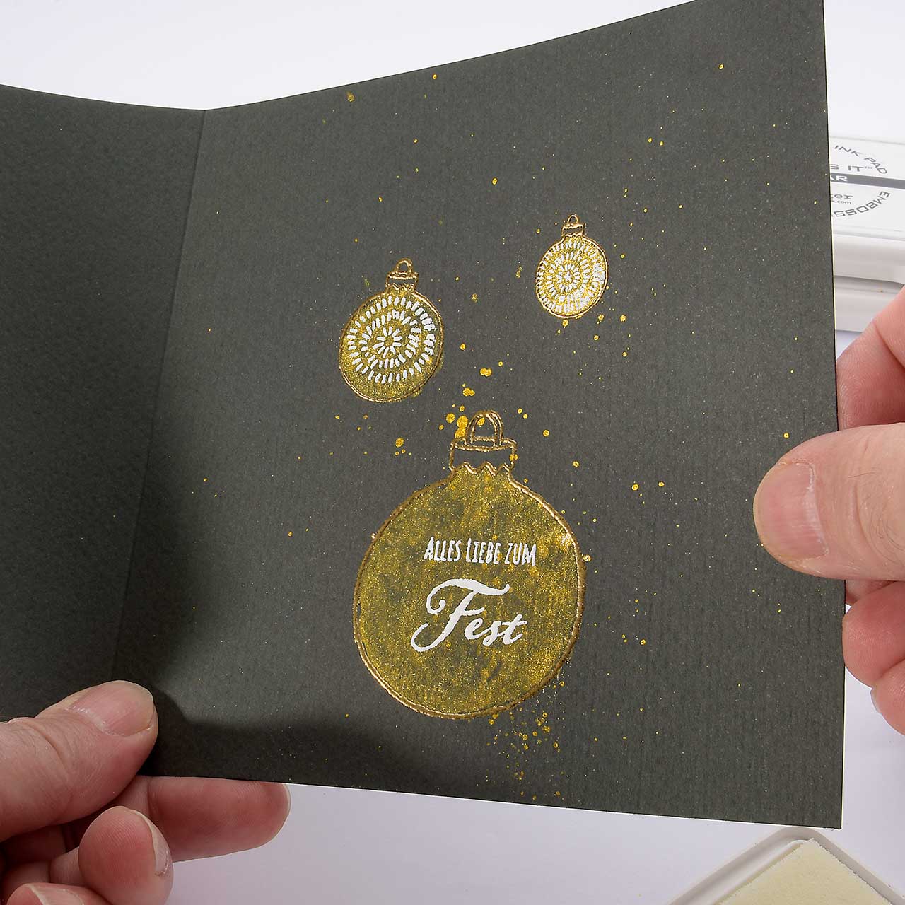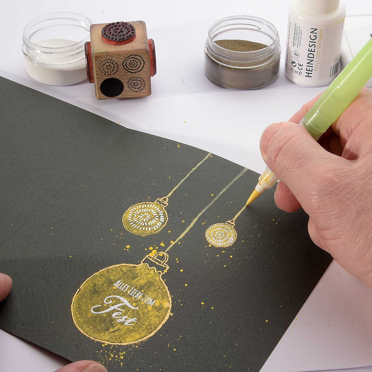 Kolorieren Sie die drei Christbaumkugel Motive mit der goldenen Mica Gloss Farbe.