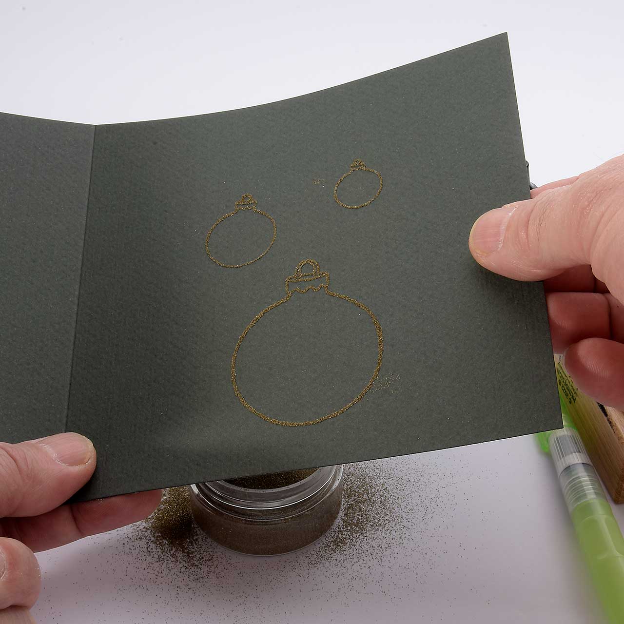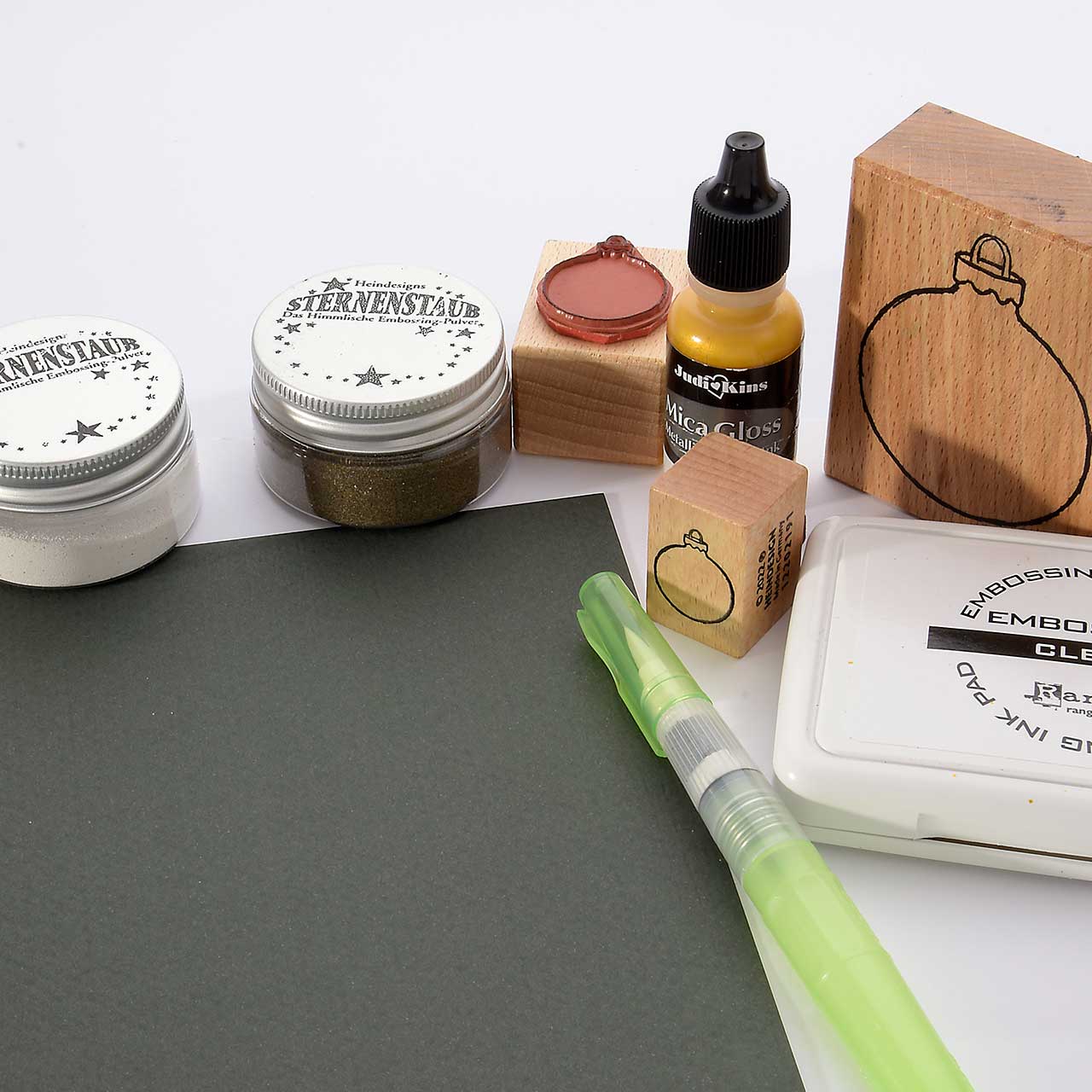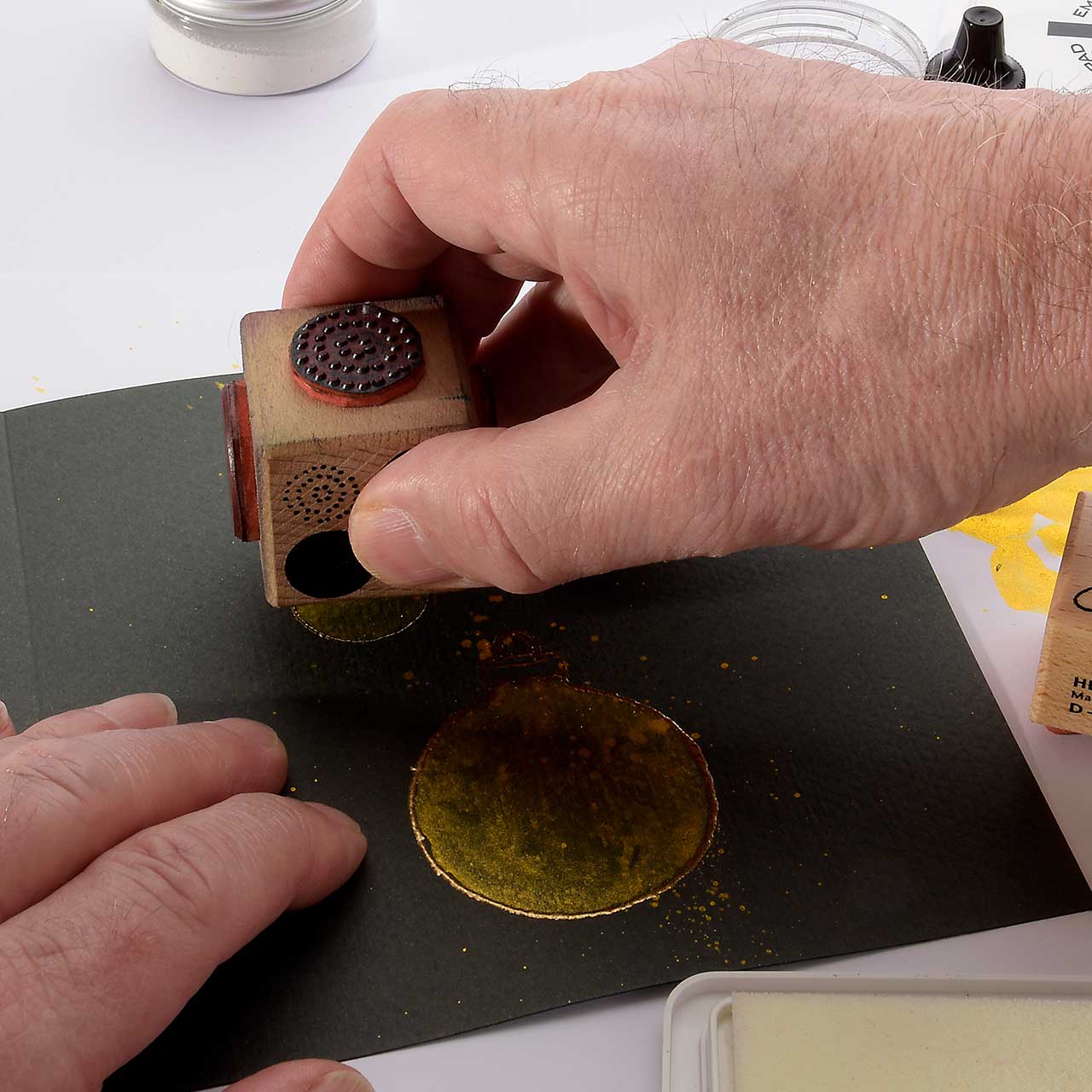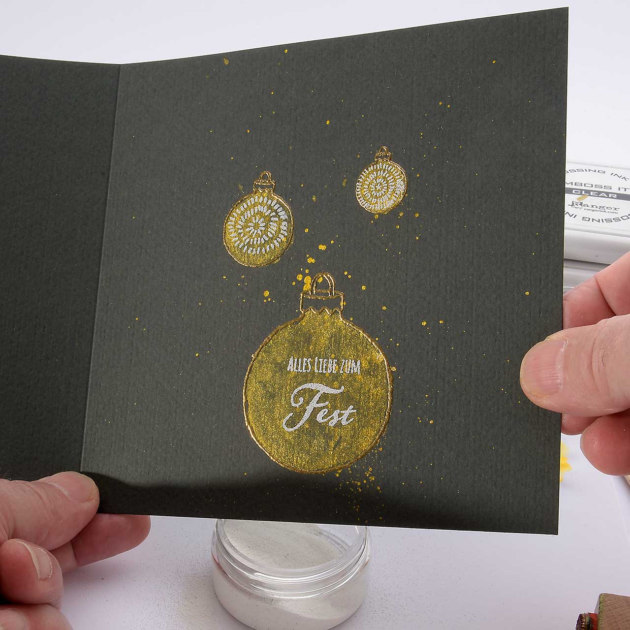 Stempeln Sie das kleine Christbaumkugel Motiv mit dem Ranger Emboss It Stempelkissen rechts oberhalb des ersten Abdrucks.