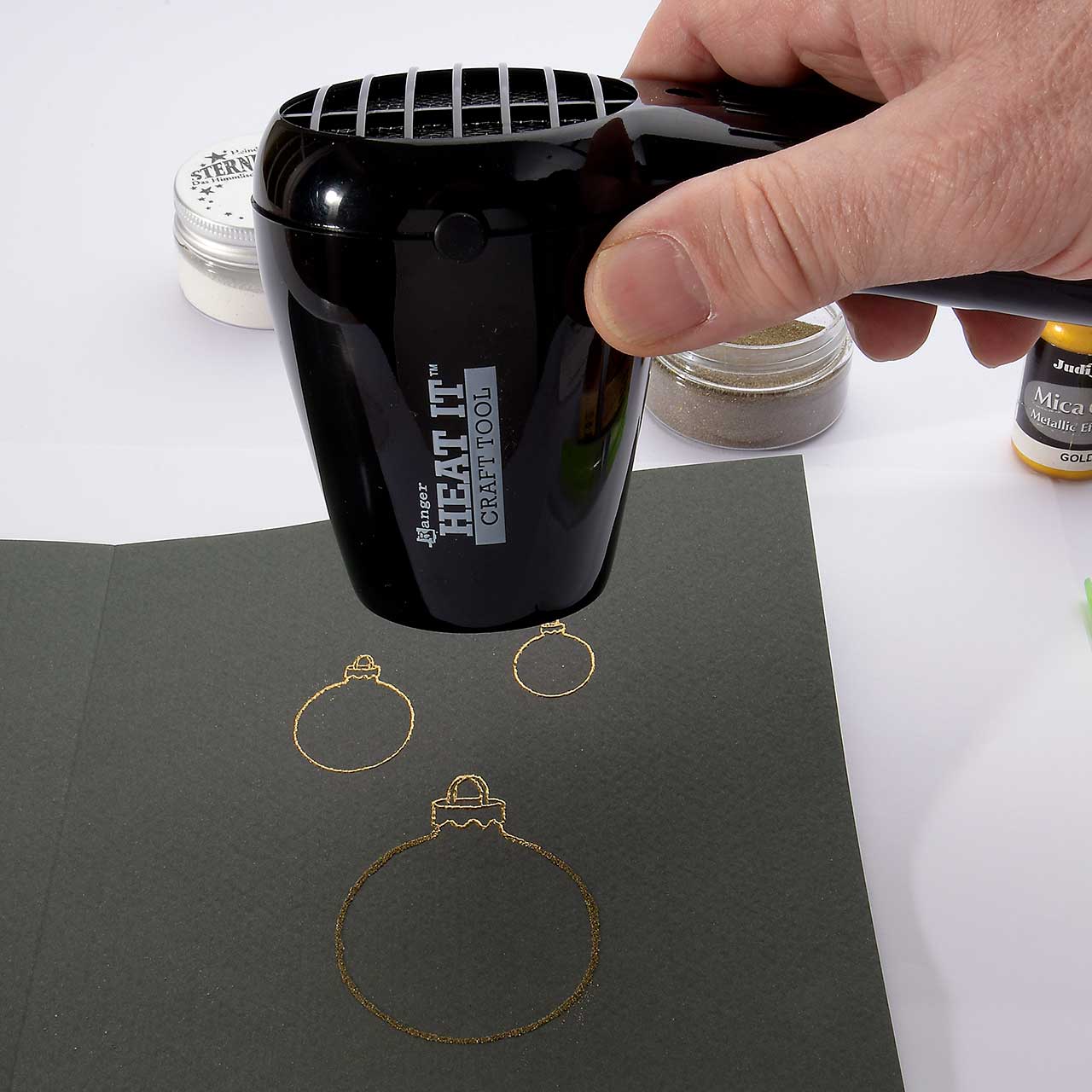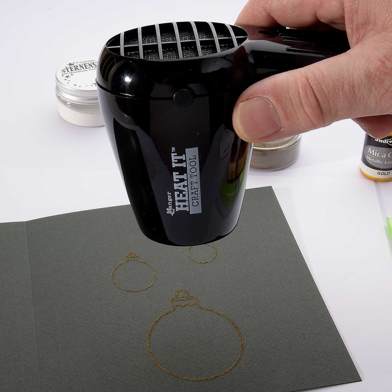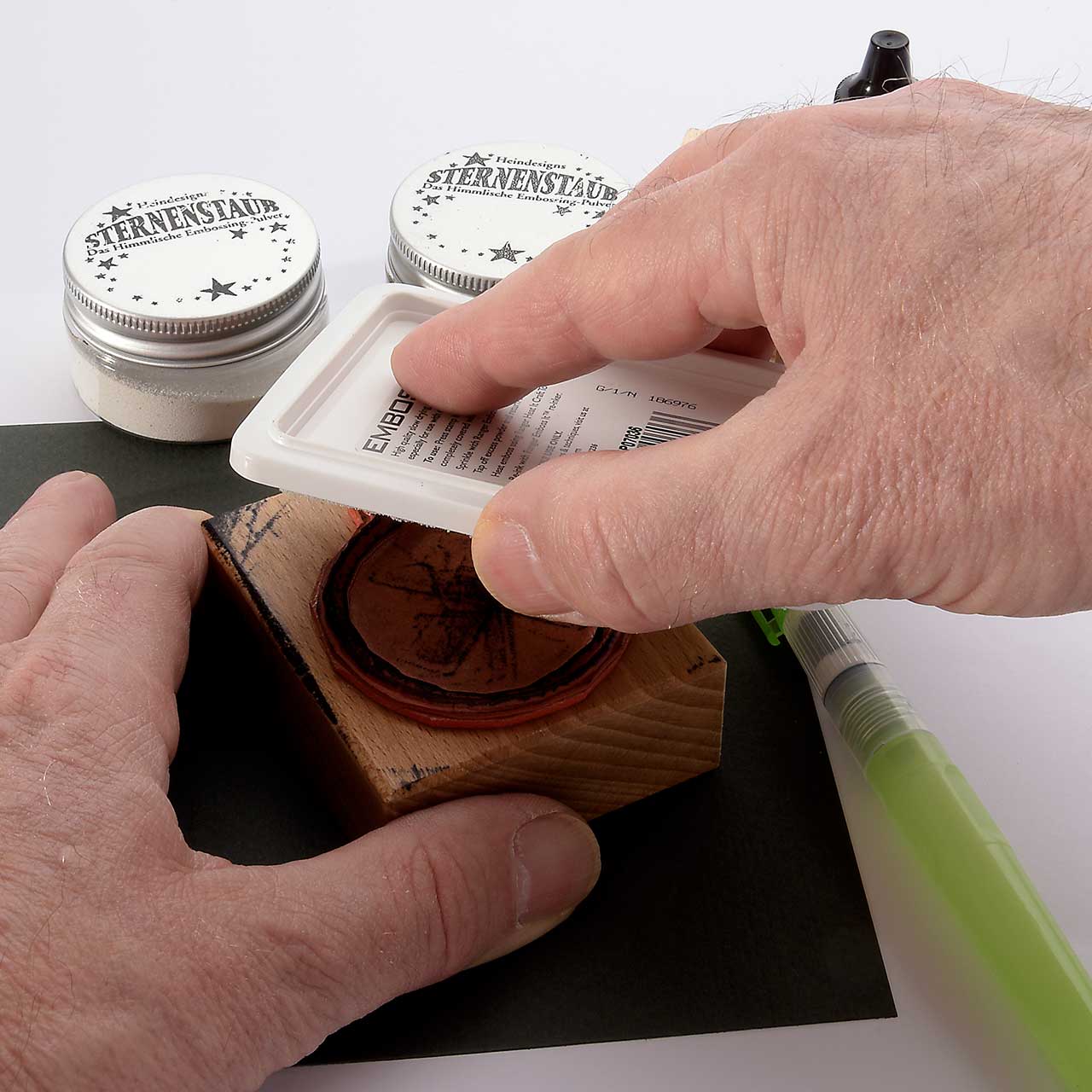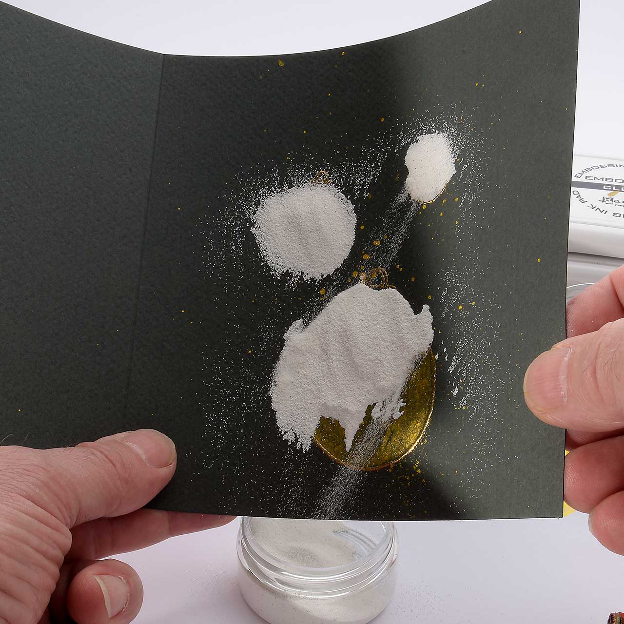 Stempeln Sie das kleine Christbaumkugel Motiv mit dem Ranger Emboss It Stempelkissen rechts oberhalb des ersten Abdrucks.