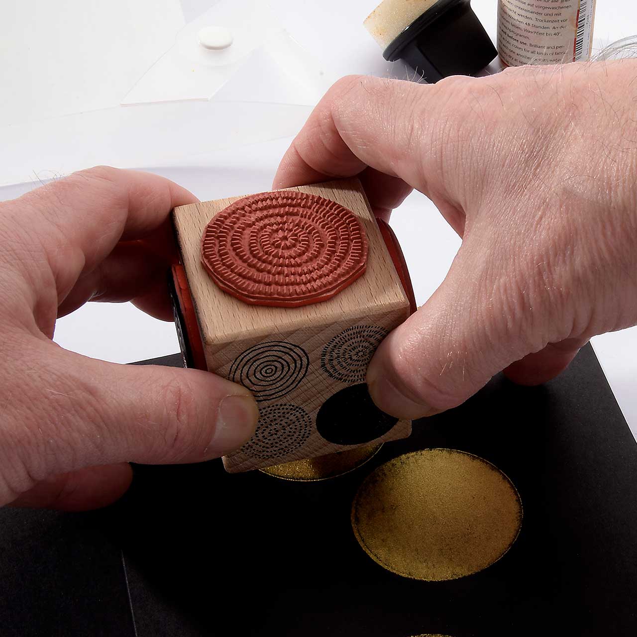Nehmen Sie mit einem Farbtupfer Schwämmchen goldene Stoffstempelfarbe auf und färben Sie den Kreisflächen Stempel ein.
