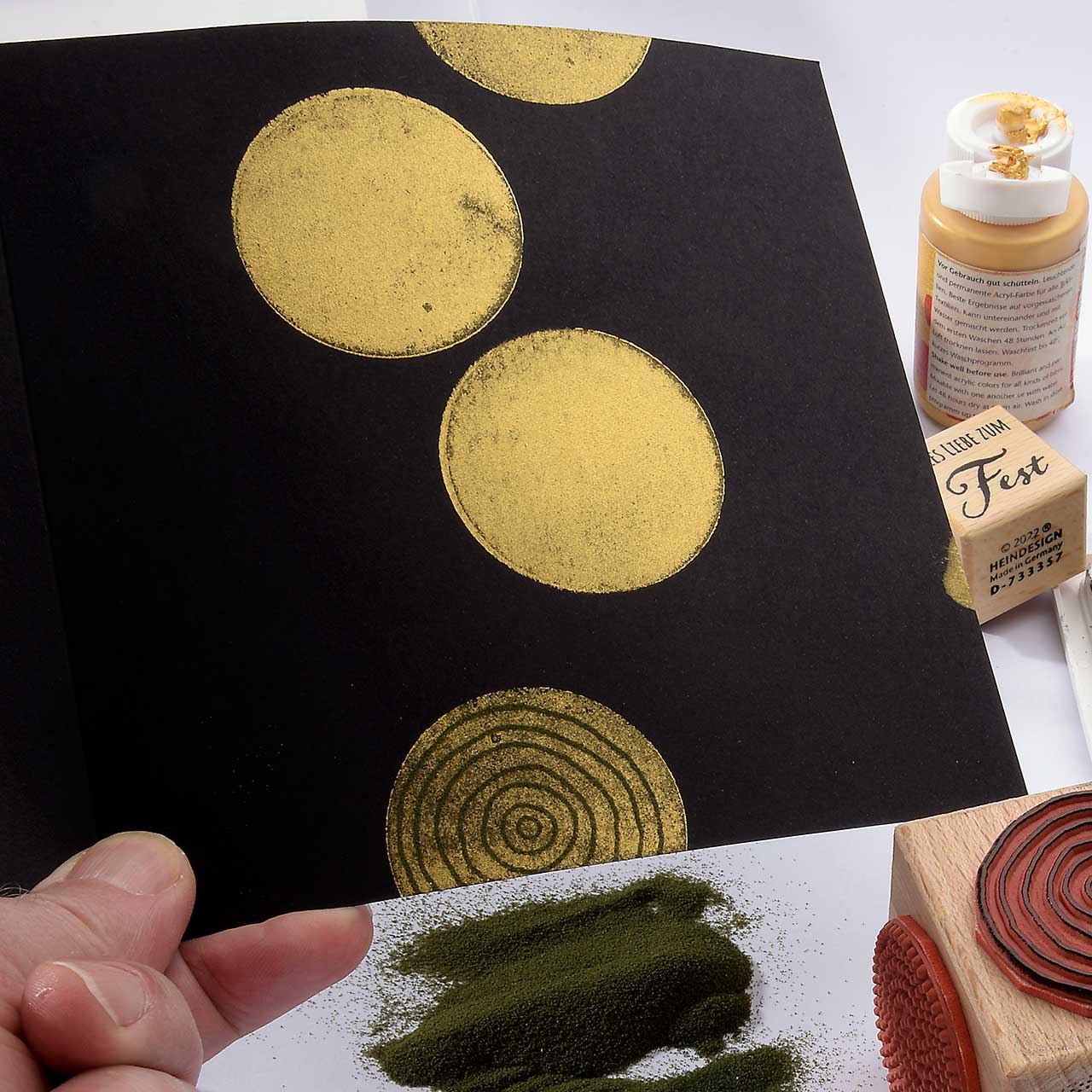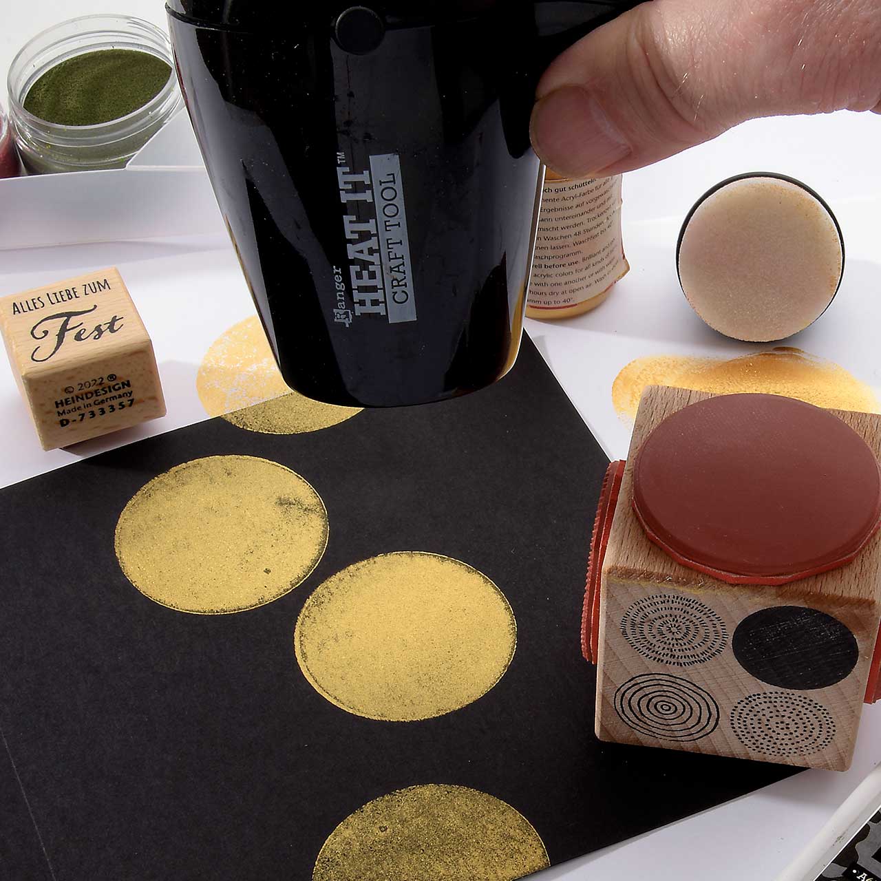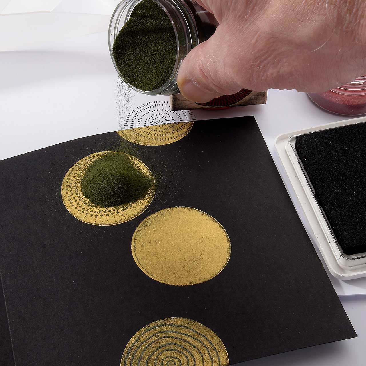Stempeln und embossen Sie die verschiedenen, gepunkteten und gestrichelten Kreismotive mit dem dunkelgrünen Sternenstaub. Verwenden Sie zum Stempeln das schwarze Pigment-Stempelkissen (durch die schwarze Farbe wirkt das grüne Embossing Pulver deutlich intensiver).
