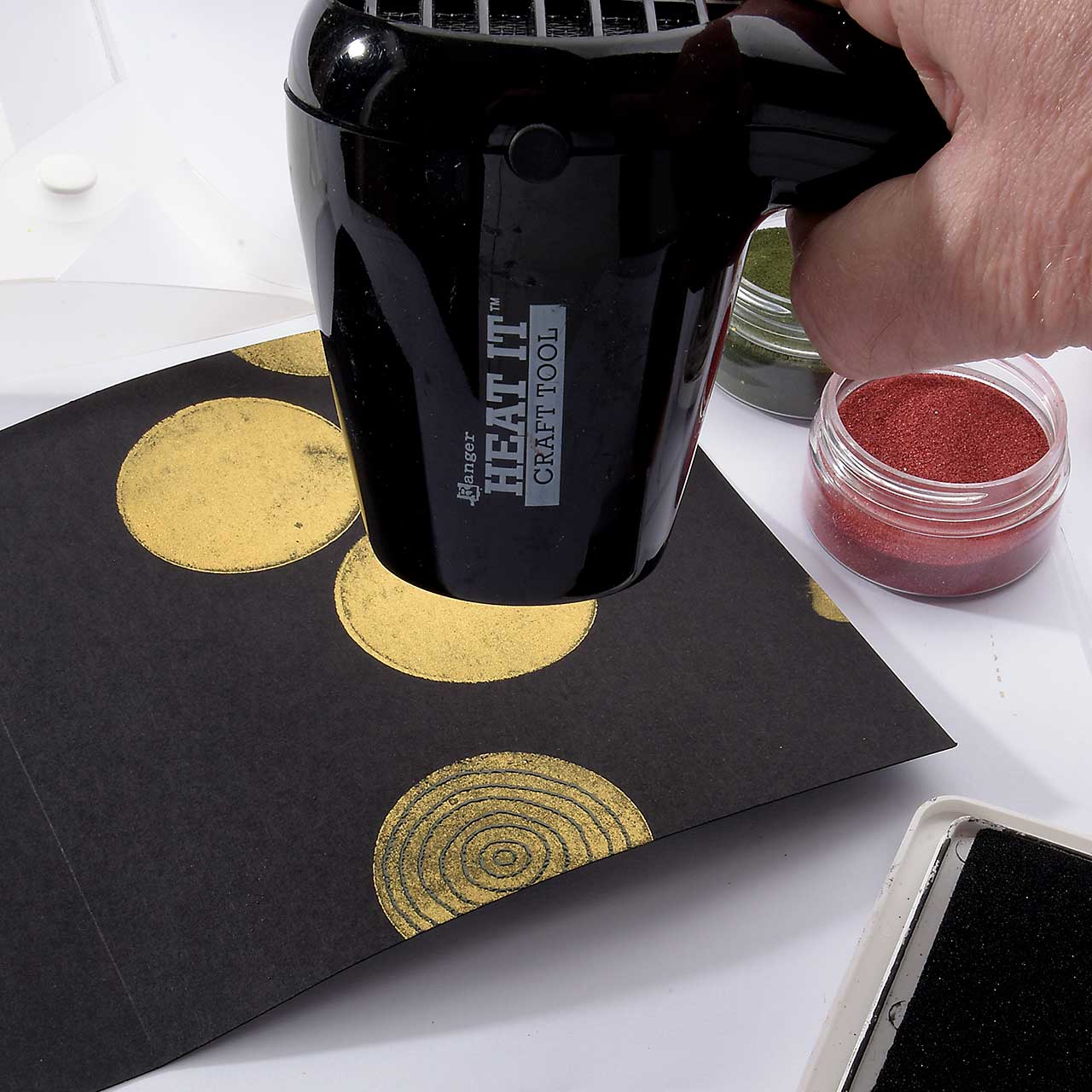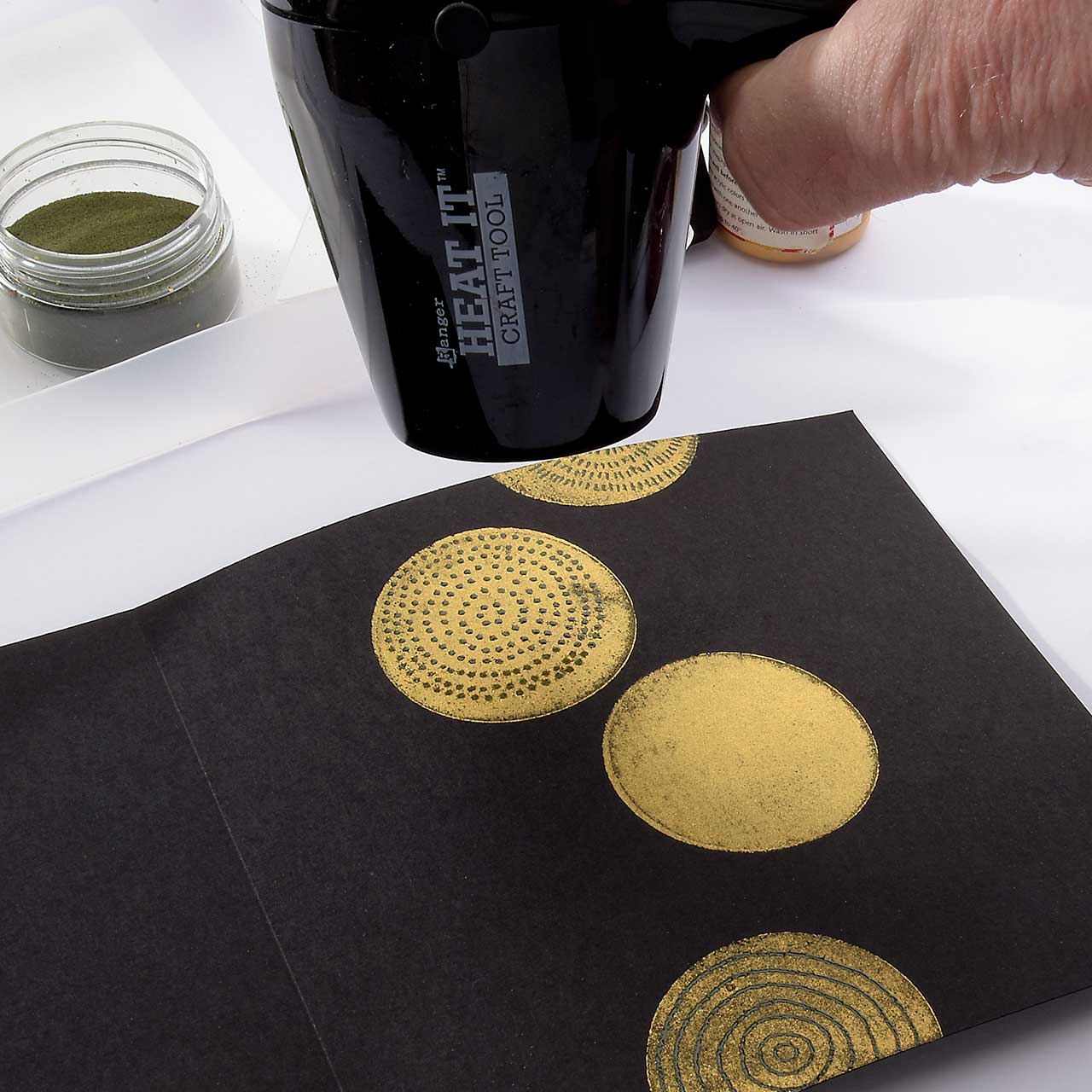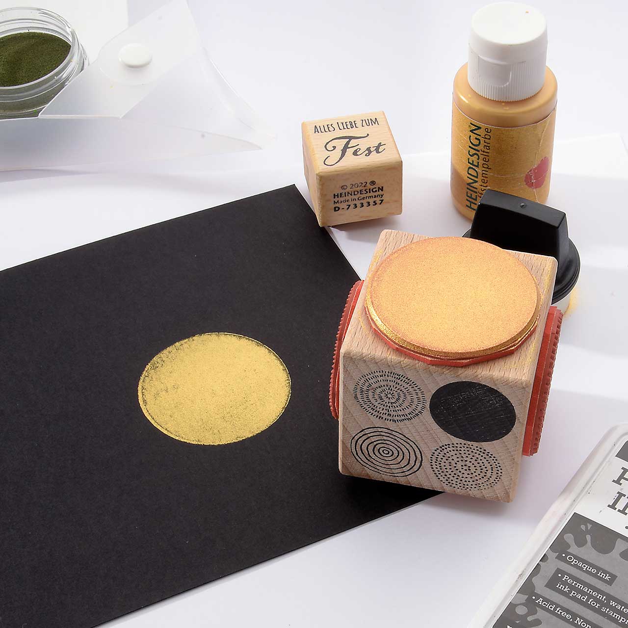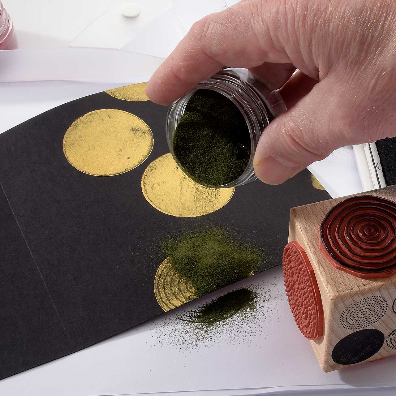 Stempeln und embossen Sie die verschiedenen, gepunkteten und gestrichelten Kreismotive mit dem dunkelgrünen Sternenstaub. Verwenden Sie zum Stempeln das schwarze Pigment-Stempelkissen (durch die schwarze Farbe wirkt das grüne Embossing Pulver deutlich intensiver).