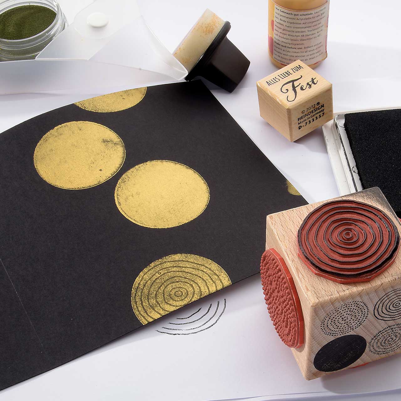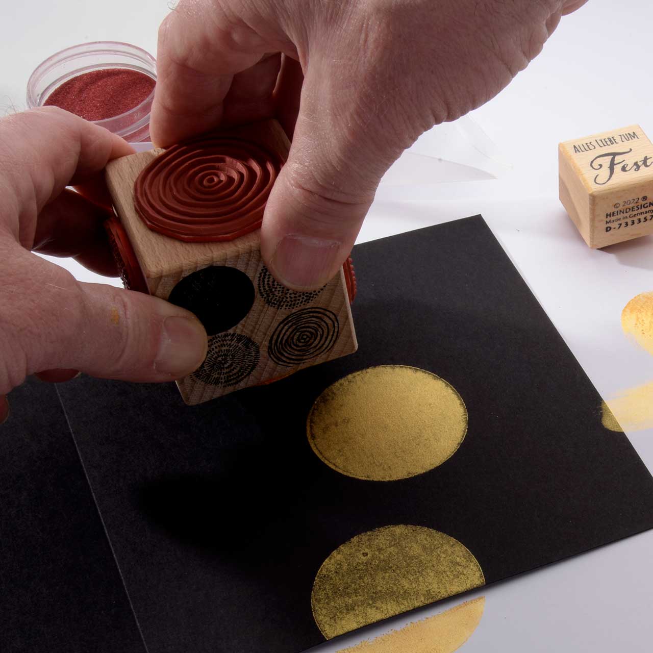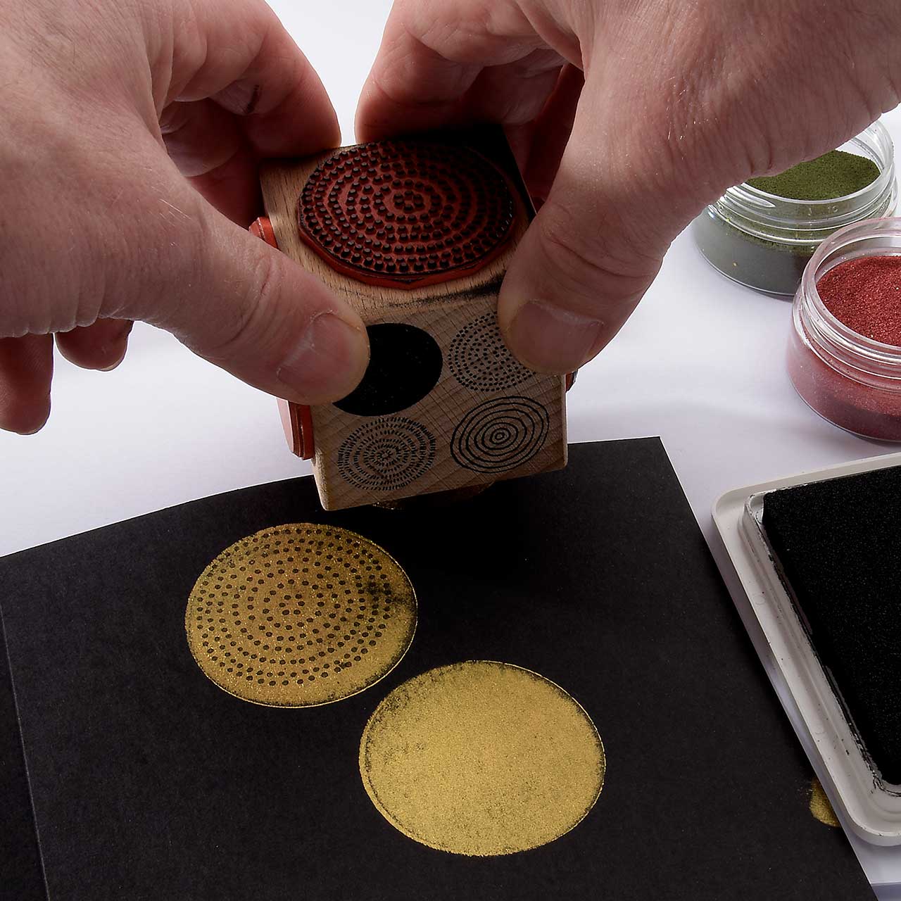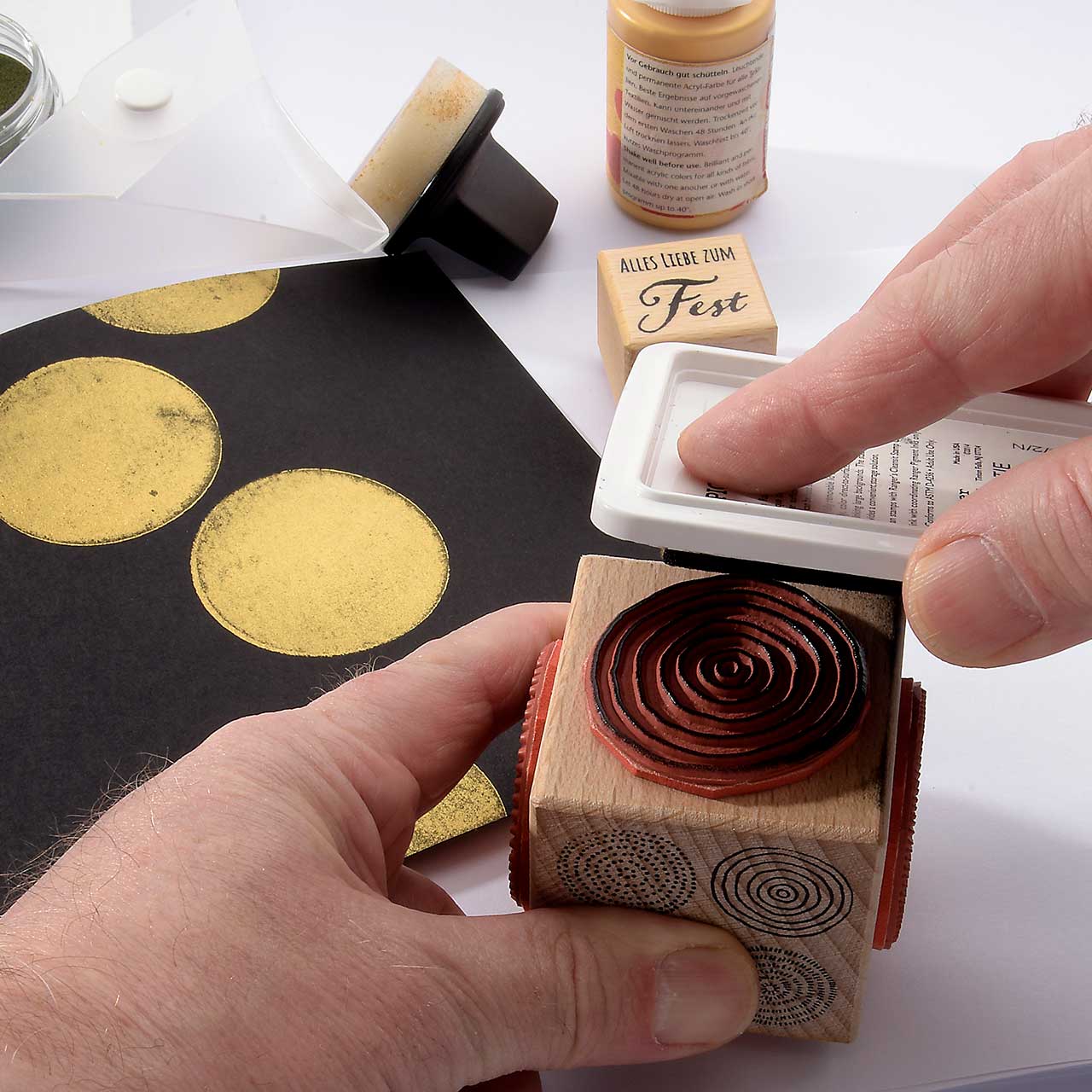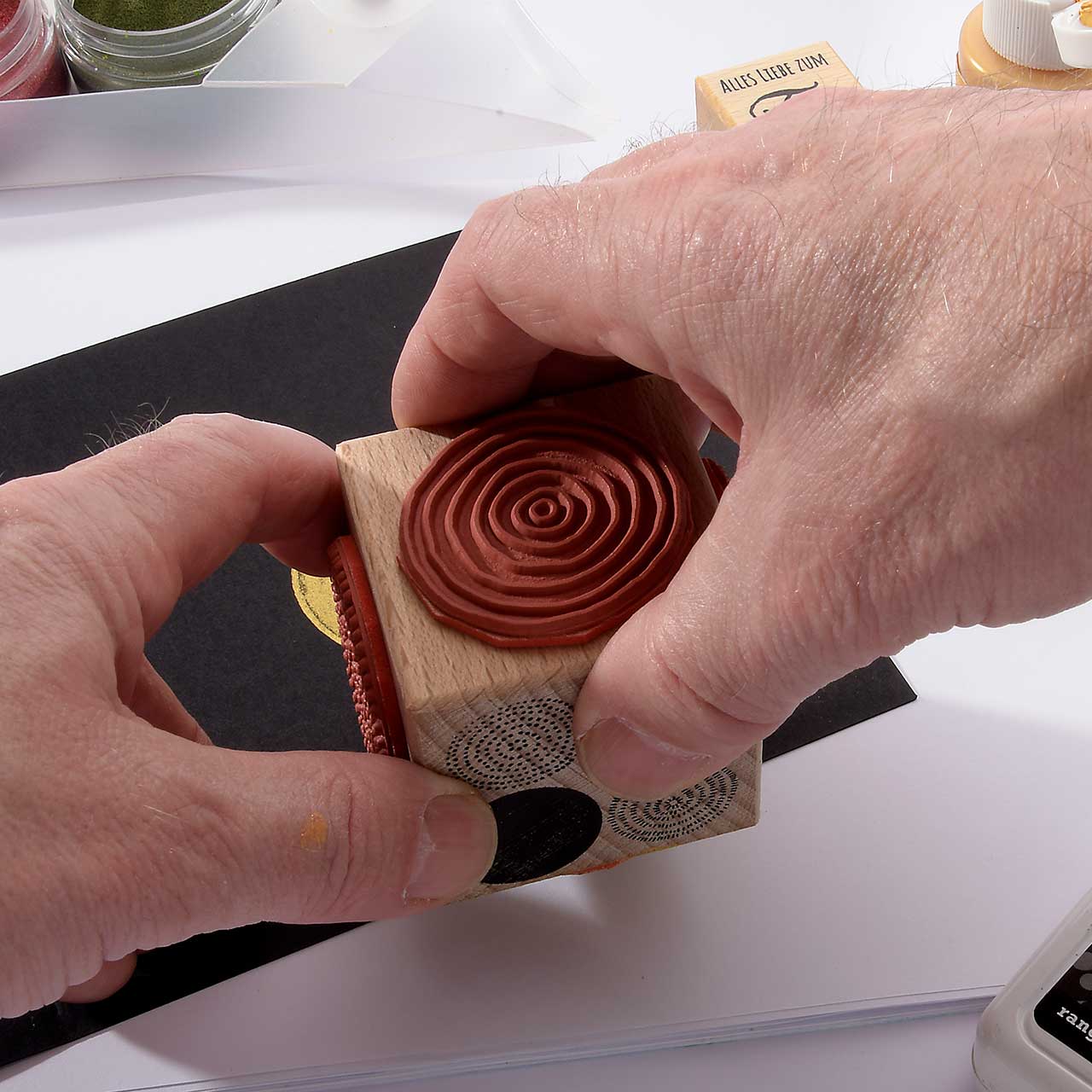 Färben Sie den Stempel wieder ein und stempeln Sie das Motiv mehrere male ober- und unterhalb des ersten Kreis Motivs. Für ein gleichmäßiges Druckbild färben Sie den Stempel vor jedem Abdruck erneut ein.