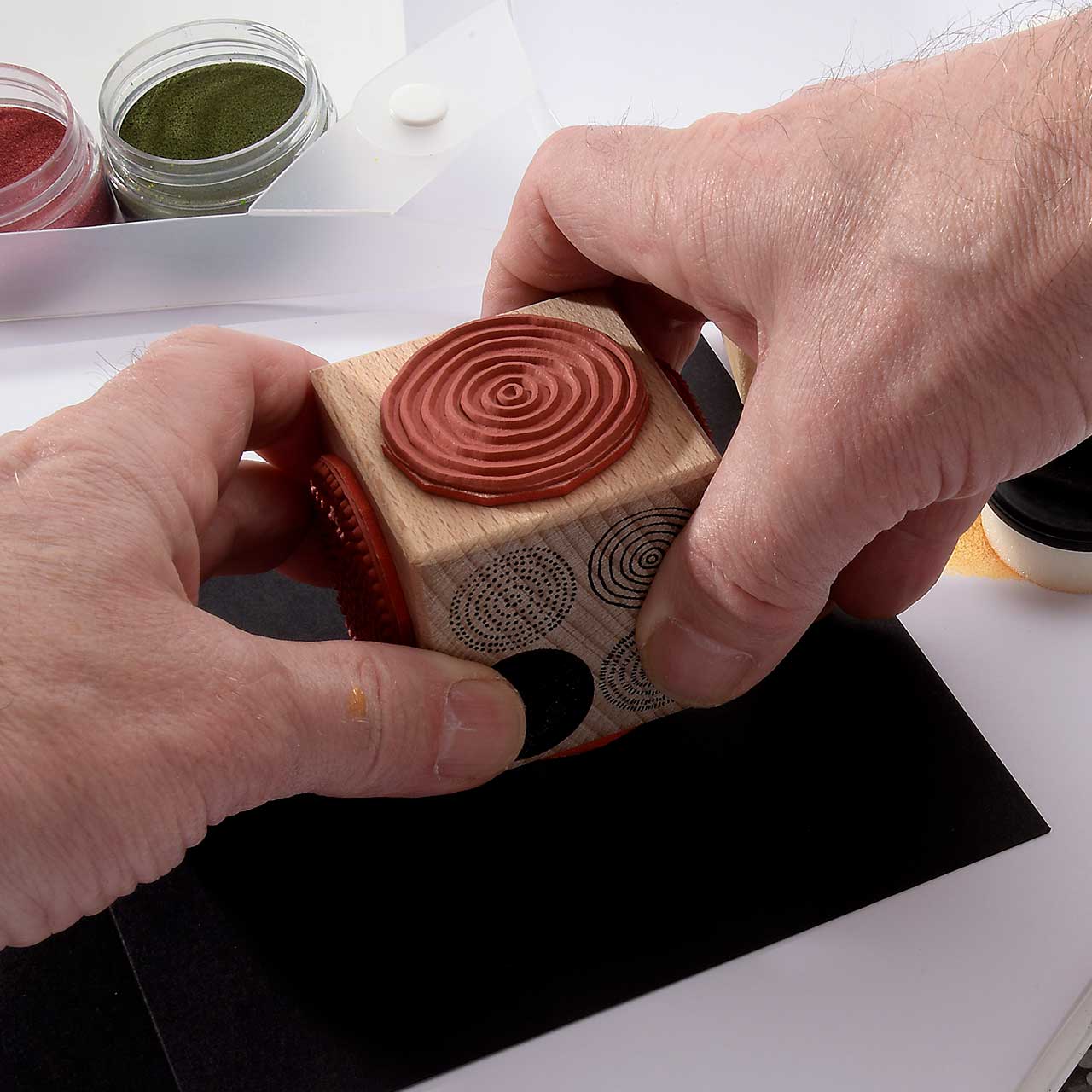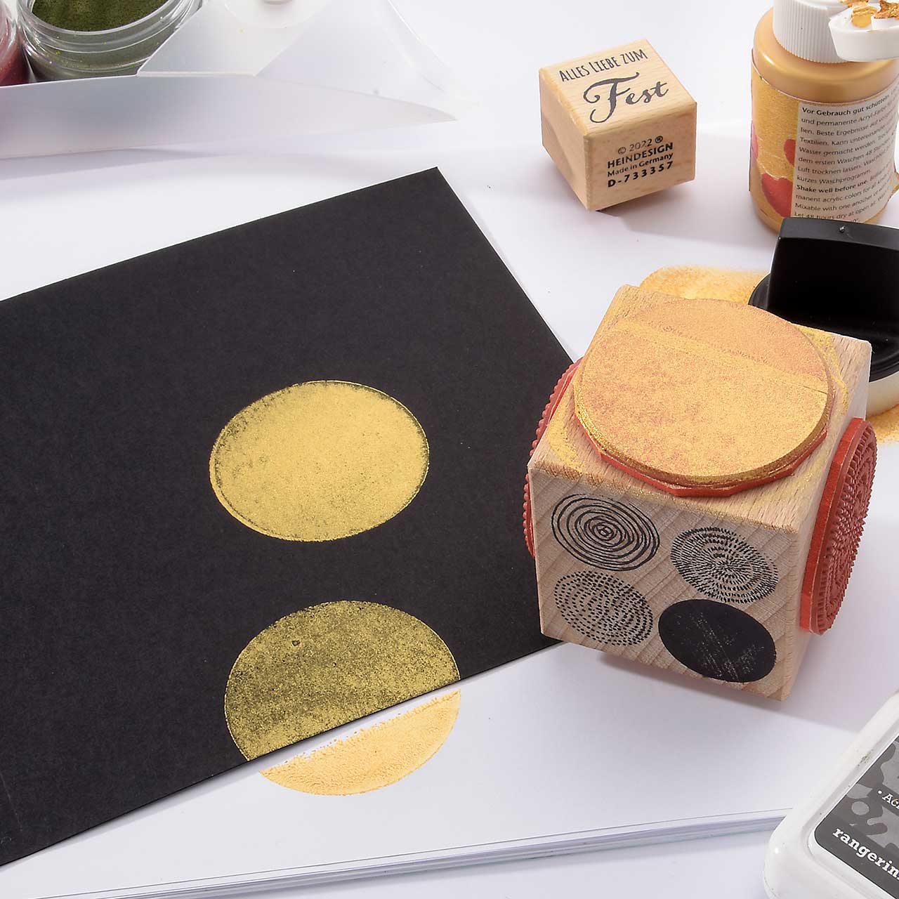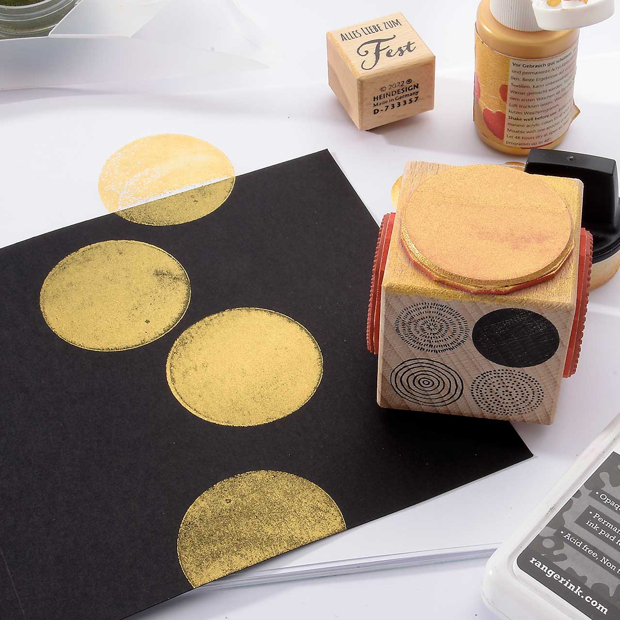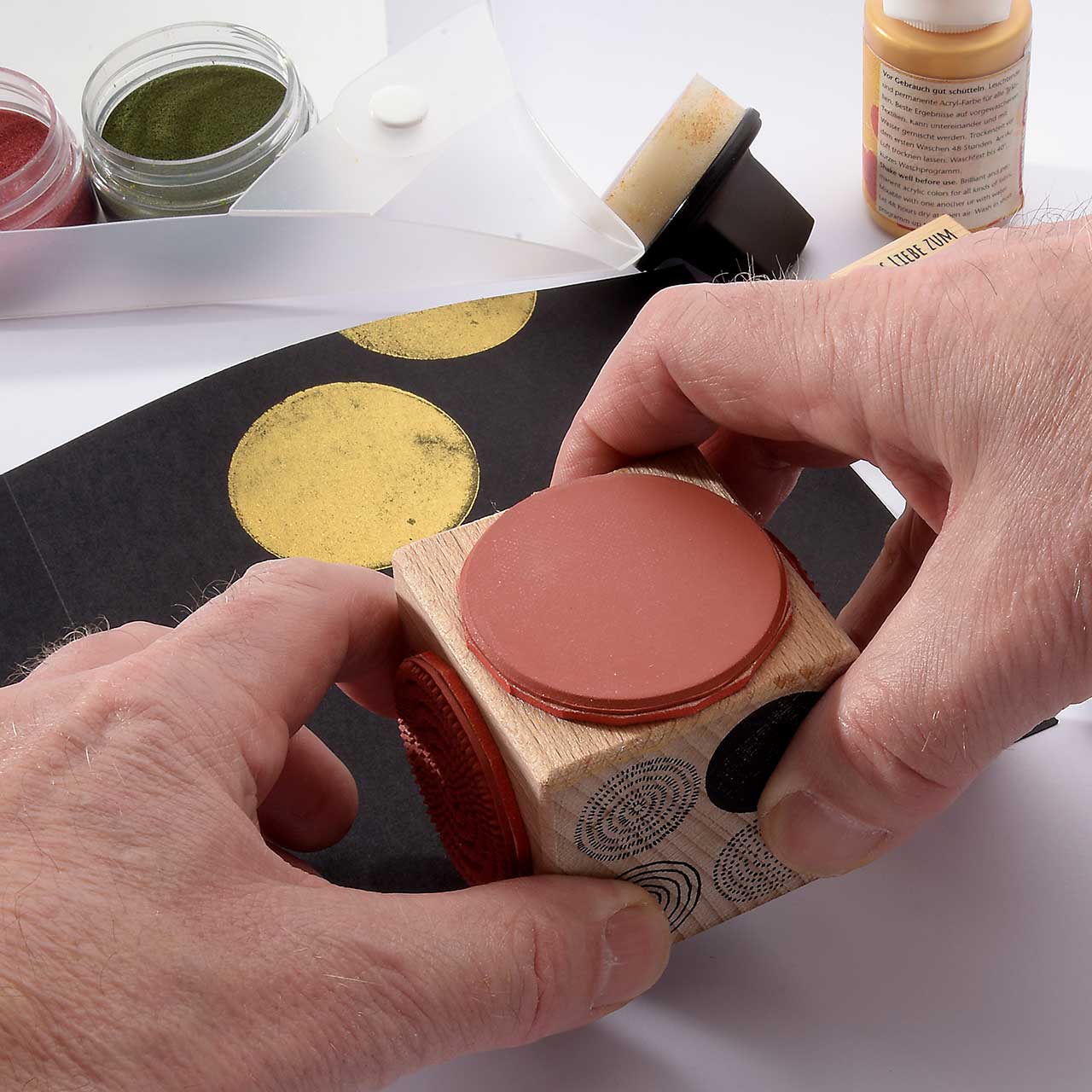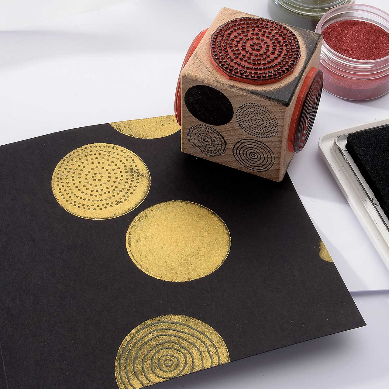 Färben Sie den Stempel wieder ein und stempeln Sie das Motiv mehrere male ober- und unterhalb des ersten Kreis Motivs. Für ein gleichmäßiges Druckbild färben Sie den Stempel vor jedem Abdruck erneut ein.
