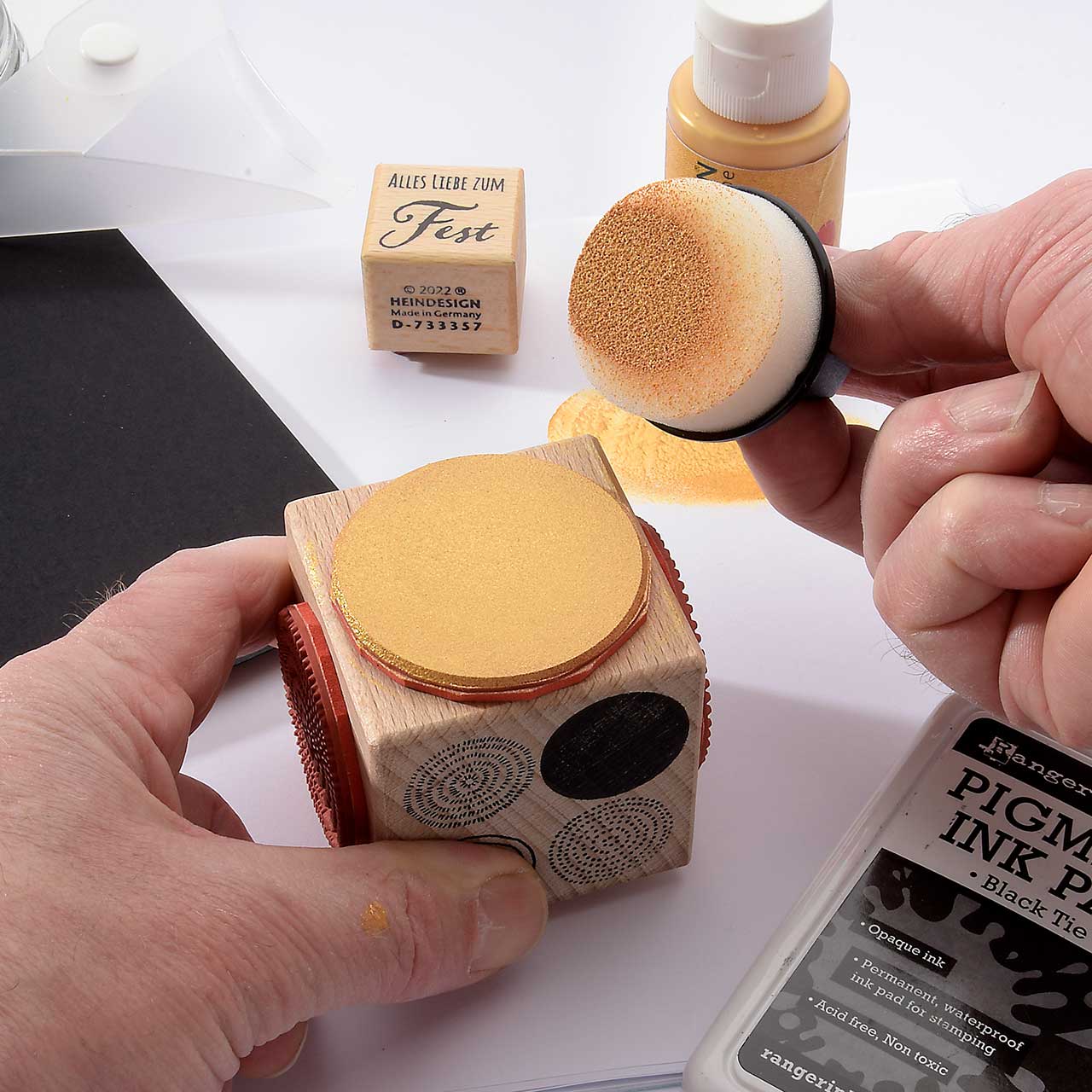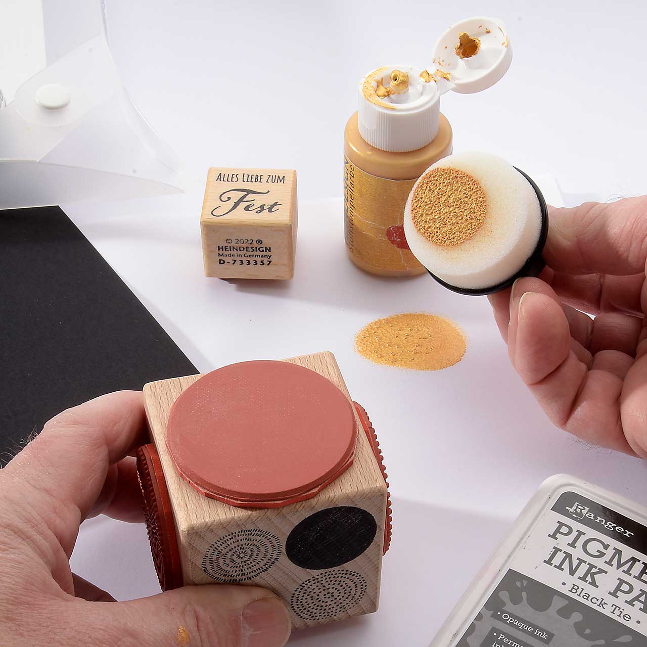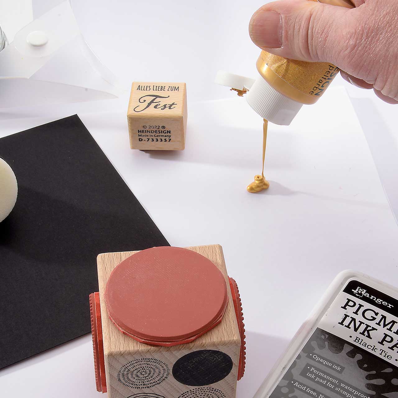 Reinigen Sie den Stempel und das Schwämmchen mit reichlich Wasser.