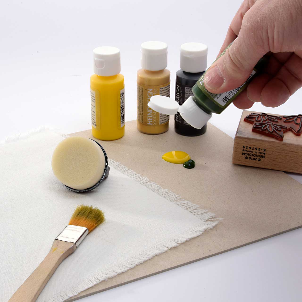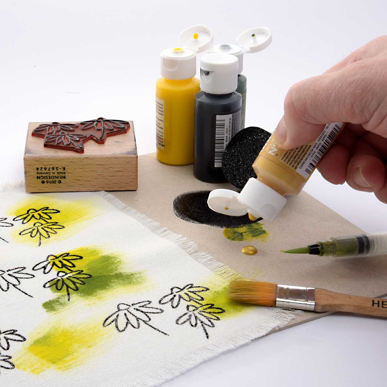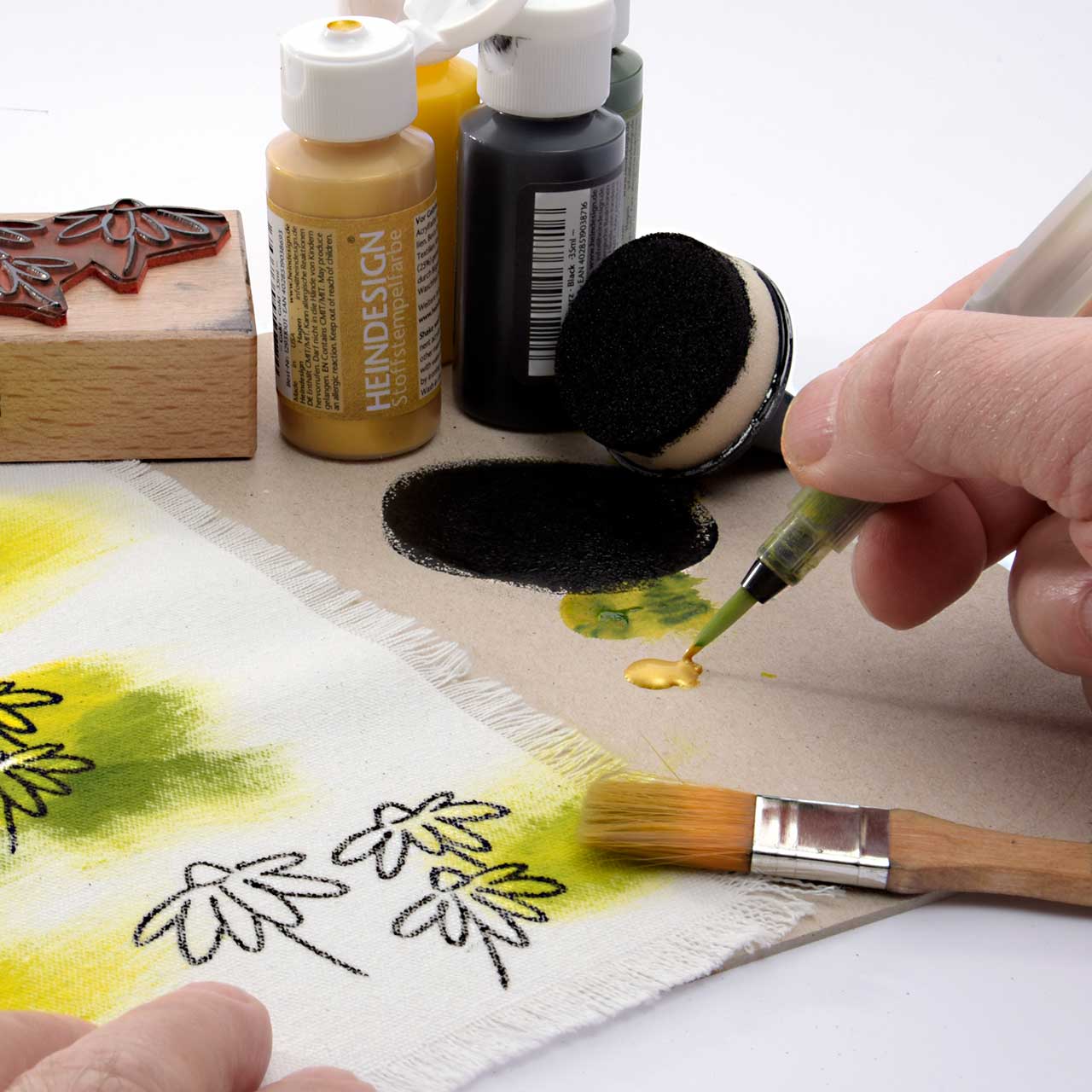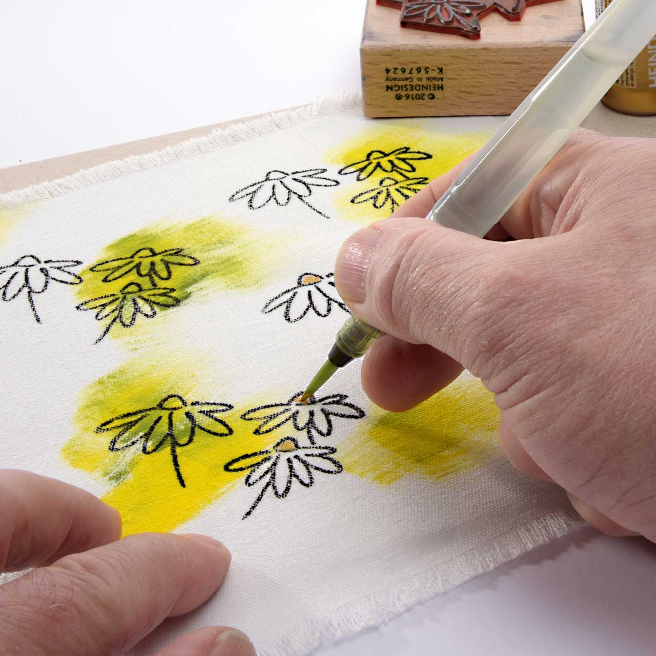 Kolorieren Sie das Margeriten Motiv mit einem feineren Pinsel und der goldenen Stoffstempelfarbe.