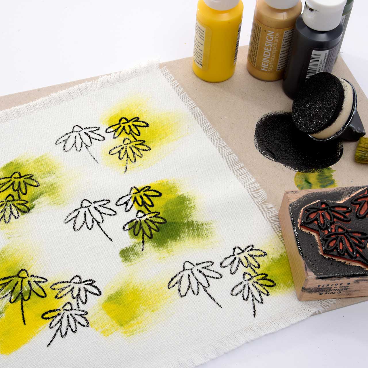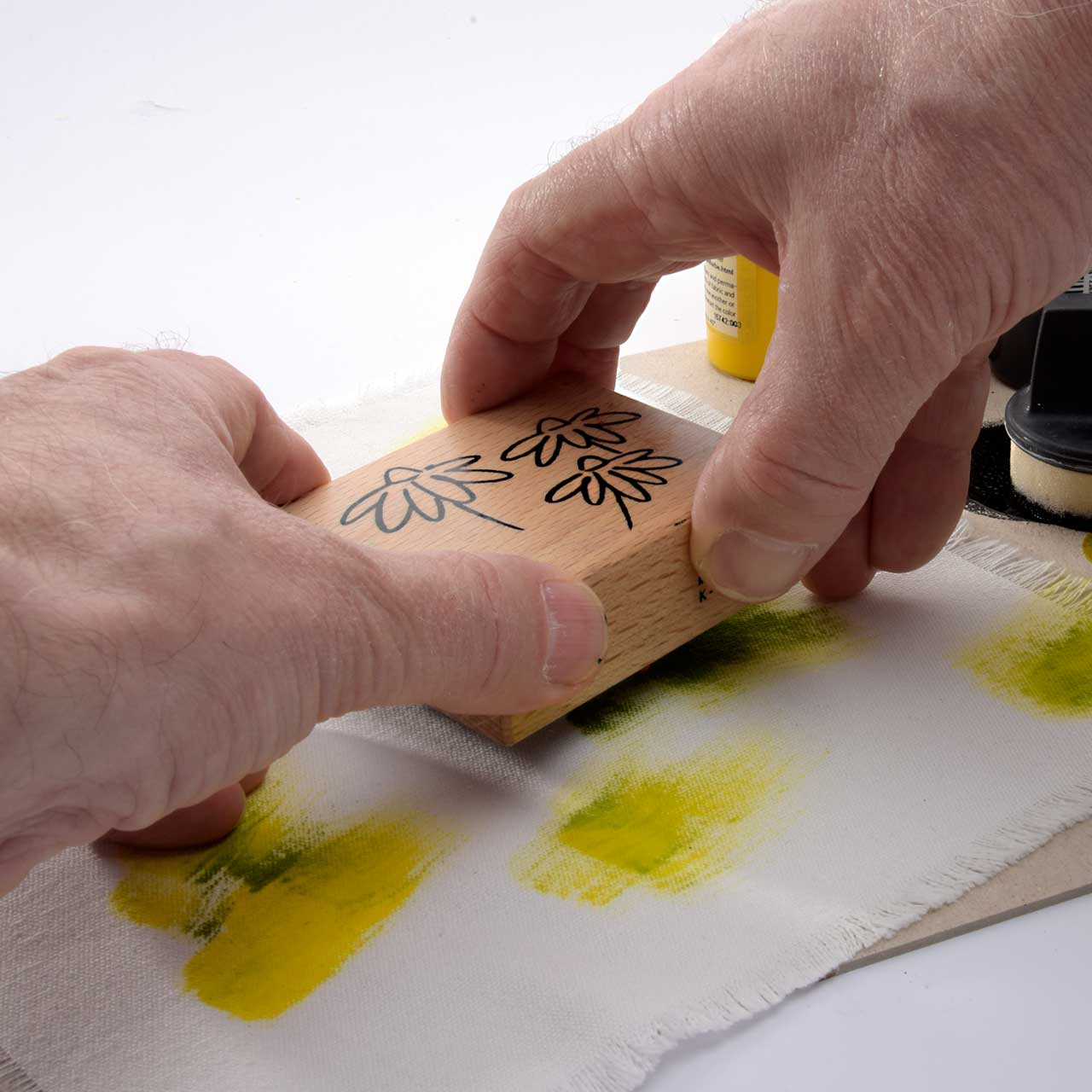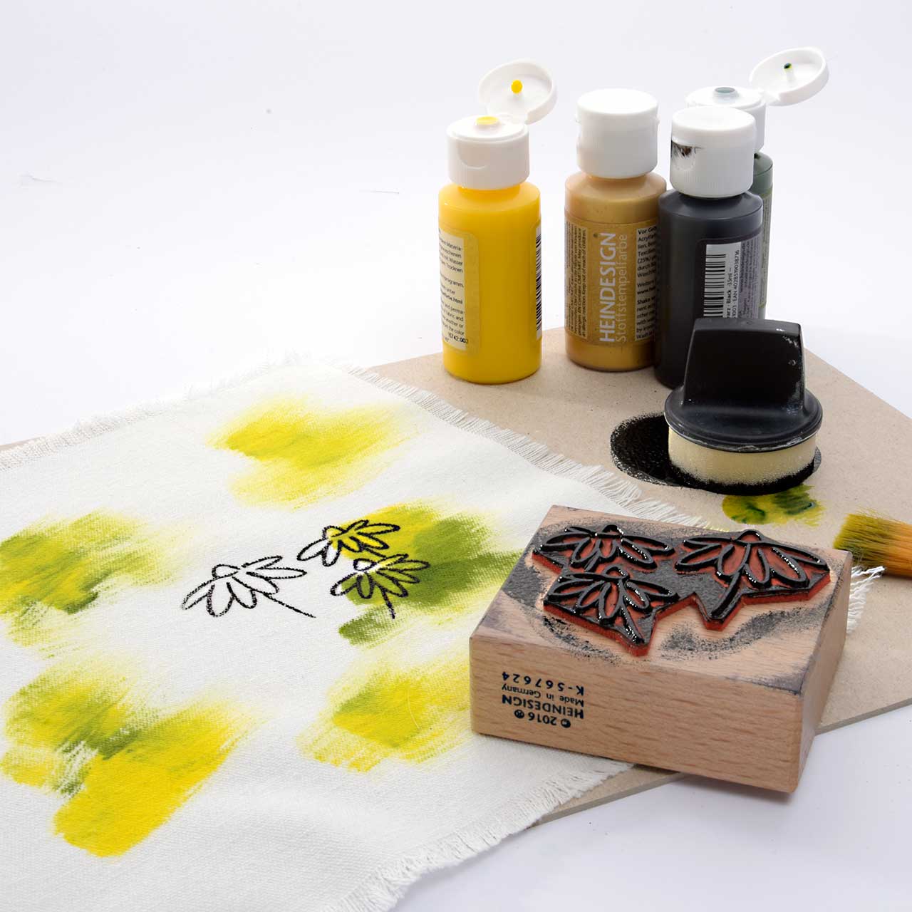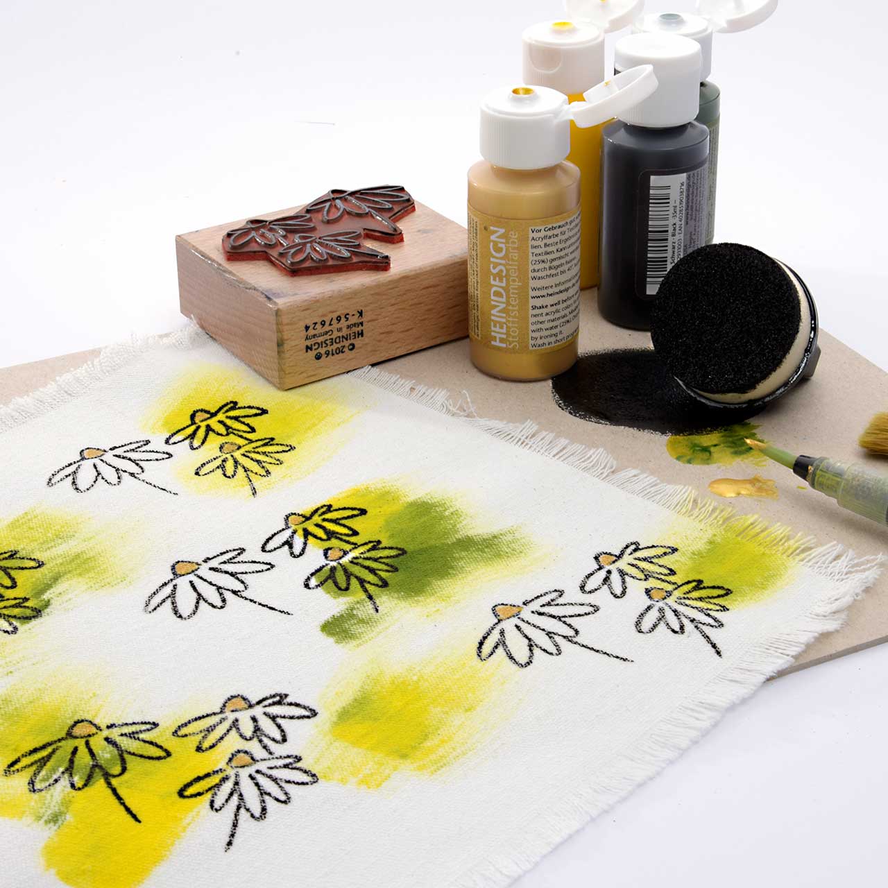 Färben Sie den Margeriten Stempel mit dem Schwämmchen ein und stempeln Sie das Motiv mehrmals auf ihr Tuch. Für ein gleichmäßiges Druckbild färben Sie den Stempel vor jedem Abdruck erneut ein.