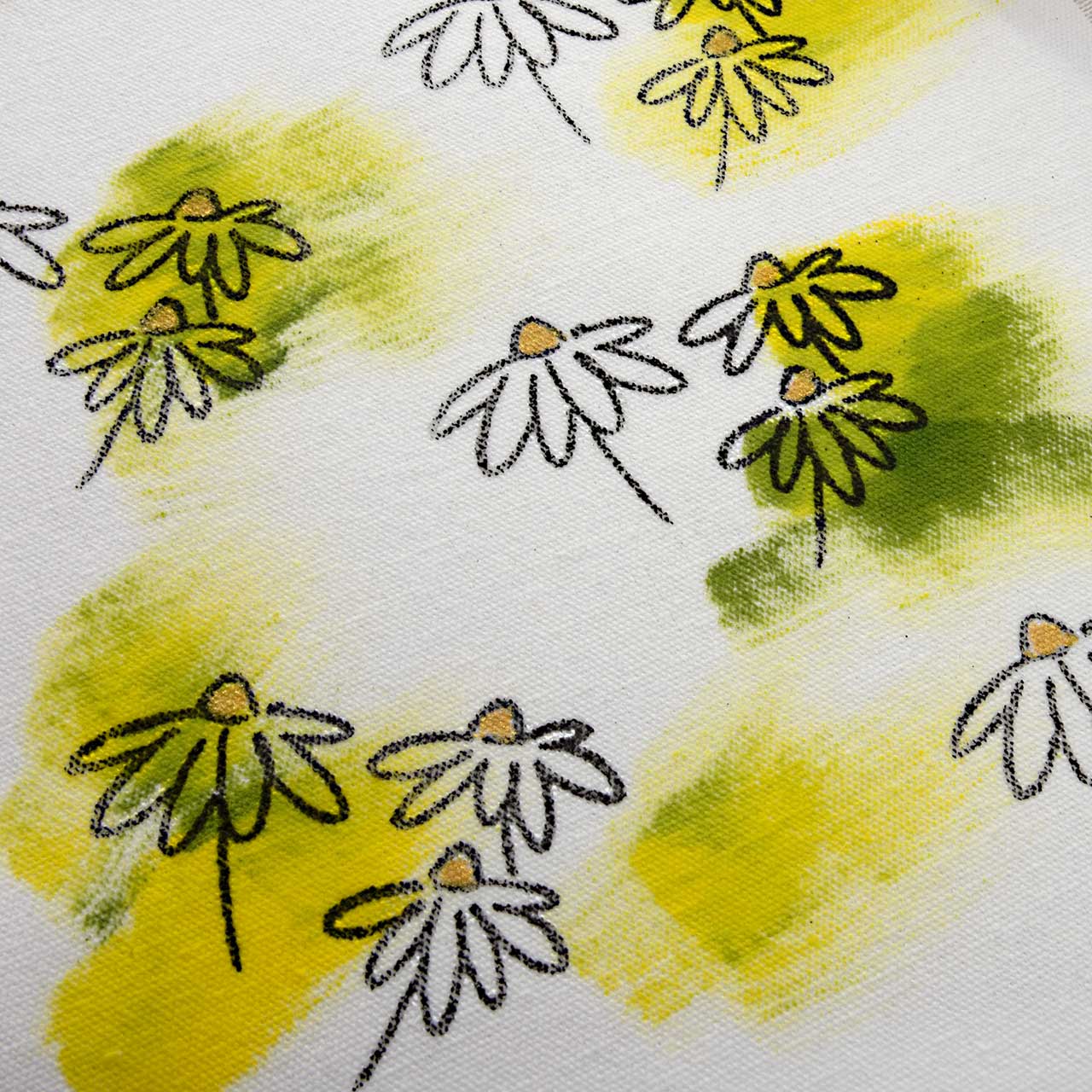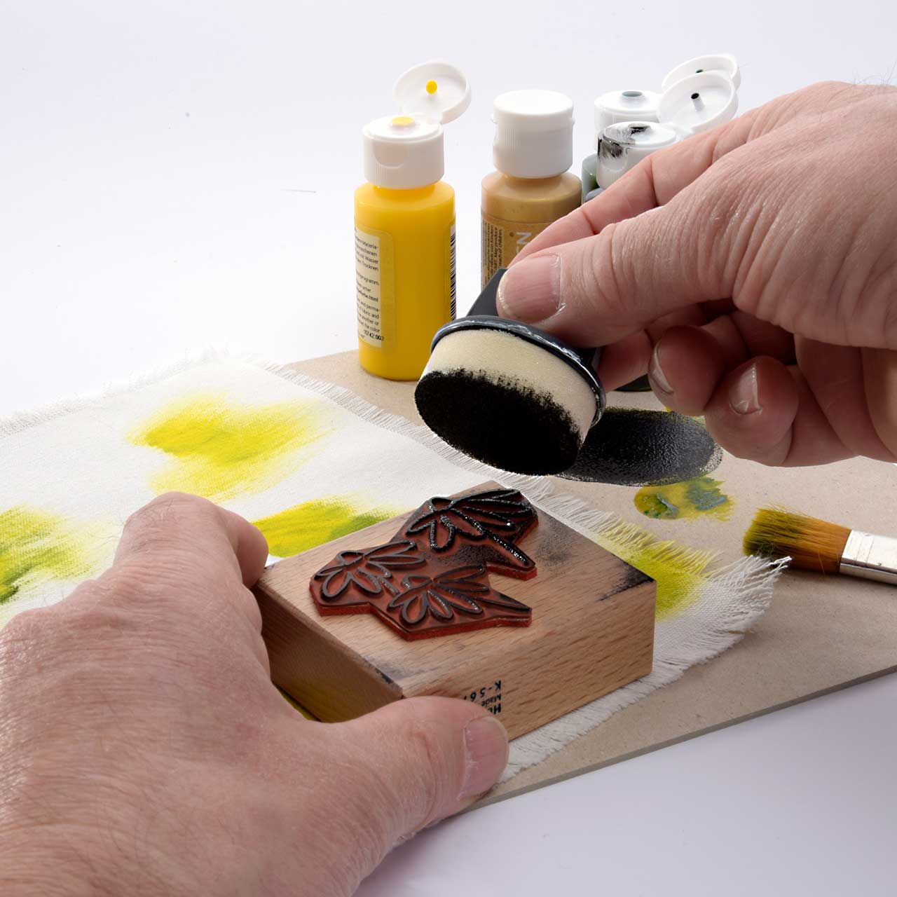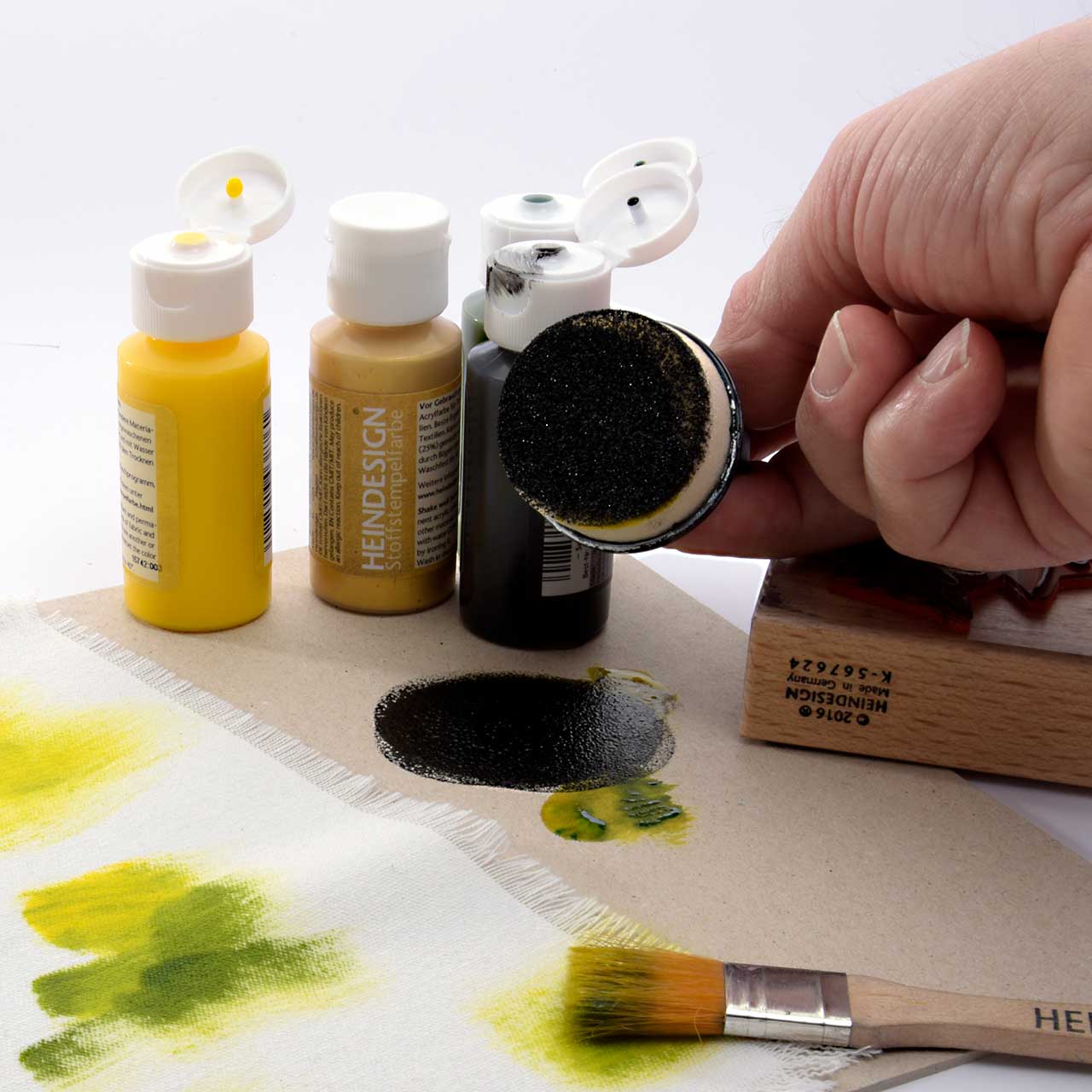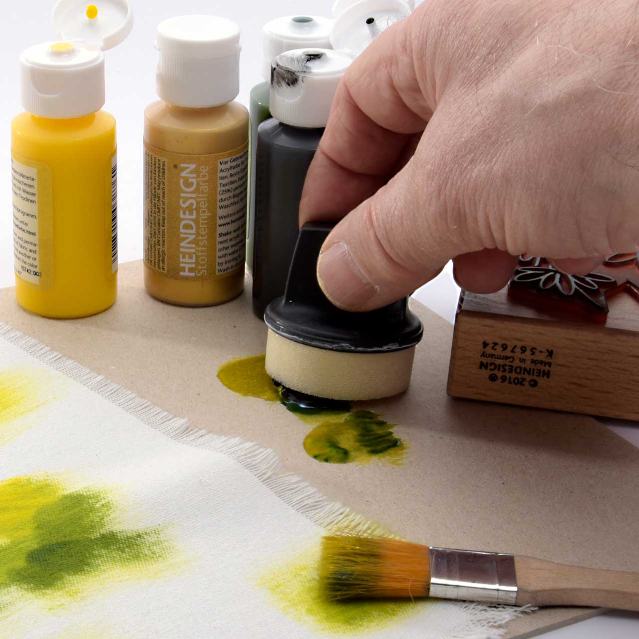 Färben Sie den Margeriten Stempel mit dem Schwämmchen ein und stempeln Sie das Motiv mehrmals auf ihr Tuch. Für ein gleichmäßiges Druckbild färben Sie den Stempel vor jedem Abdruck erneut ein.