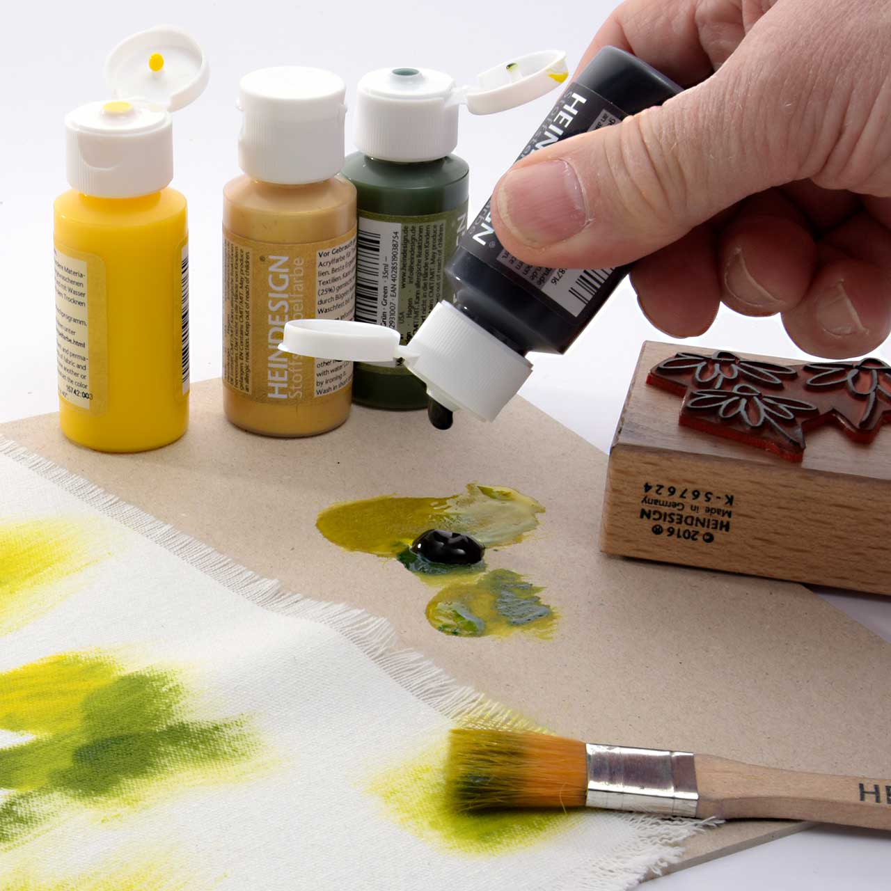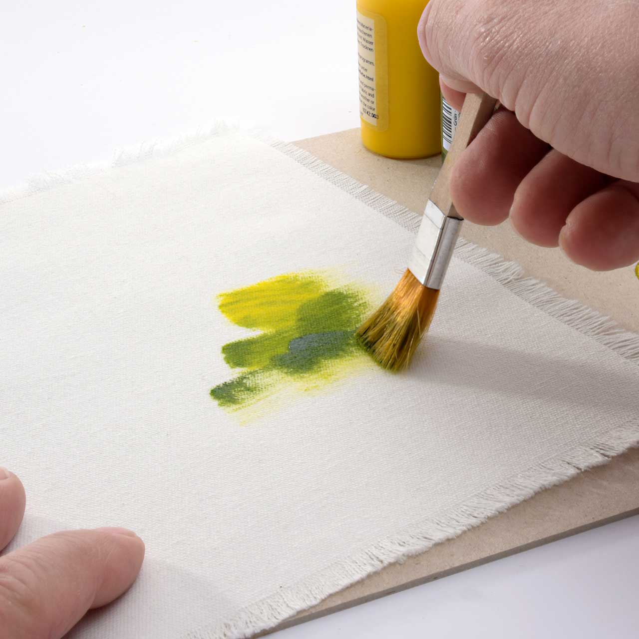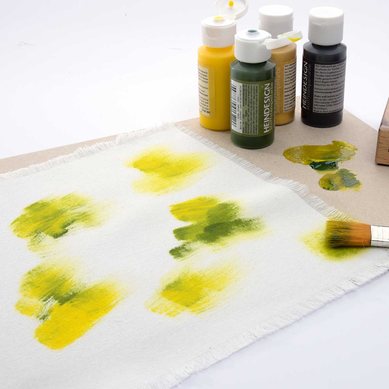 Machen Sie einen dicken Klecks gelber Stoffstempelfarbe und einen nicht so großen Klecks grüner Farbe dicht beieinander auf die Pappe. Nehmen Sie mit dem Pinsel gleichzeitig gelbe und grüne Farbe auf (etwas mehr von der gelben Farbe) und malen Sie mehrere gelb-grüne Flächen auf ihr Tuch.