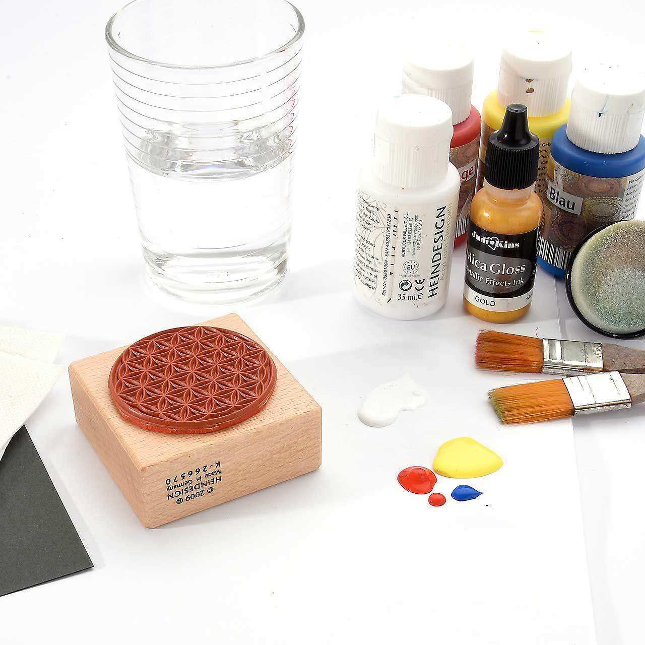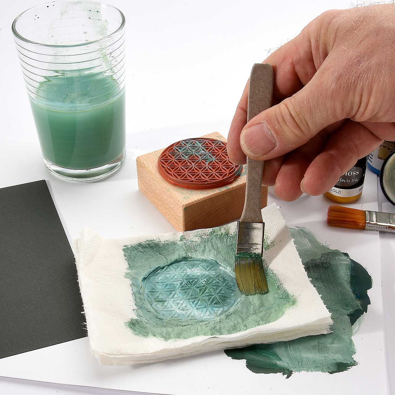 Weiten Sie die Farbschicht um das Motiv aus und lassen Sie das Papierrelief durchtrocknen (geht ganz fix mit einem Heißluftgerät). Reinigen Sie den Stempel und den Pinsel mit reichlich Wasser.