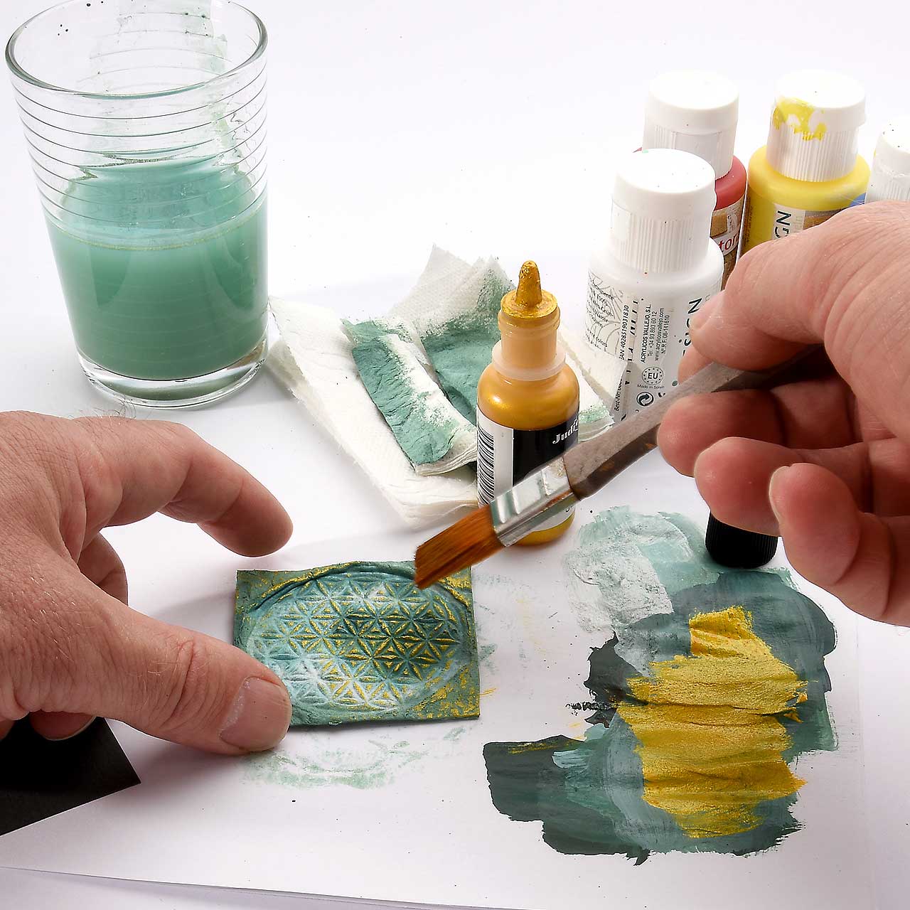 Streichen Sie vorsichtig goldene Mica Gloss Farbe auf das Relief. Die Farbe soll nur an der Oberfläche des Motivs erscheinen.