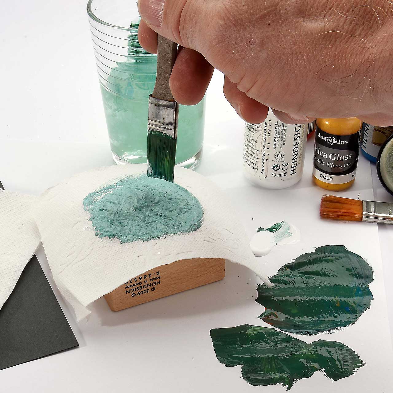 Kreieren Sie einen graublaugrünen Farbton in dem Sie gelbe, rote und blaue Acrylfarbe mischen. Wird der Ton zu grün geben Sie noch etwas Blau hinzu. Streichen Sie den Pinsel einwenig ab und nehmen Sie weiße Acrylfarbe auf. Legen Sie ein Blatt Toilettenpapier auf den Stempel und tupfen Sie die Acrylfarbe auf. Immer schön senkrecht von oben tupfen, damit das Papier tief in das Relief des Stempelgummis gedrückt wird.
