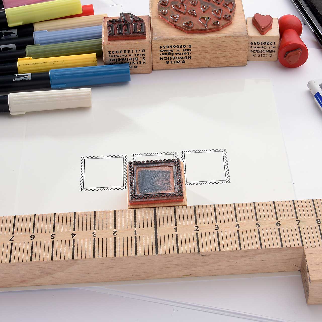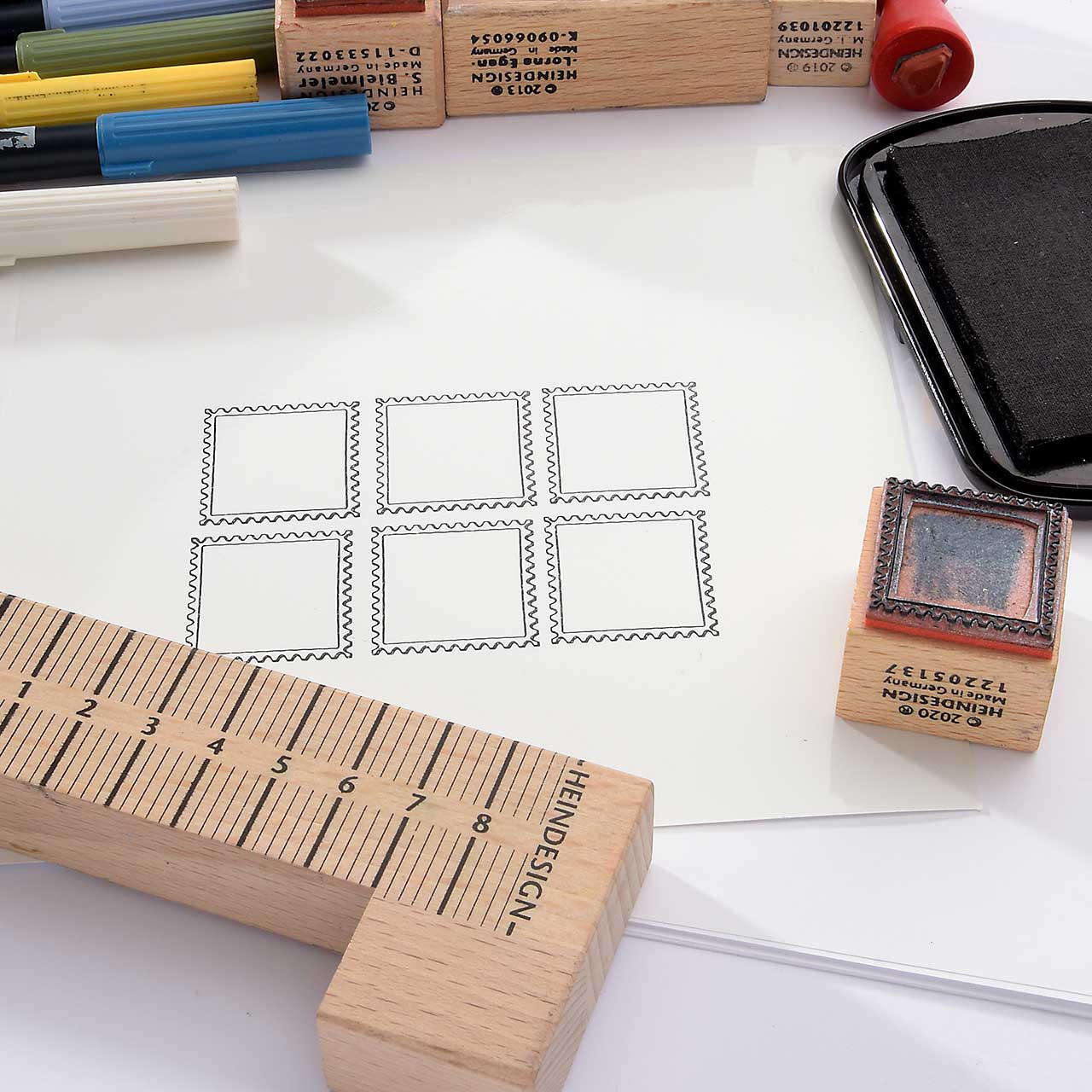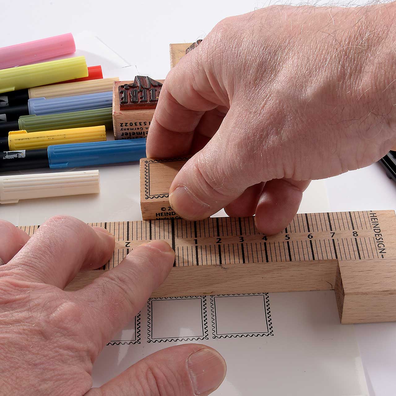Für ein gleichmäßiges Druckbild färben Sie den Stempel vor jedem Abdruck erneut ein. Lassen Sie die Farbe zwischendurch gut trocknen, bevor Sie den Stempel-Anlegewinkel auf die frischen Stempelabdrucke legen.