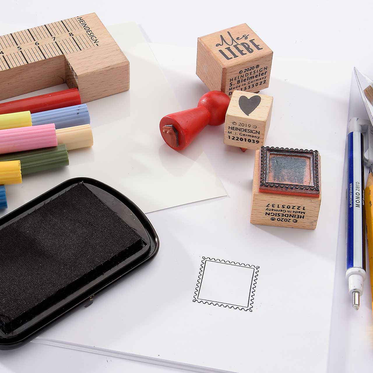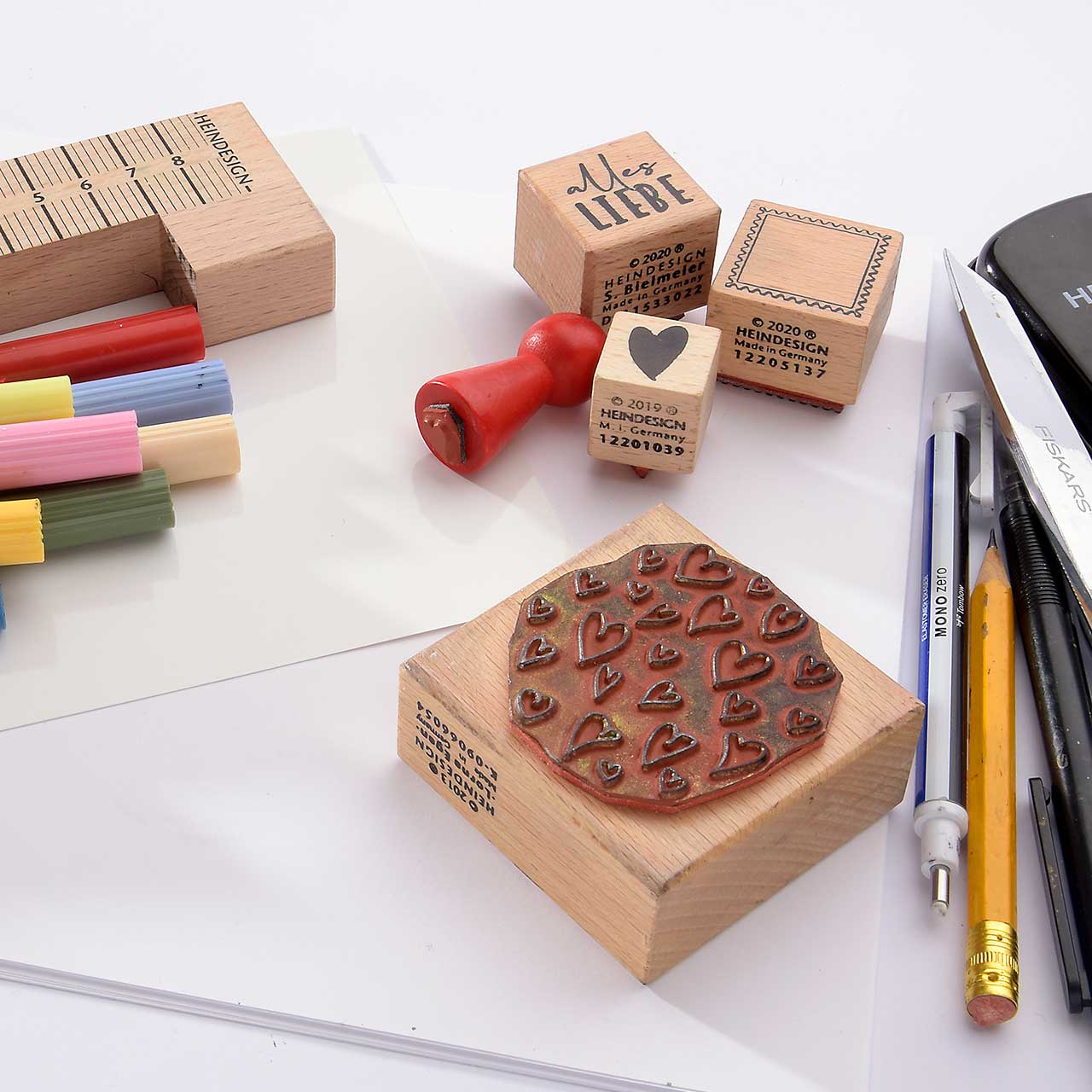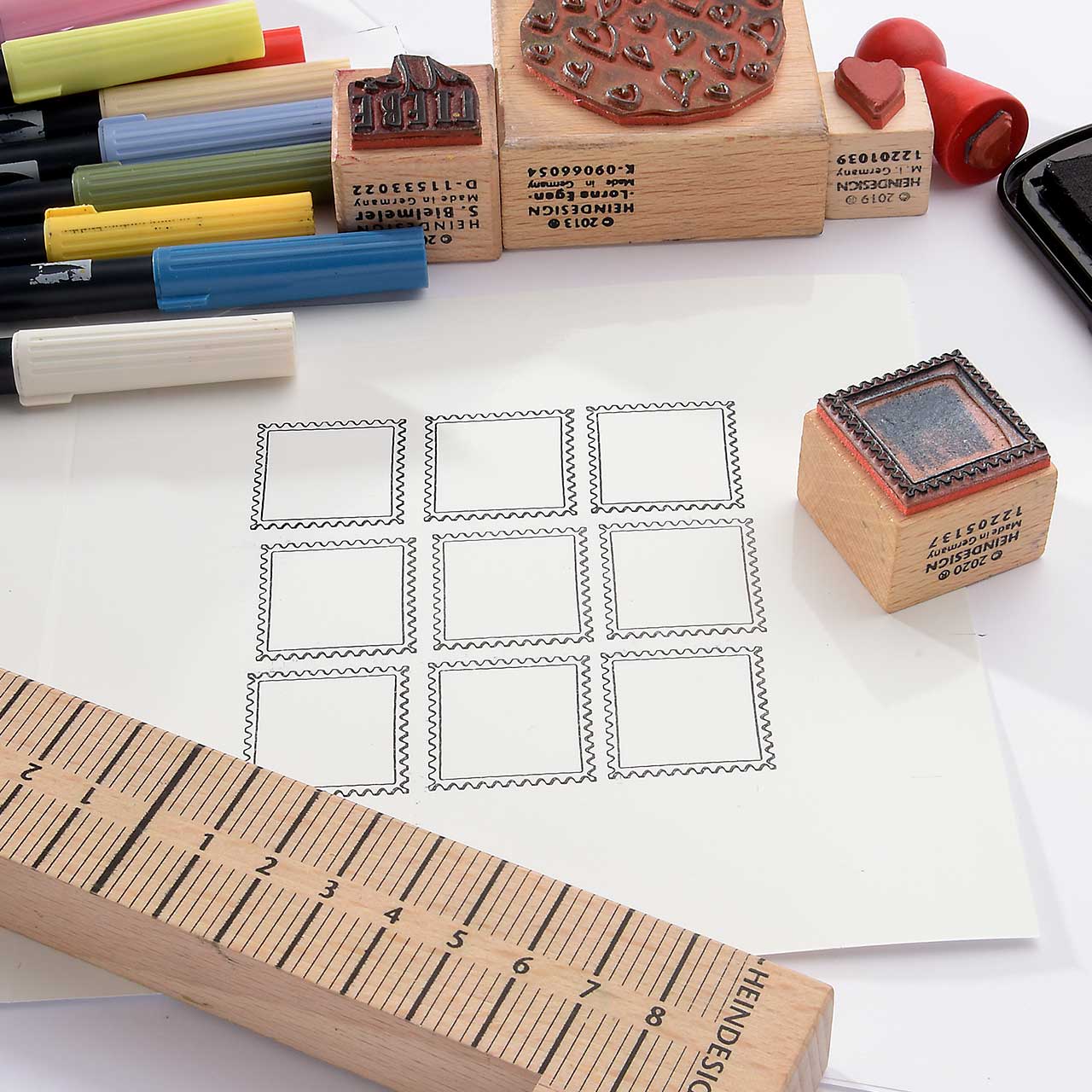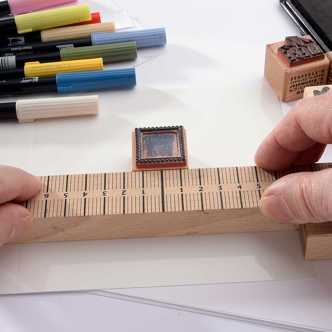Für ein gleichmäßiges Druckbild färben Sie den Stempel vor jedem Abdruck erneut ein. Lassen Sie die Farbe zwischendurch gut trocknen, bevor Sie den Stempel-Anlegewinkel auf die frischen Stempelabdrucke legen.