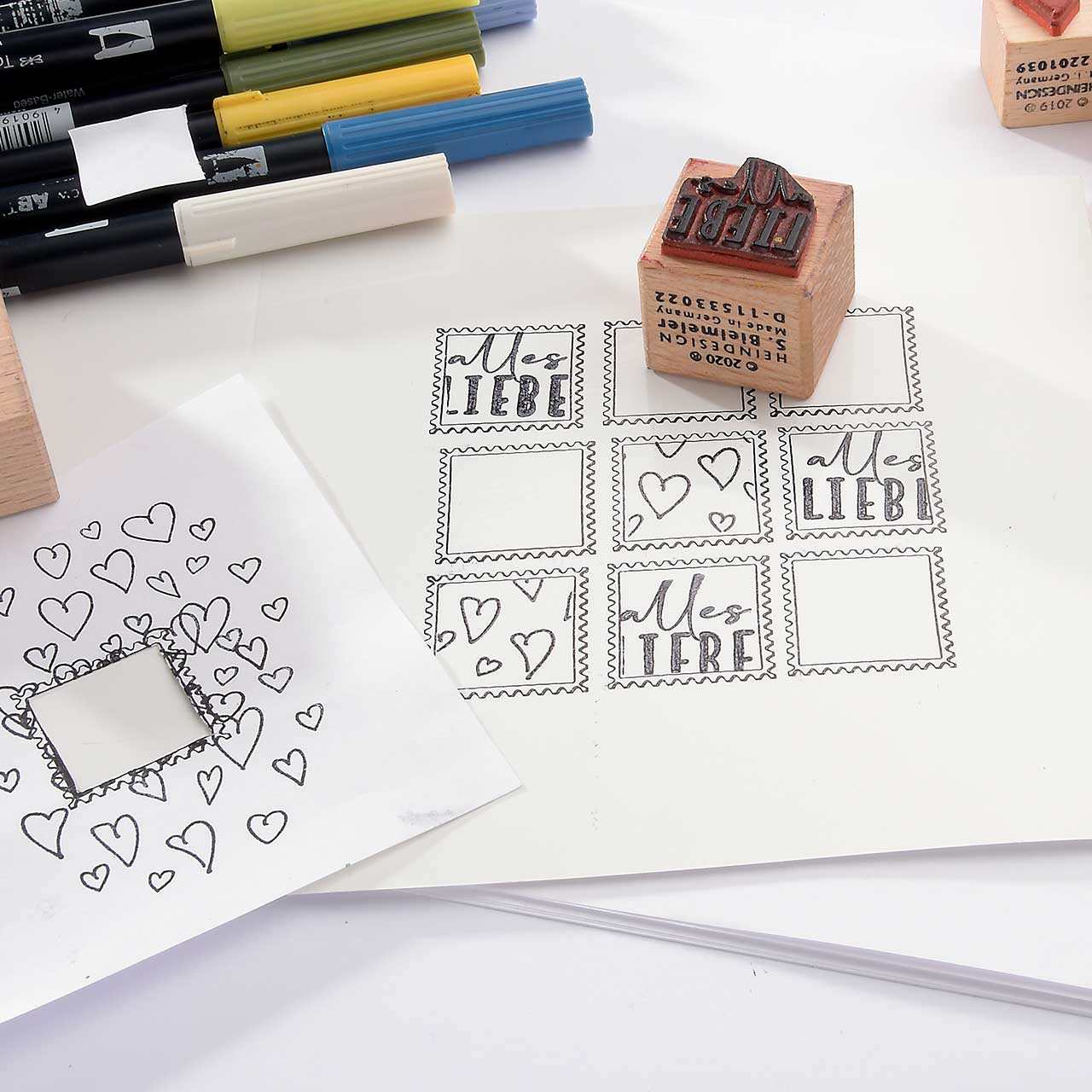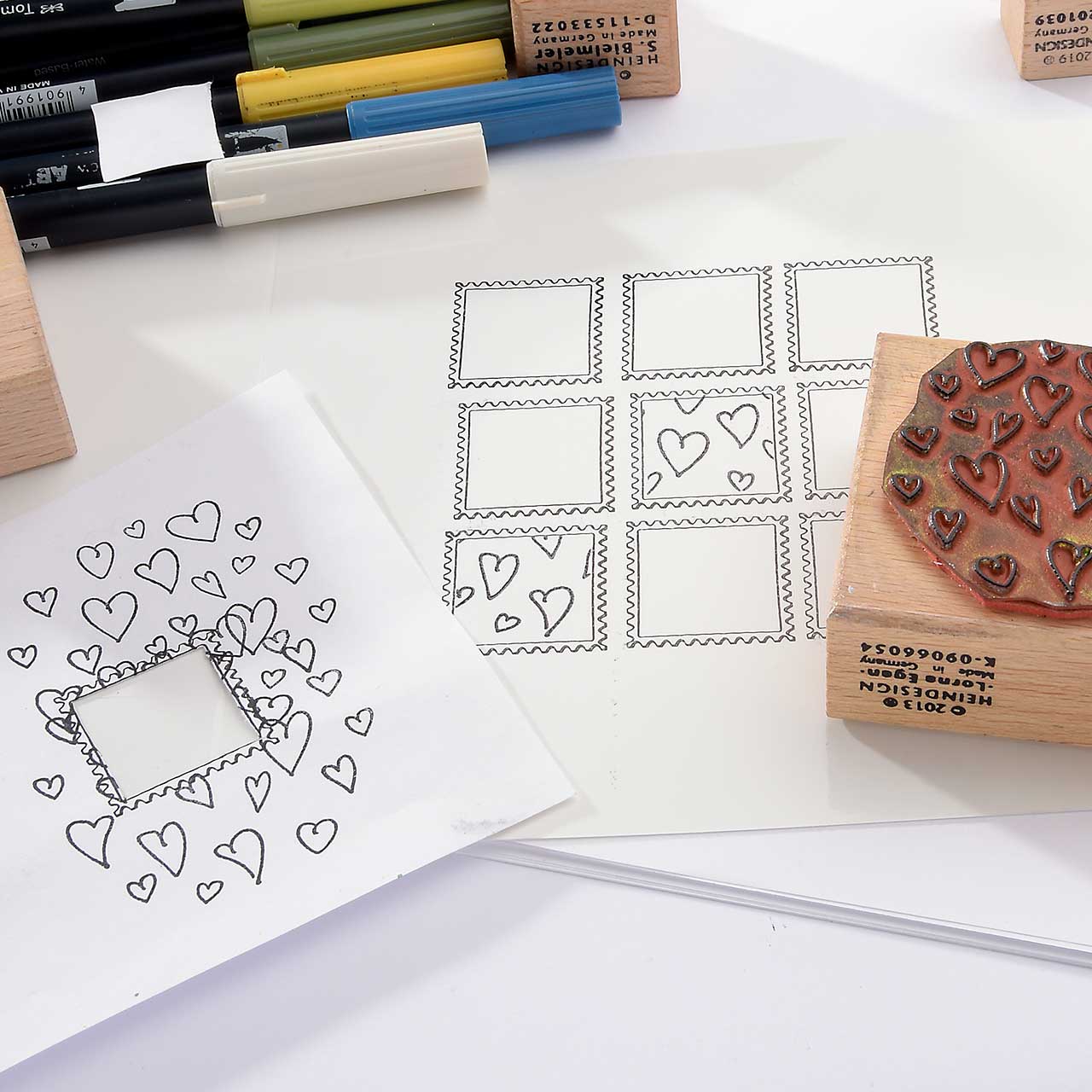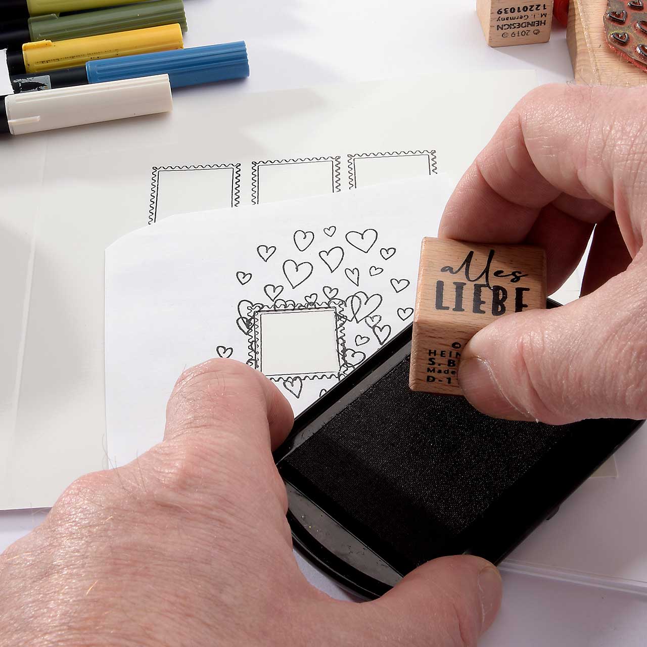Färben Sie mit dem blauen oder roten Faserschreiber das Stempelgummi des Herzflächen Motivs ein und stempeln Sie das Motiv in die Mitte eines der Briefmarken Motive. Wiederholen Sie dies noch ein oder zwei Mal.