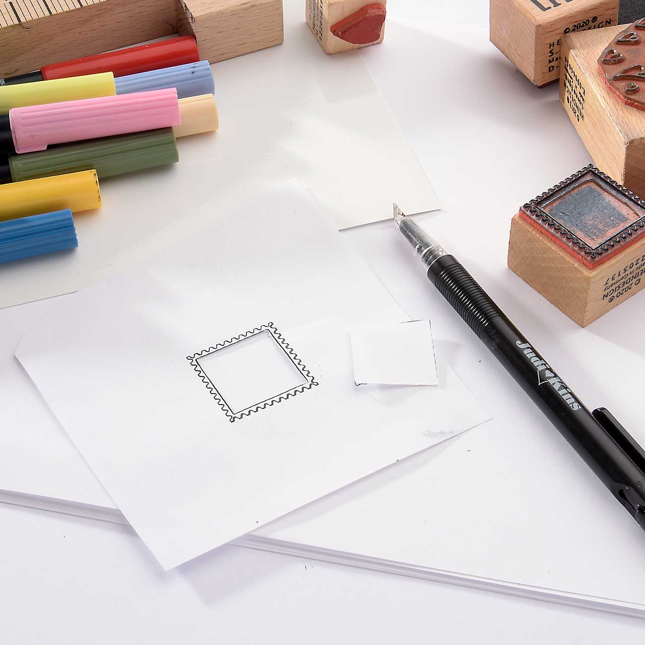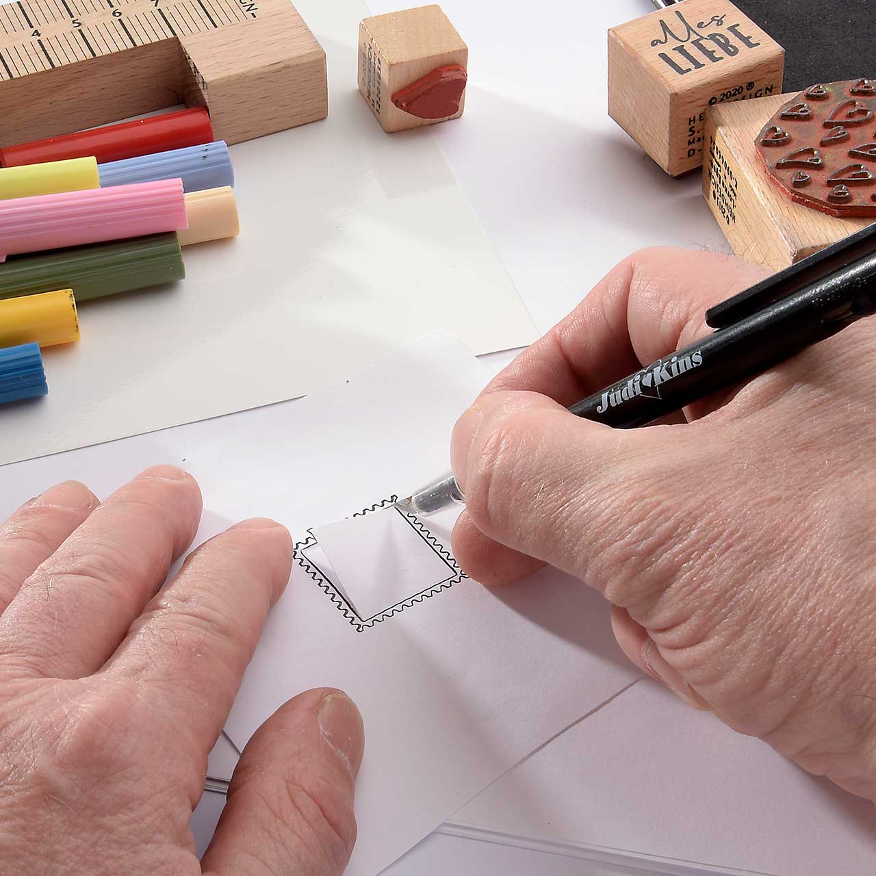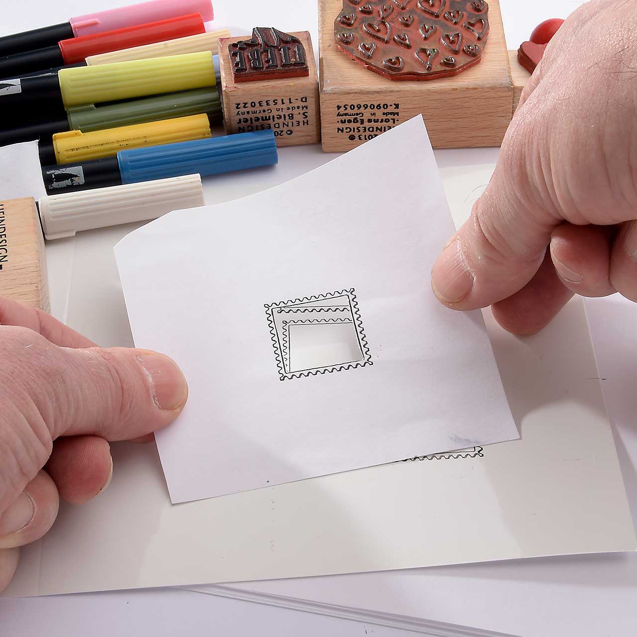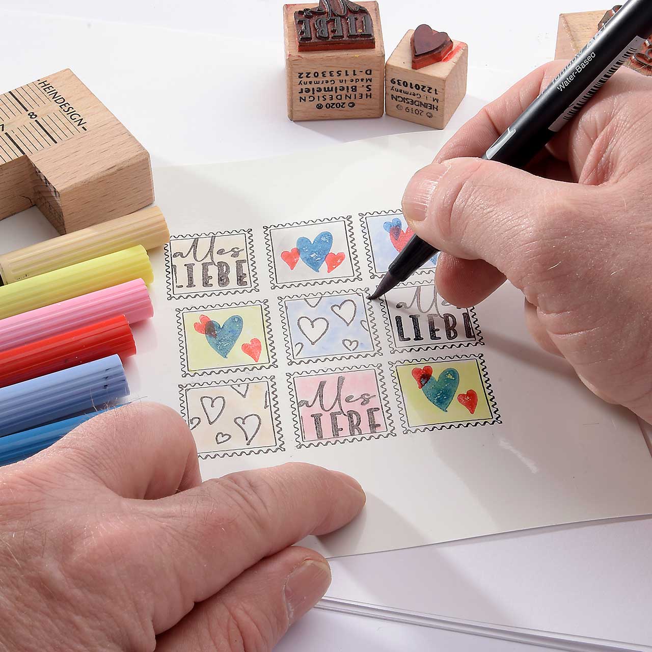 Färben Sie mit dem blauen oder roten Faserschreiber das Stempelgummi des Herzflächen Motivs ein und stempeln Sie das Motiv in die Mitte eines der Briefmarken Motive. Wiederholen Sie dies noch ein oder zwei Mal.