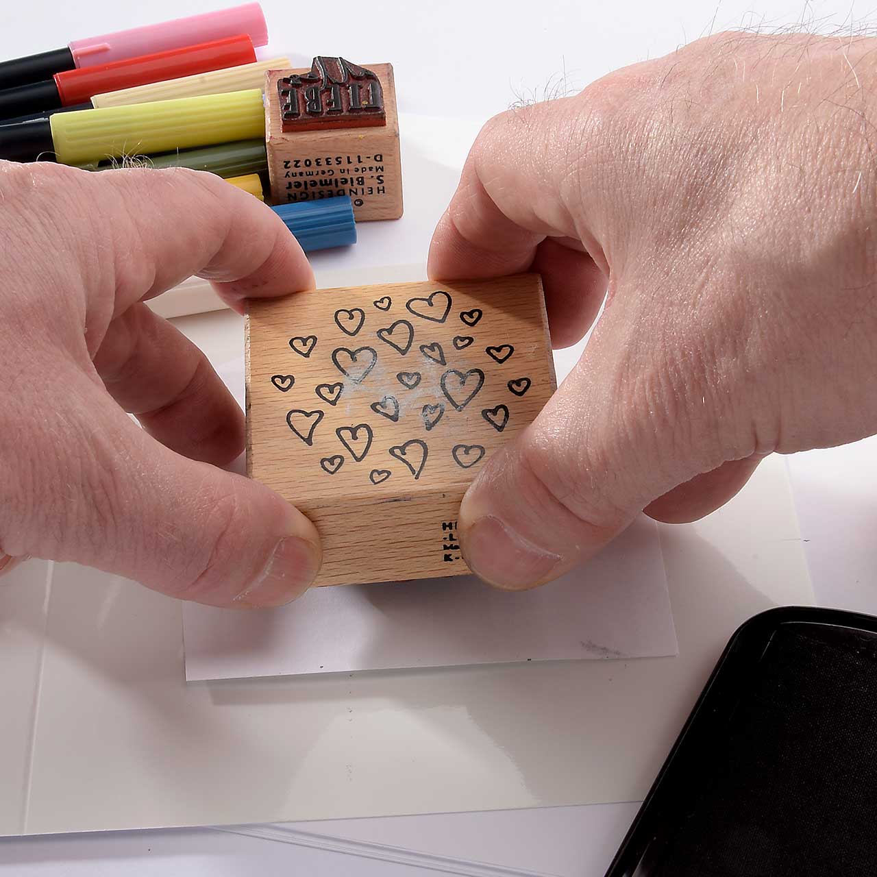 Färben Sie mit dem blaue oder roten Faserschreiber das Stempelgummi des Mini Herz Motivs ein und stempeln Sie das Motiv mehrmals zu den zuvor gestempelten Herz Motiven.