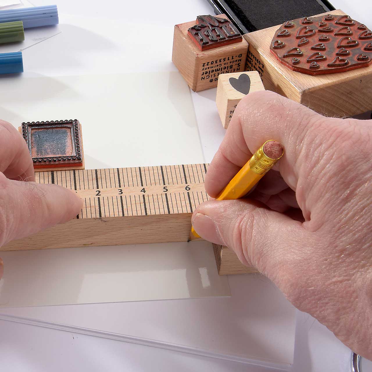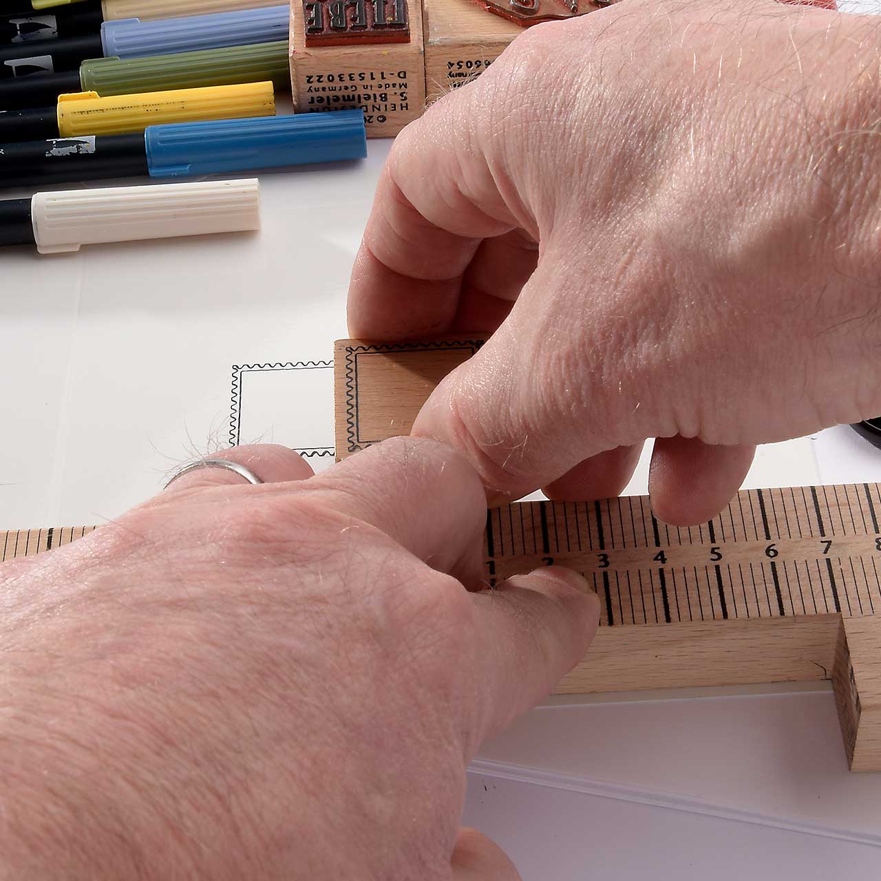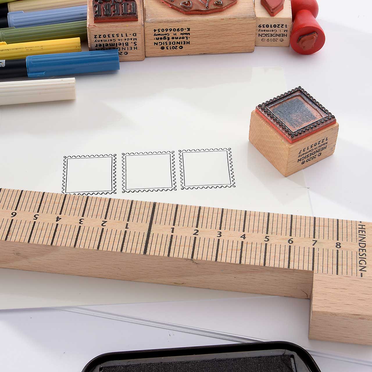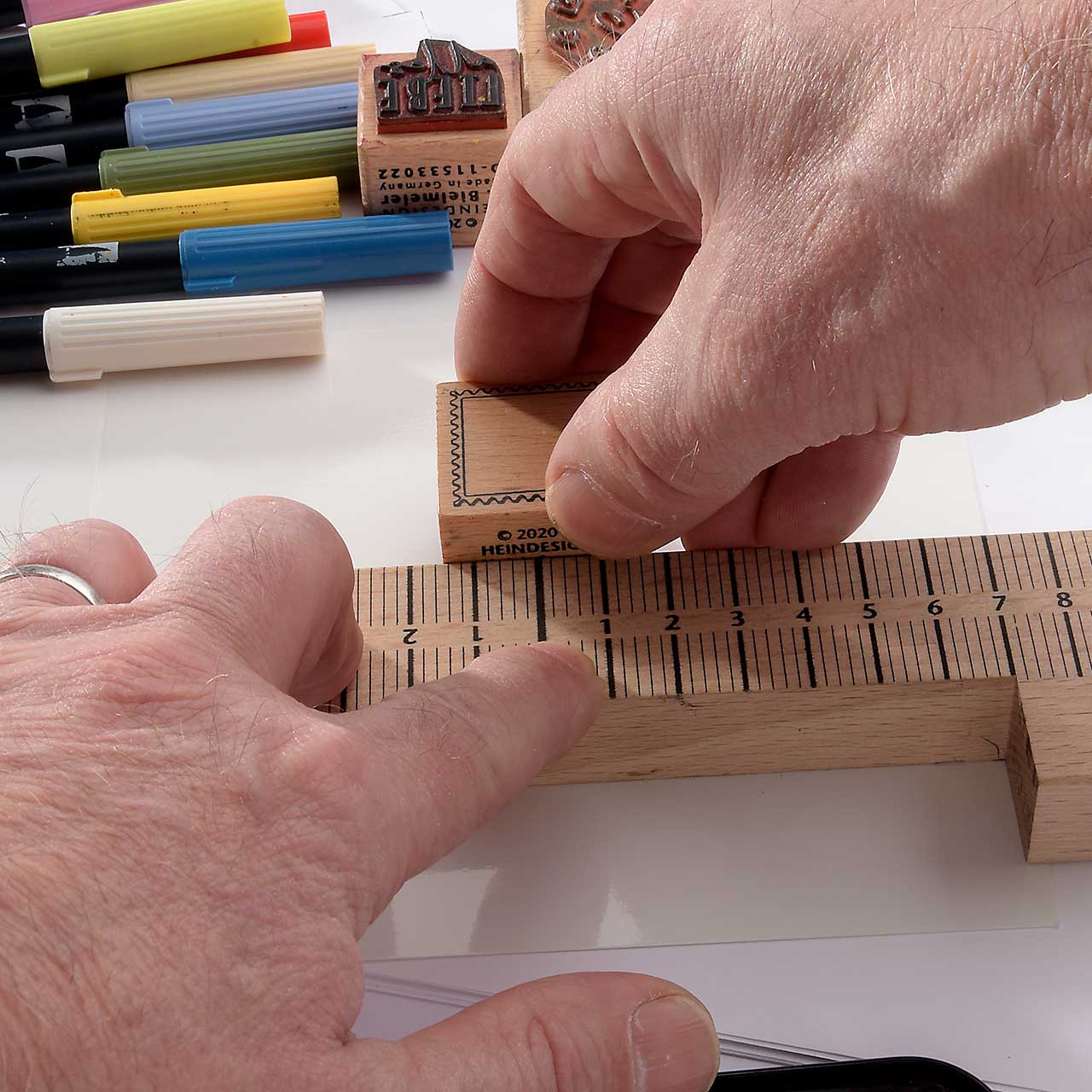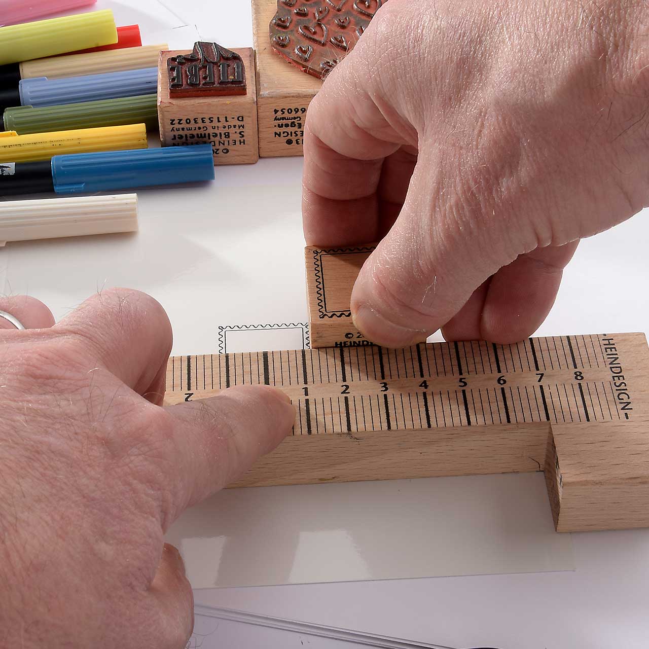 Legen Sie den Briefmarken-Stempel (Gummiseite oben) genau in die Mitte Ihrer Karte. Legen Sie den Stempel-Anlegewinkel, schön gerade, an den Stempel an. Markieren Sie sich die Position des Anlegewinkels, einmal unterhalb und einmal oberhalb der Leiste. (Der Anlegewinkel ist, genau wie der Stempel 3 cm breit. Darum passt es prima, wenn Sie die Markierung an beiden Seiten des Anlegewinkels machen.)