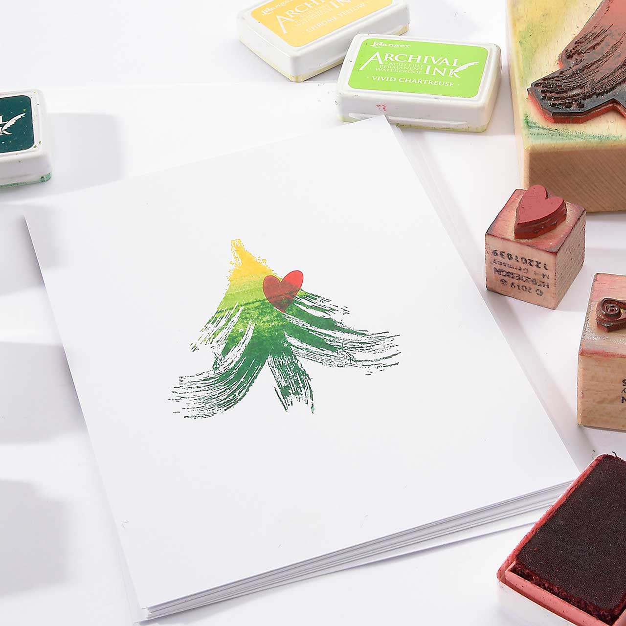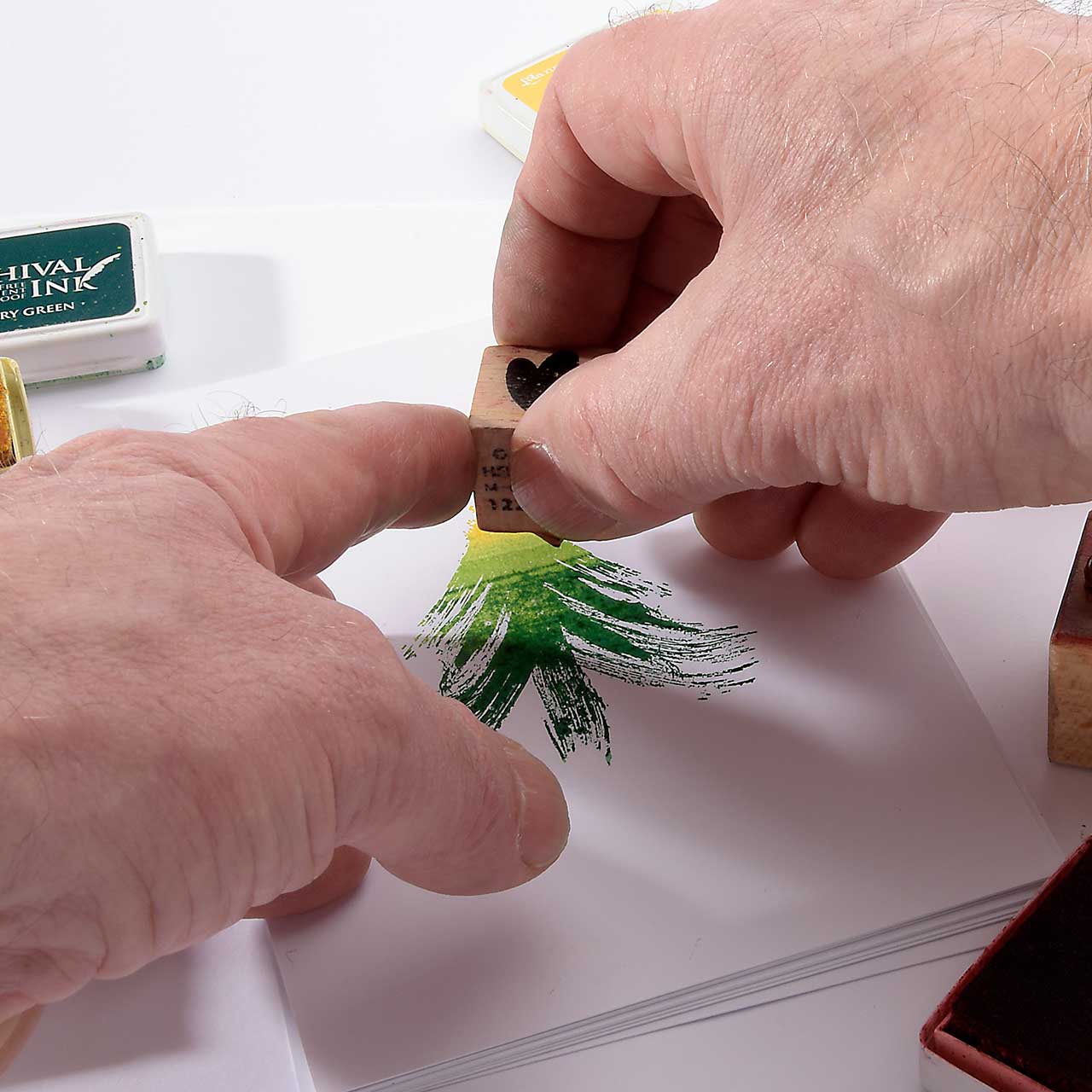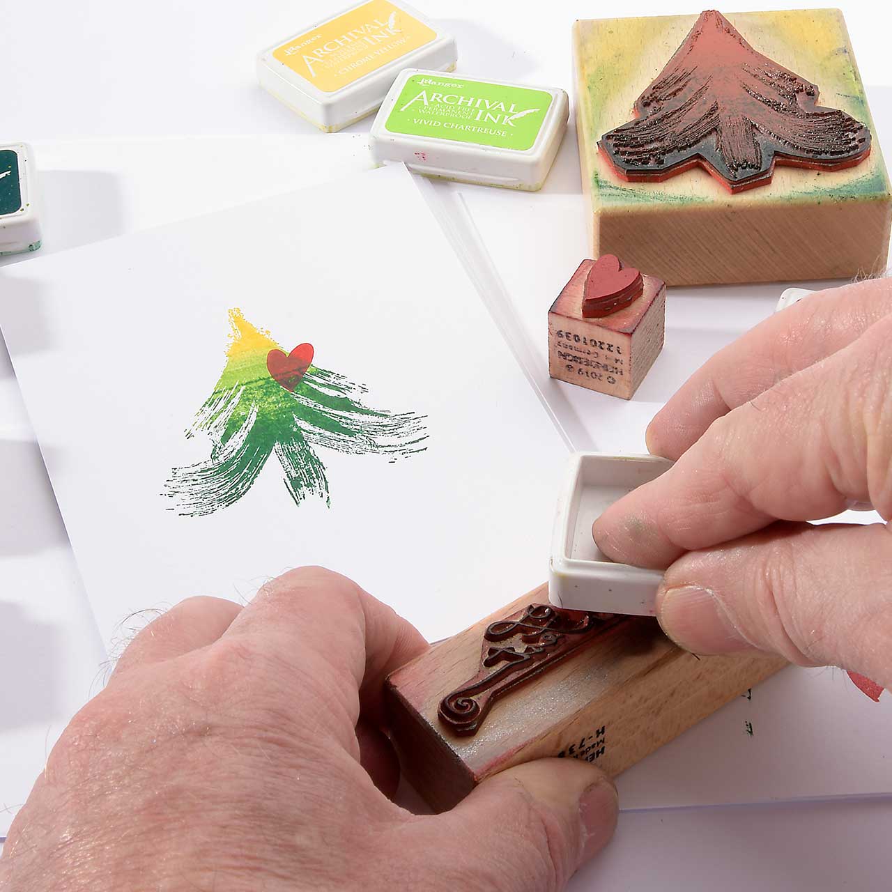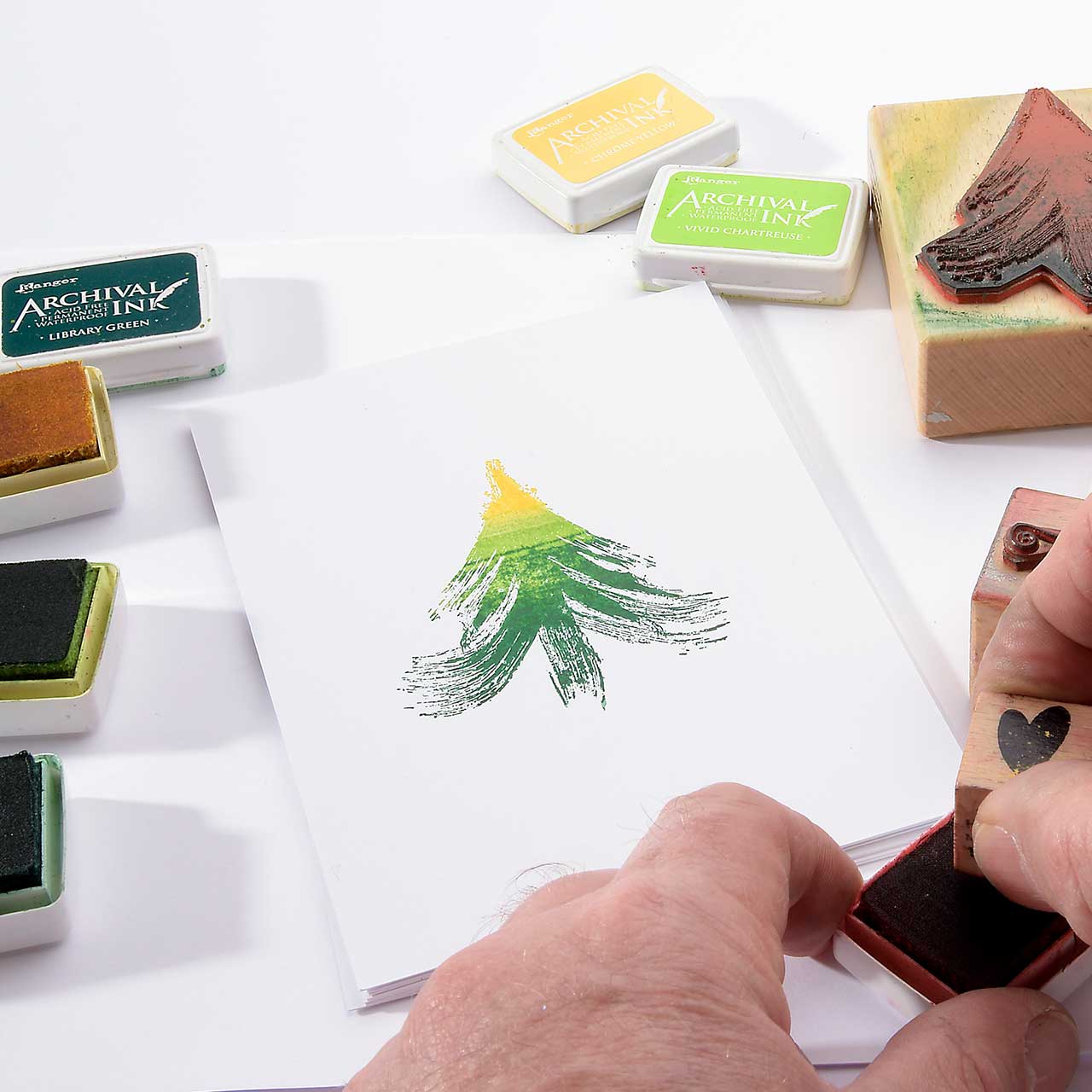 Färben Sie das Pinselstrich Tannenbaum Stempelgummi mit den Mini-Stempelkissen ein, oben Chromegelb, in der Mitte Gelbgrün und unten Dunkelgrün.