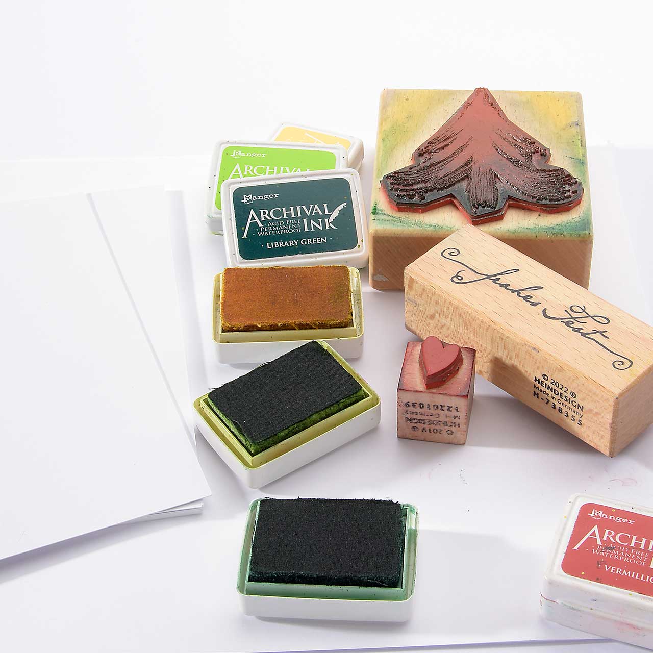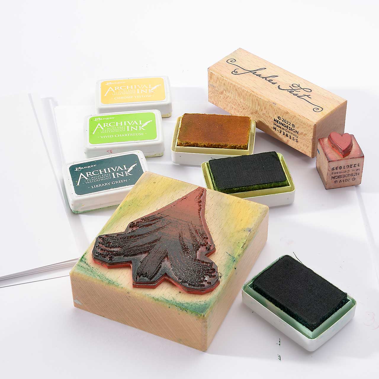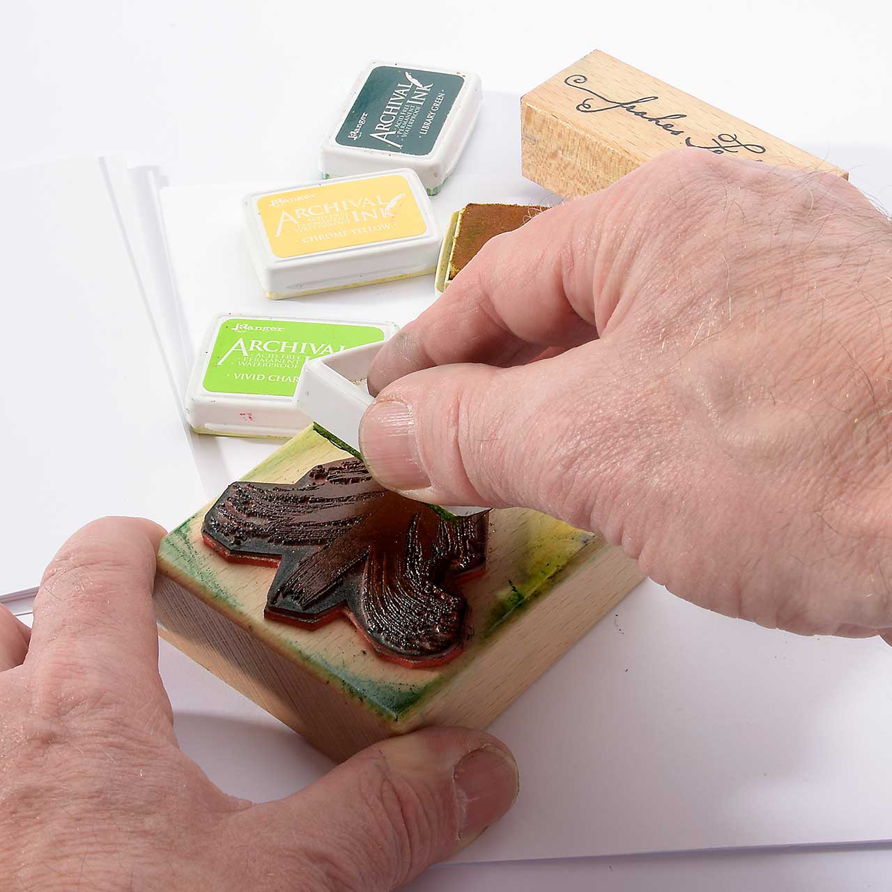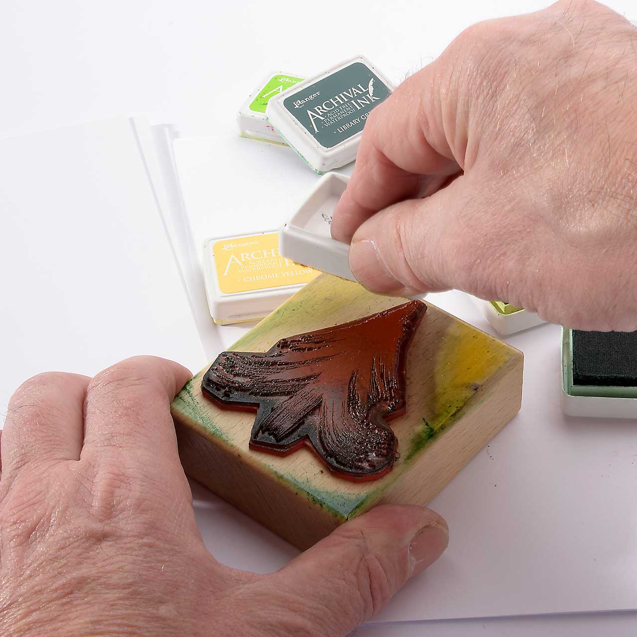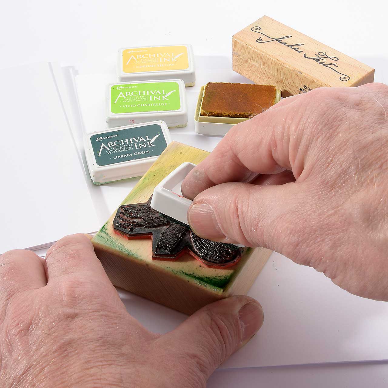 Färben Sie das Pinselstrich Tannenbaum Stempelgummi mit den Mini-Stempelkissen ein, oben Chromegelb, in der Mitte Gelbgrün und unten Dunkelgrün.