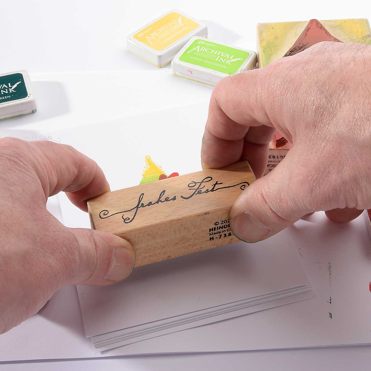 Stempeln Sie das „Frohes Fest“ Textmotiv mit dem roten Mini-Stempelkissen mittig unter das Tannenbaum Motiv.