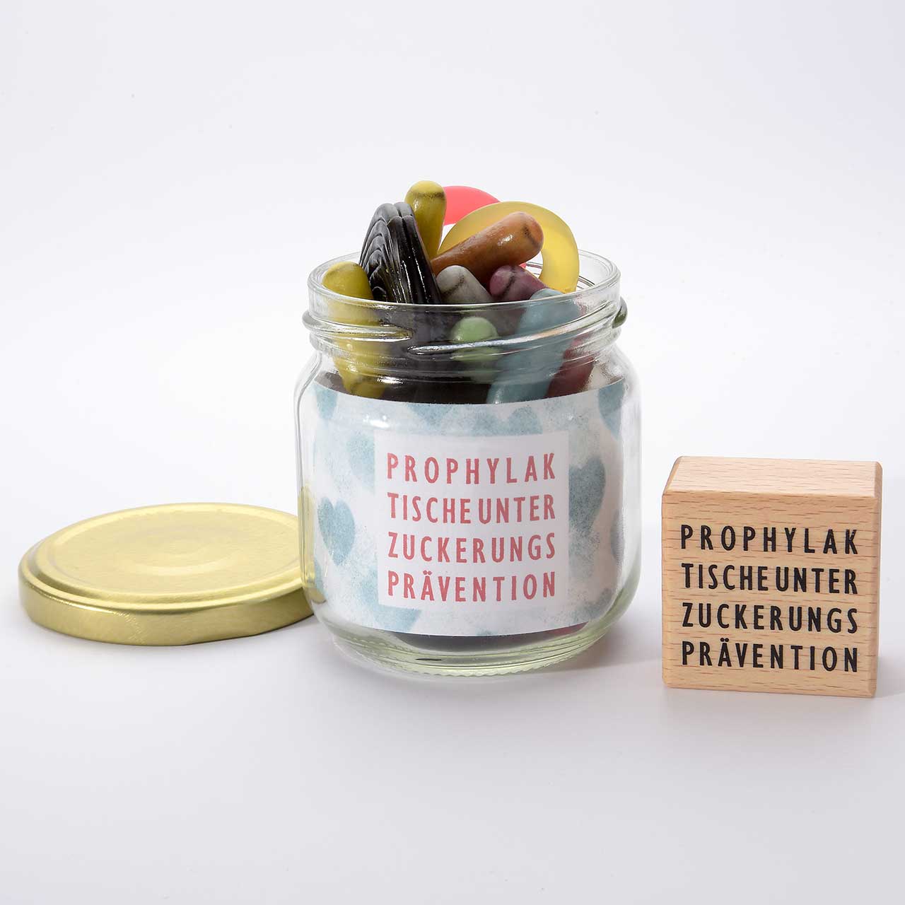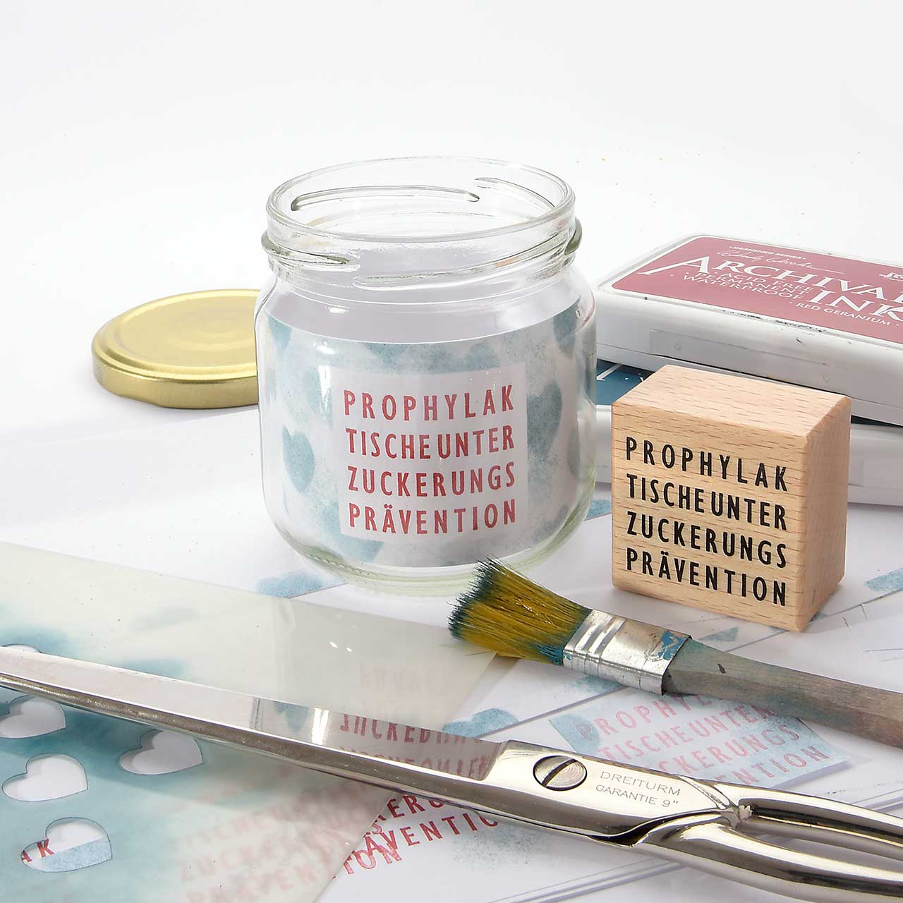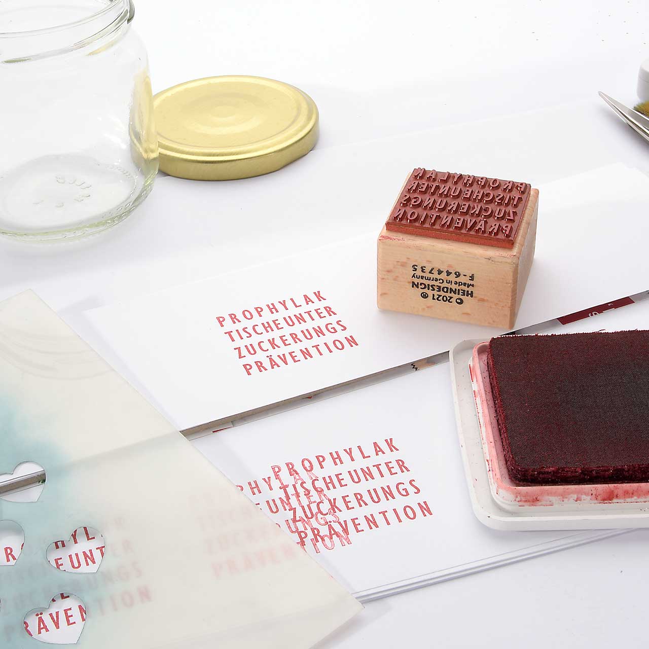 Stempeln Sie das „Prophylaktische...“-Textmotiv mit dem roten Stempelkissen auf einen Streifen Kartenkarton (Tombow Bristolkarton).