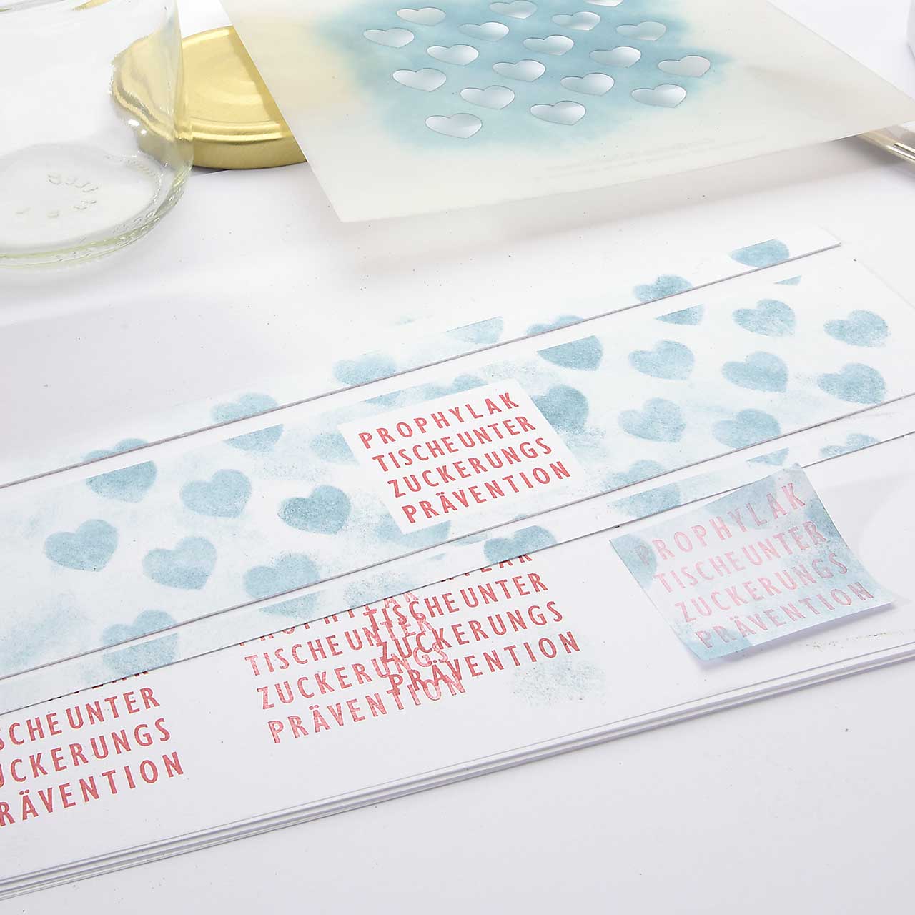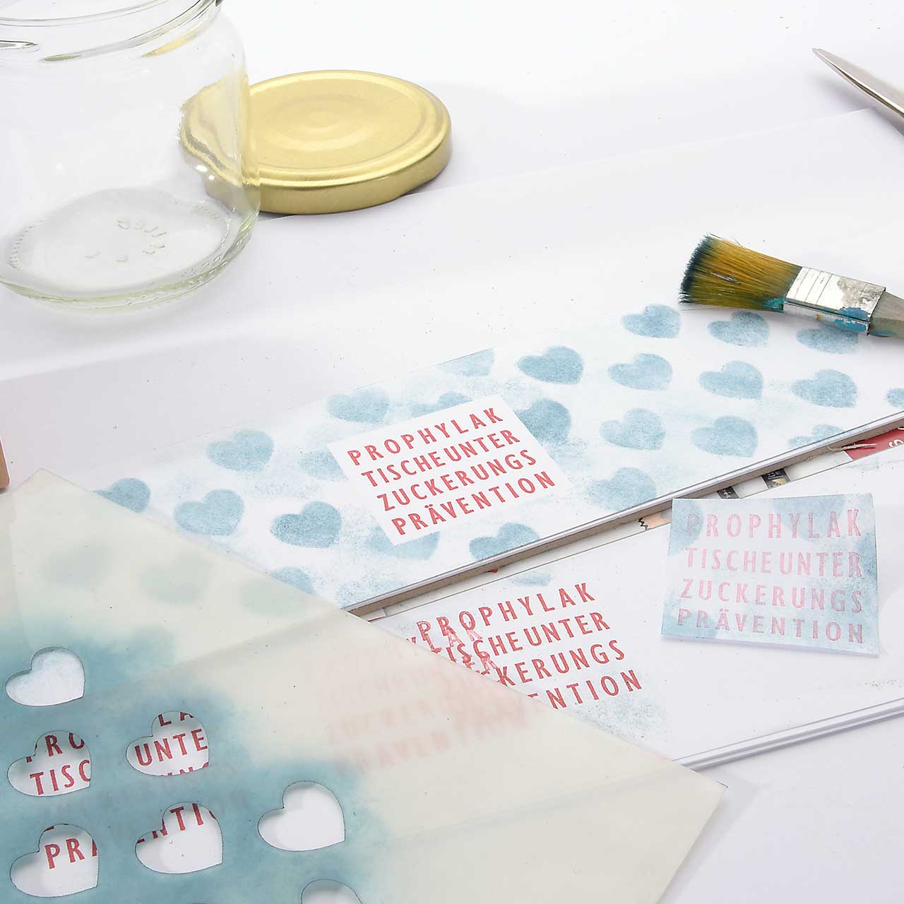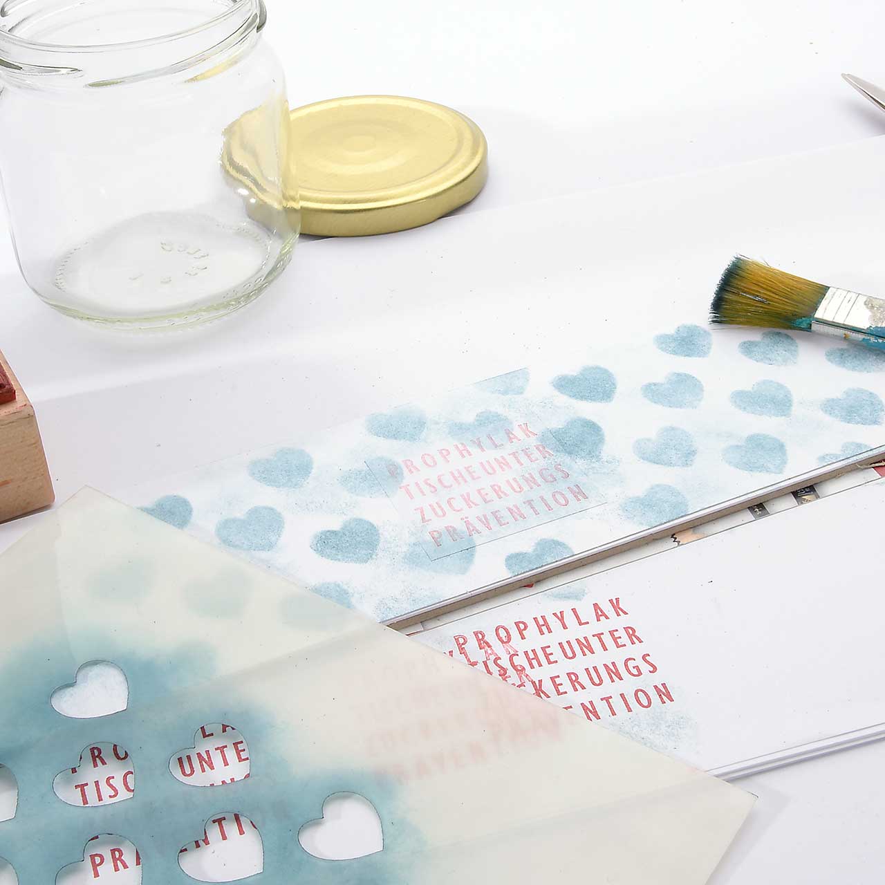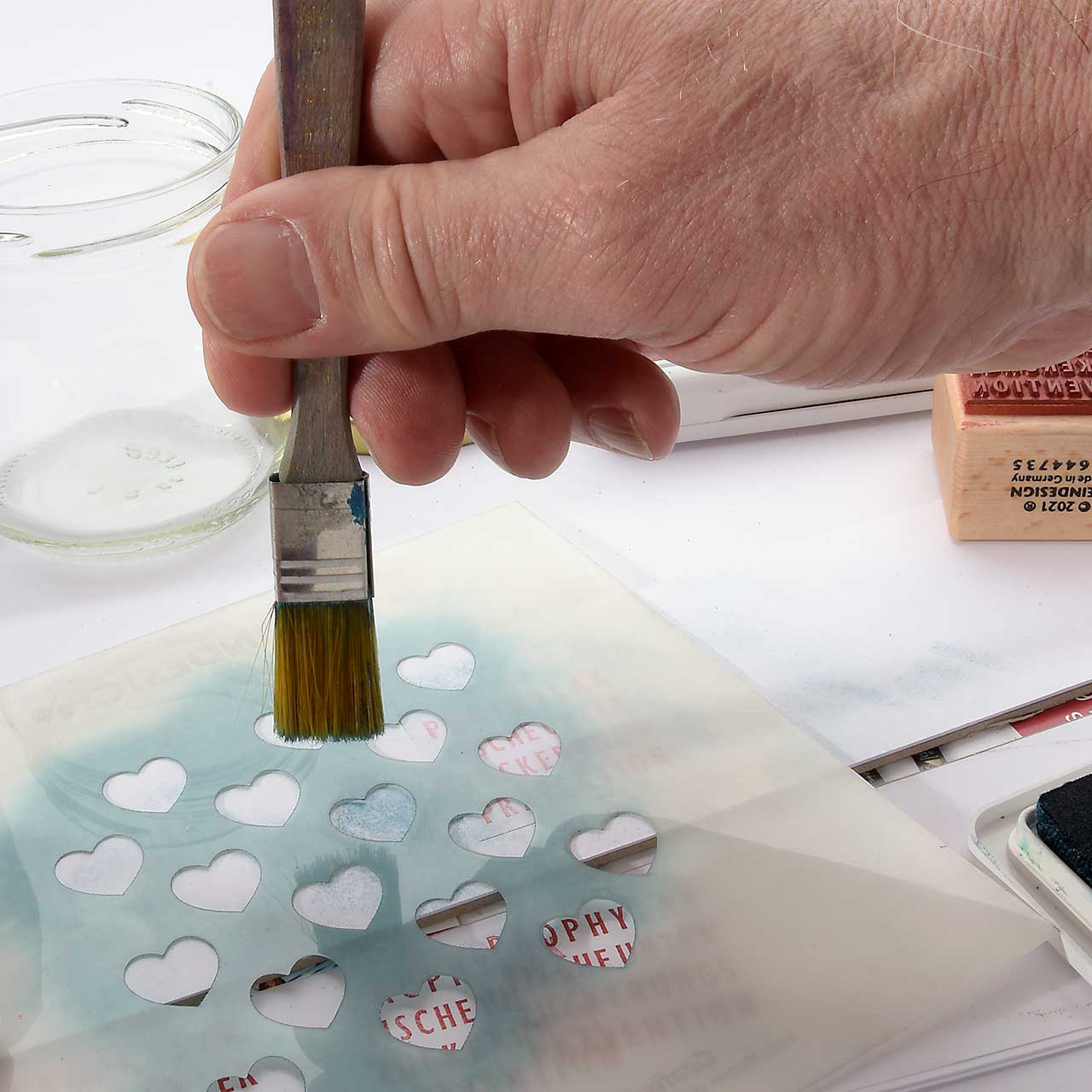 Legen Sie die viele Herzen Schablone auf Ihren Streifen und tupfen Sie mit dem Pinsel blaue Farbe aus dem Stempelkissen auf die Herzen. Setzen Sie die Schablone mehrmals an, damit der ganze Streifen gefüllt werden kann.