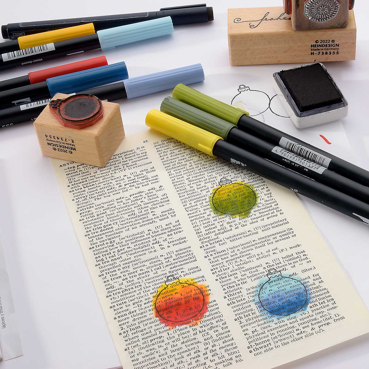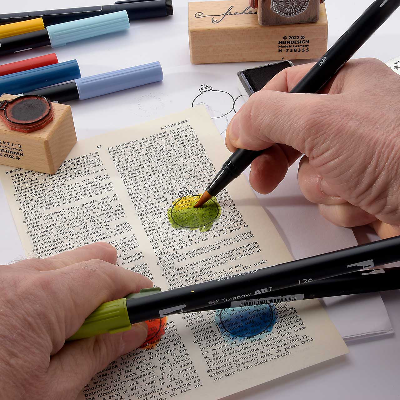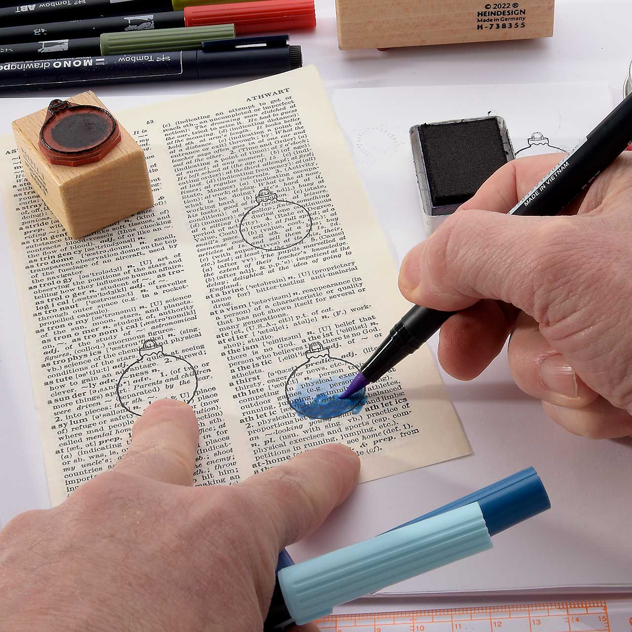 Kolorieren Sie die Christbaumkugel Motive auf der Buchseite mit den Tombow Dual Brushpen Faserschreibern (ABT). Jeweils mit drei abgestimmten Farben - drei Blautöne, drei Rottöne und drei Grüntöne. (Das feine an dieser Collage-Technik ist, dass Sie beim Kolorieren nicht aufpassen müssen und ruhig über die Kontur hinaus malen können.)
