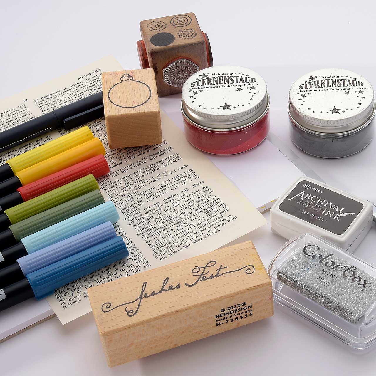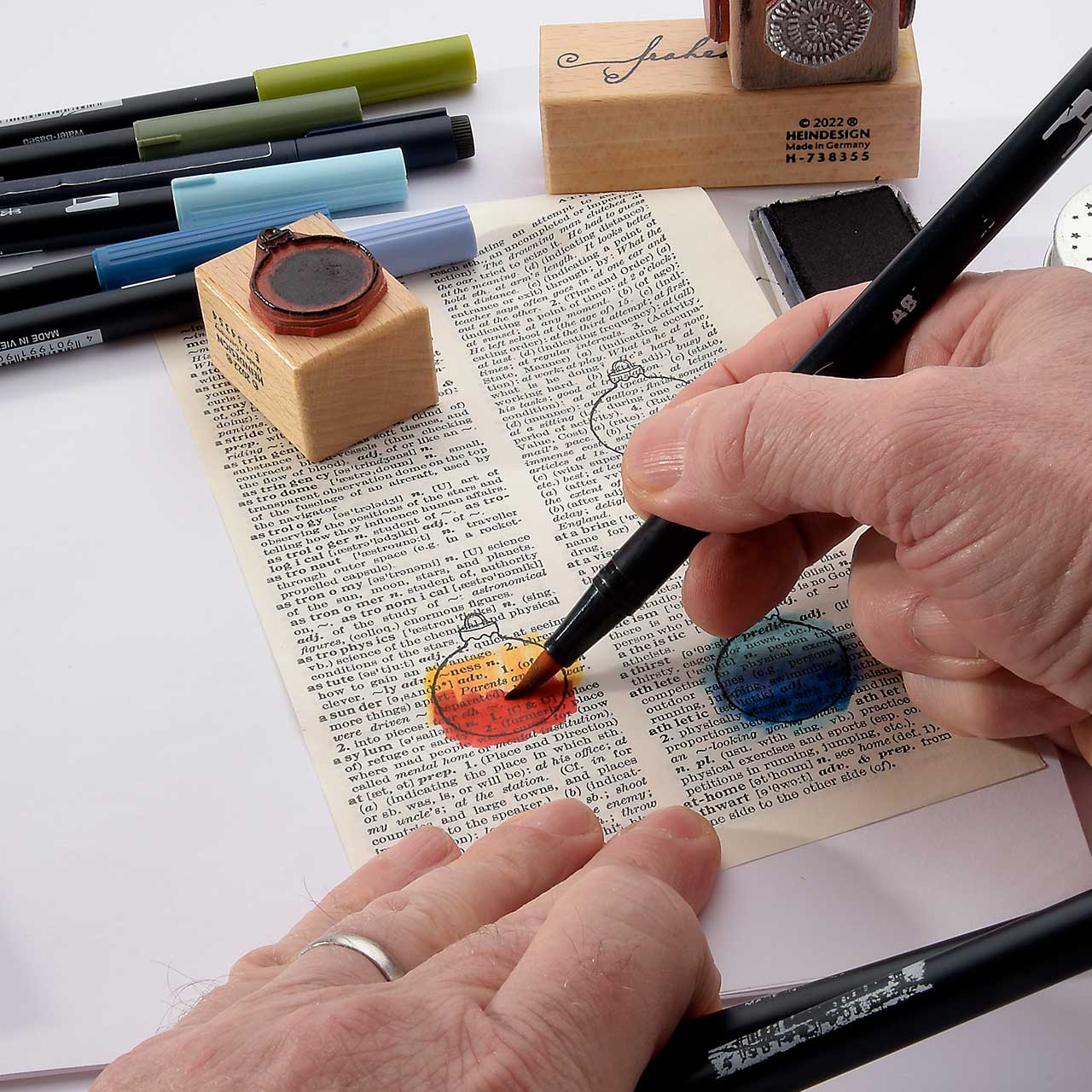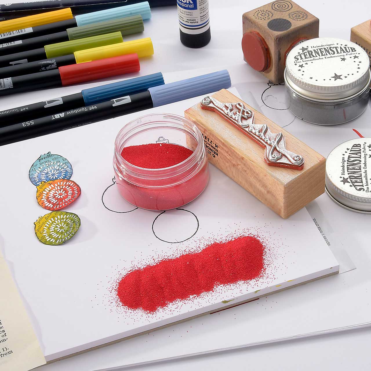 Kolorieren Sie die Christbaumkugel Motive auf der Buchseite mit den Tombow Dual Brushpen Faserschreibern (ABT). Jeweils mit drei abgestimmten Farben - drei Blautöne, drei Rottöne und drei Grüntöne. (Das feine an dieser Collage-Technik ist, dass Sie beim Kolorieren nicht aufpassen müssen und ruhig über die Kontur hinaus malen können.)
