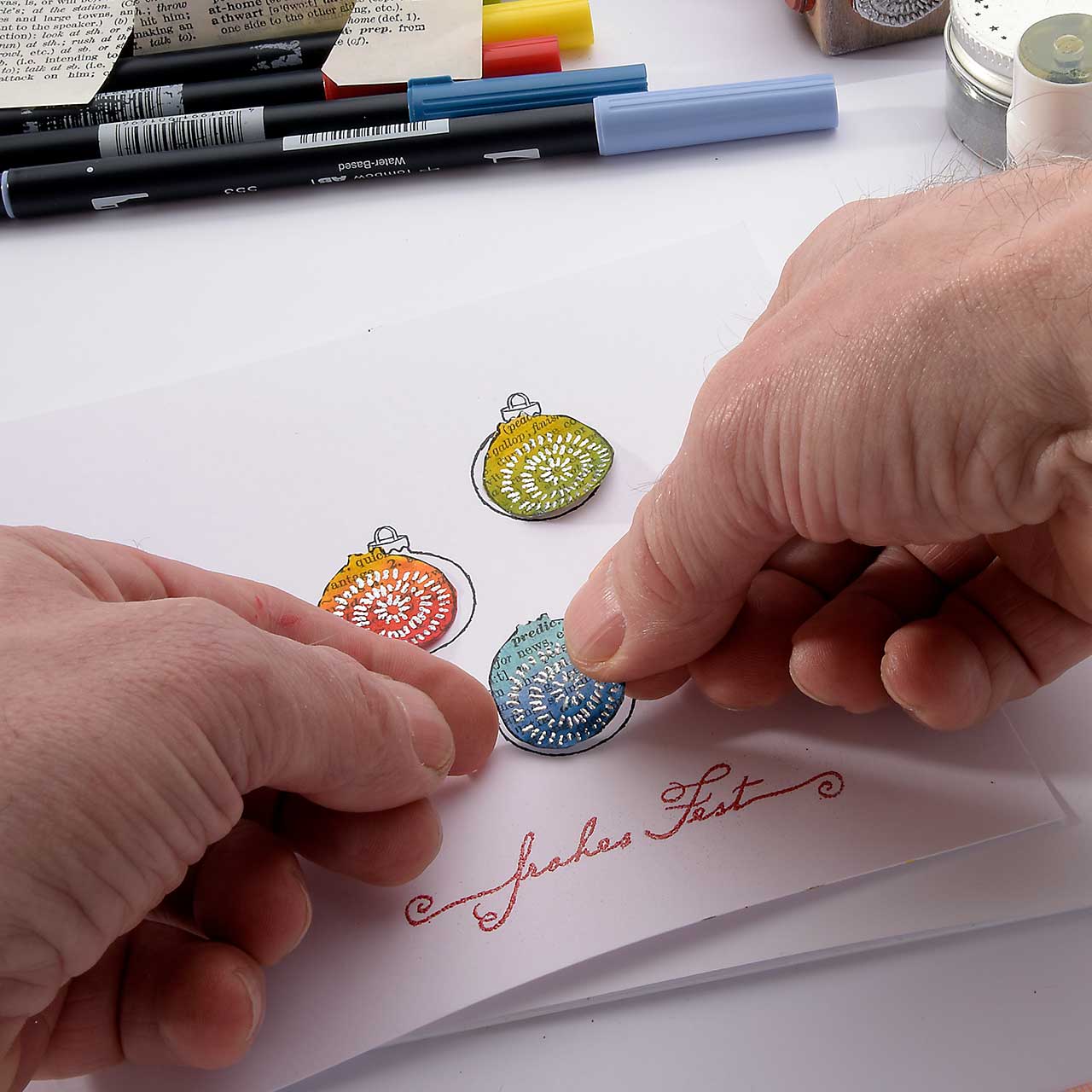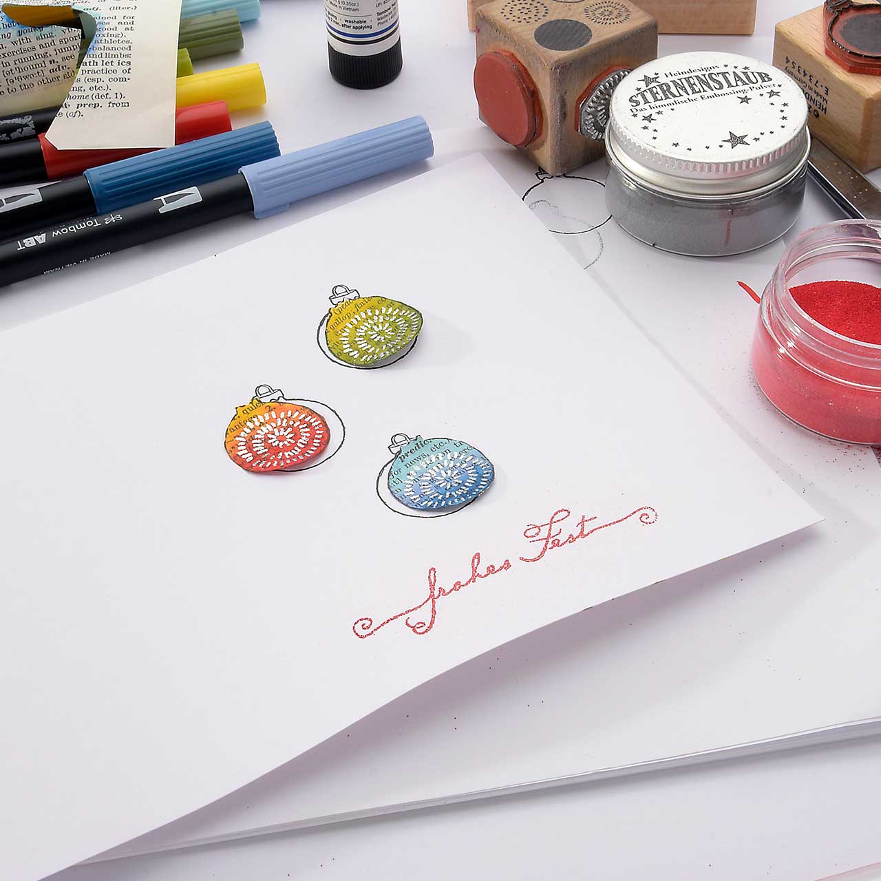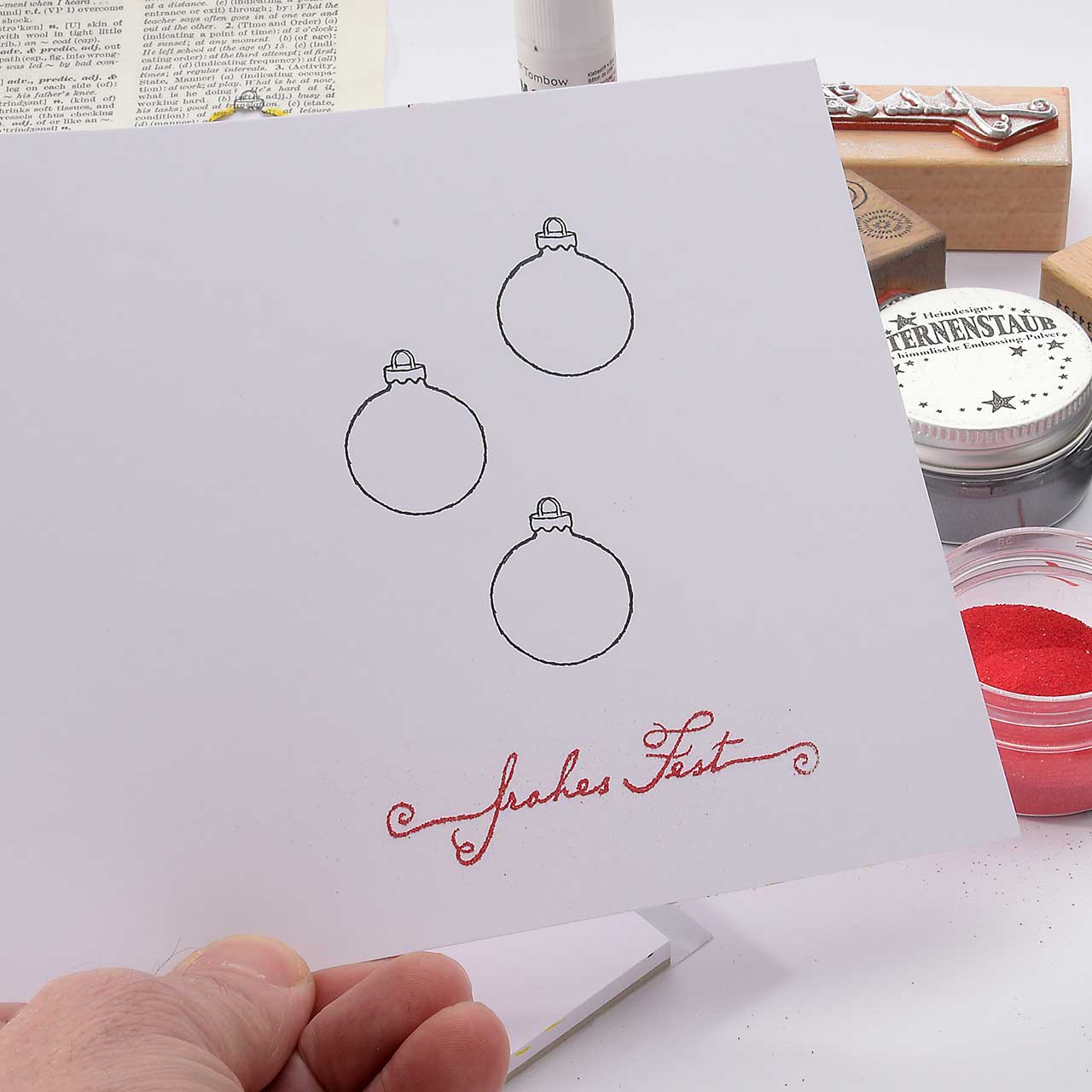 Stempeln und embossen Sie das „Frohes Fest“-Textmotiv mit dem silbernen Sternenstaub mittig unter die Christbaumkugel-Motive.