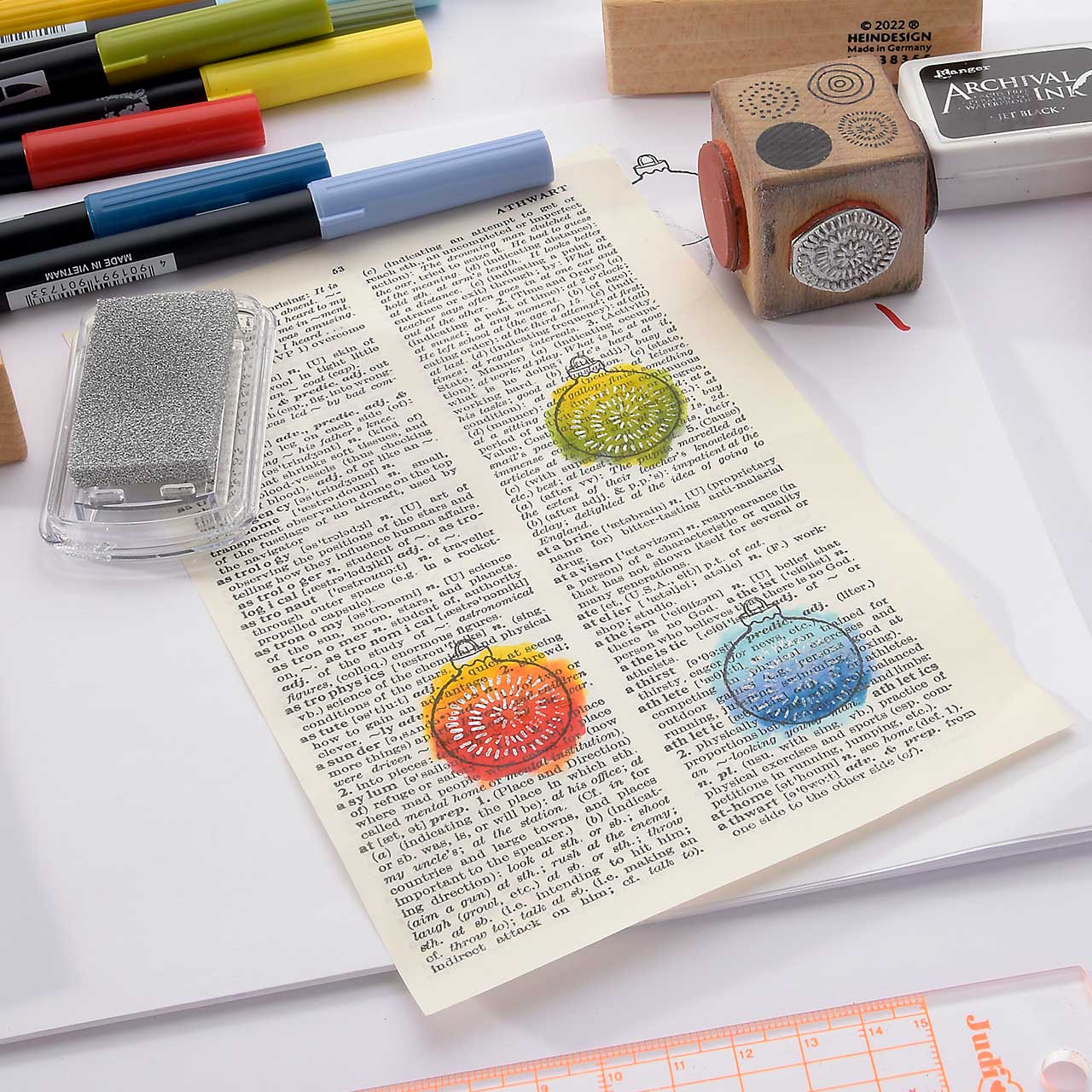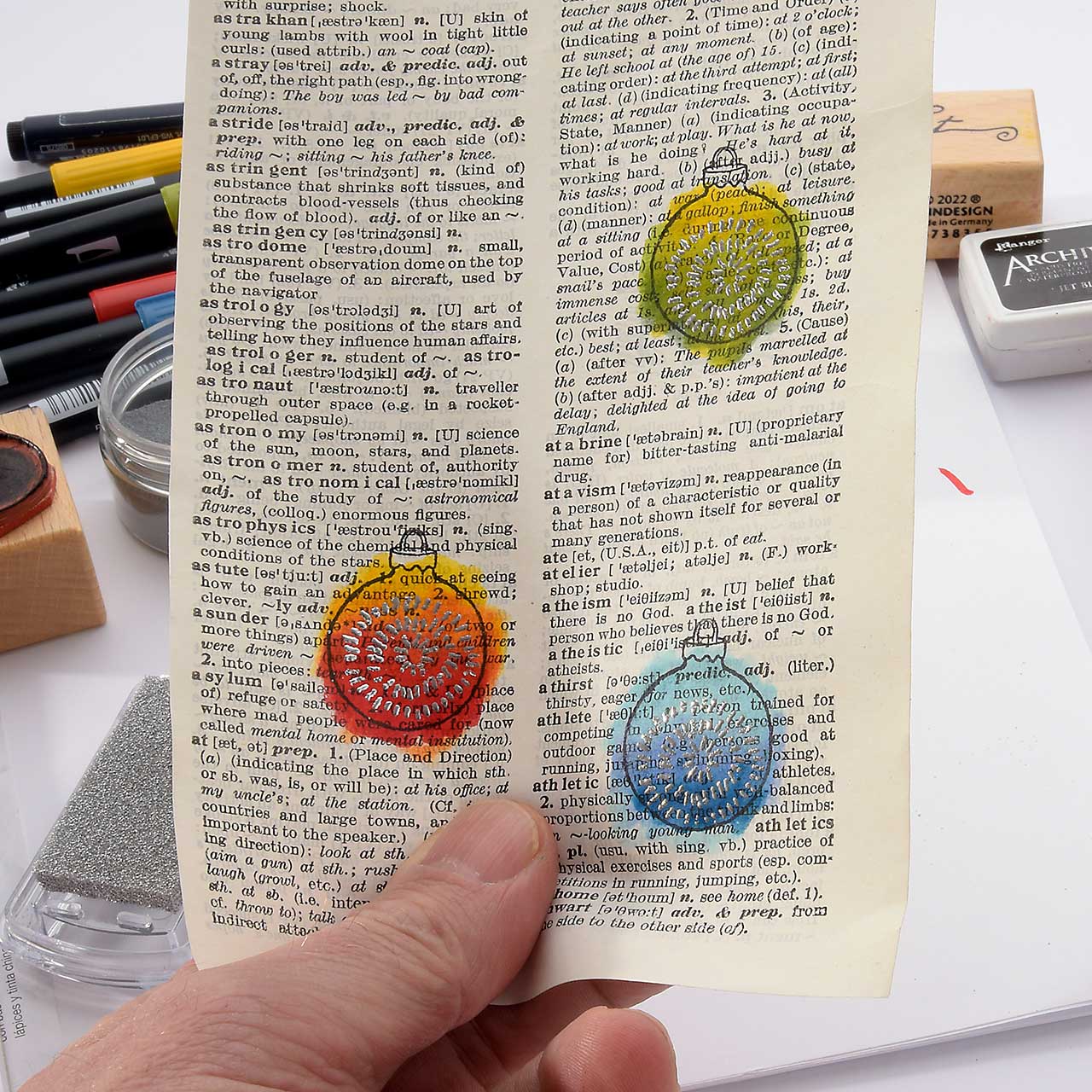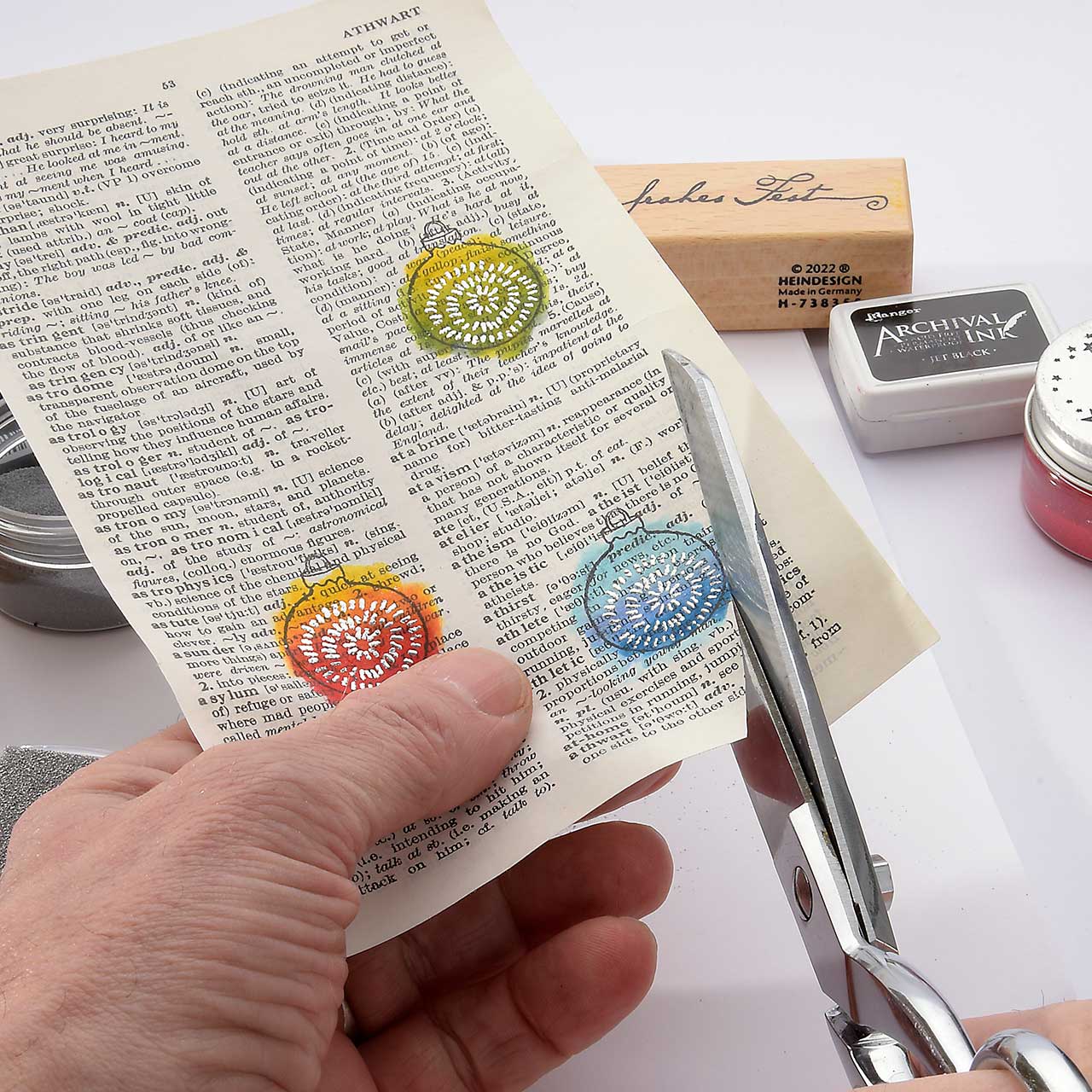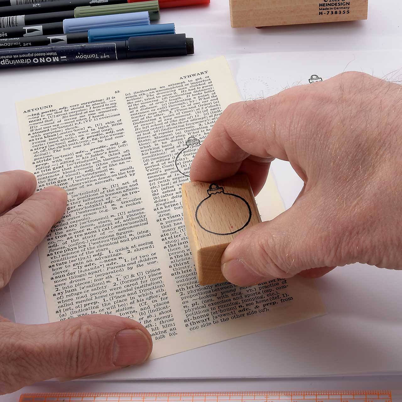 Stempeln Sie das Christbaumkugel Motiv mit dem schwarzen Archival Ink Stempelkissen ebenfalls drei Mal auf eine alte Buchseite (Wörterbücher haben schöne, dünne Seiten und sind ideal für diese Collage). Für ein gleichmäßiges Druckbild färben Sie den Stempel vor jedem Abdruck erneut ein.