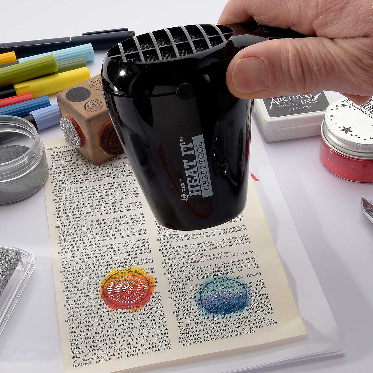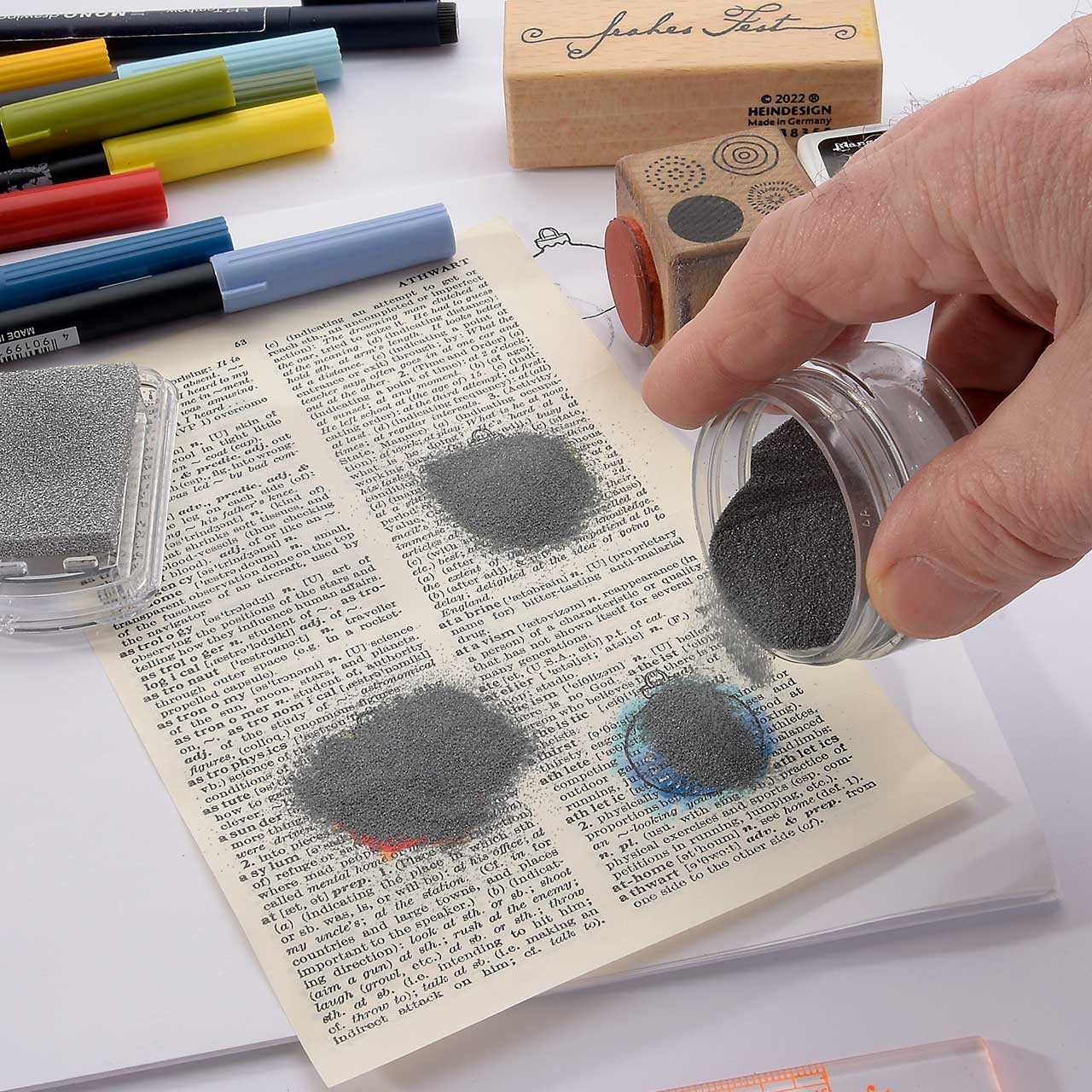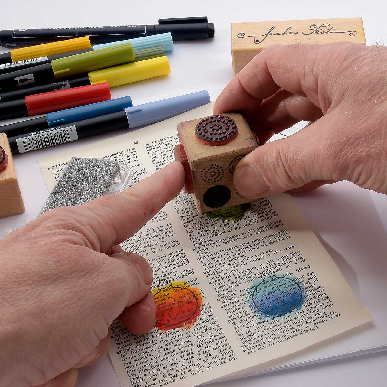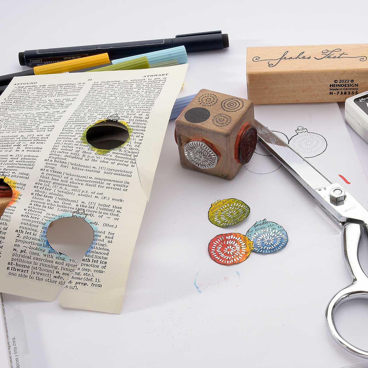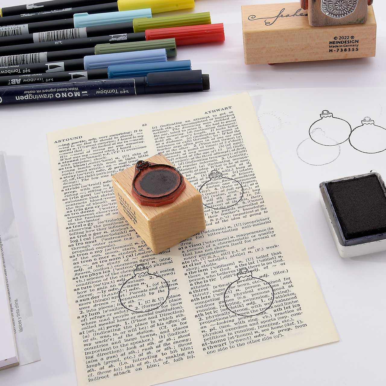 Stempeln Sie das Christbaumkugel Motiv mit dem schwarzen Archival Ink Stempelkissen ebenfalls drei Mal auf eine alte Buchseite (Wörterbücher haben schöne, dünne Seiten und sind ideal für diese Collage). Für ein gleichmäßiges Druckbild färben Sie den Stempel vor jedem Abdruck erneut ein.