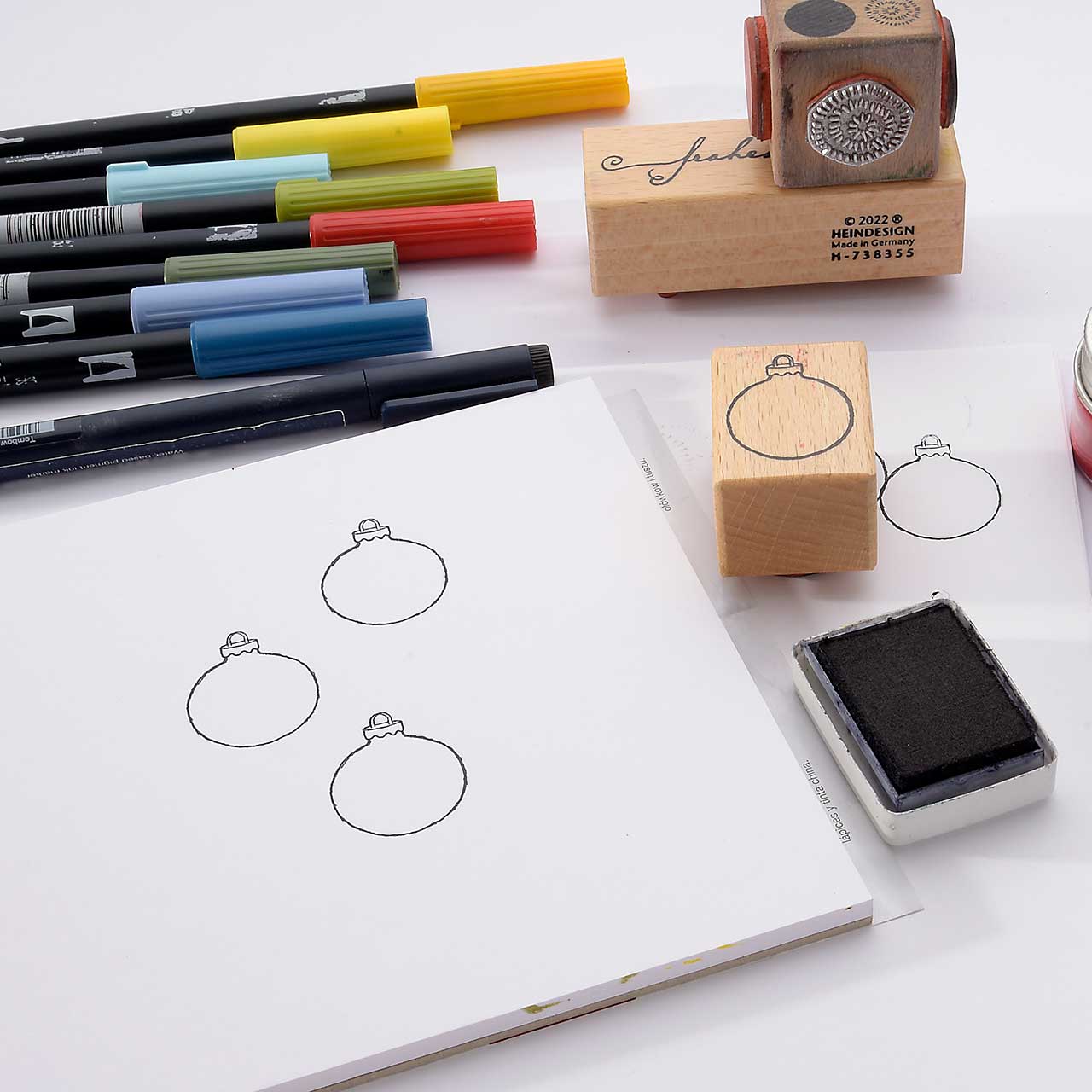 Ziehen Sie mit dem Tombow Fineliner von jedem der Christbaumkugel-Motive eine dünne Linie zum oberen Kartenrand und skizzieren Sie je eine kleine Schleife an den Christbaumkugelaufhängungen.