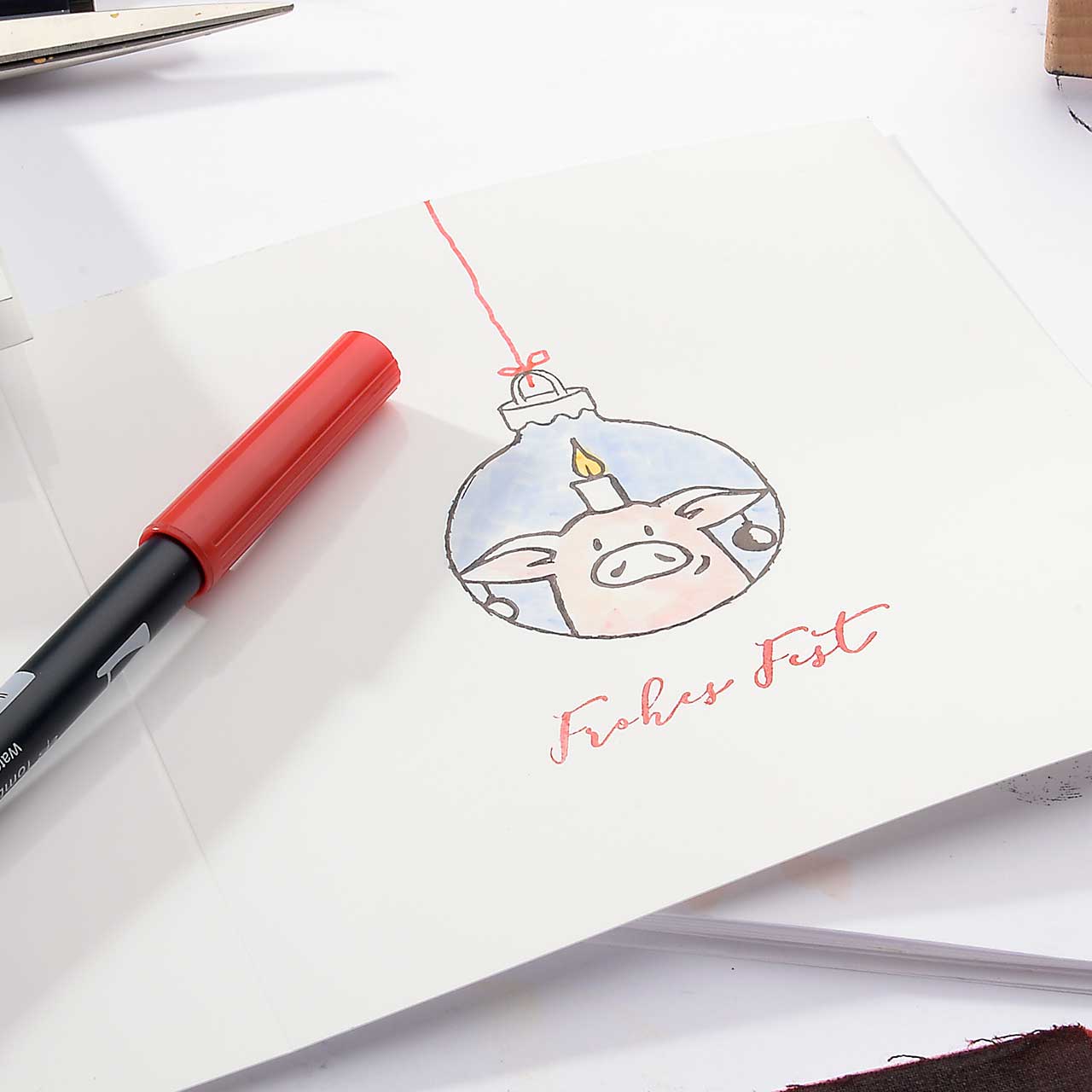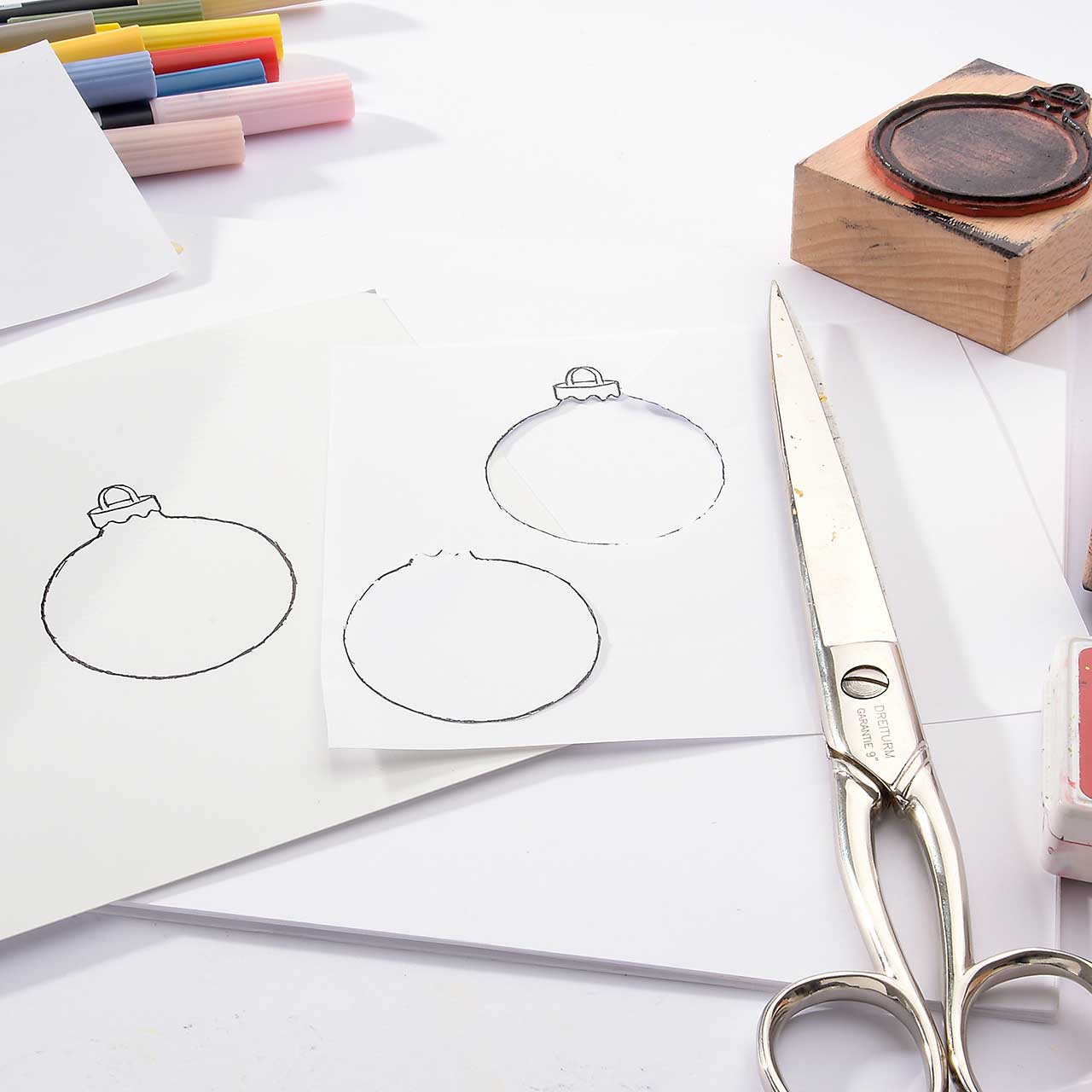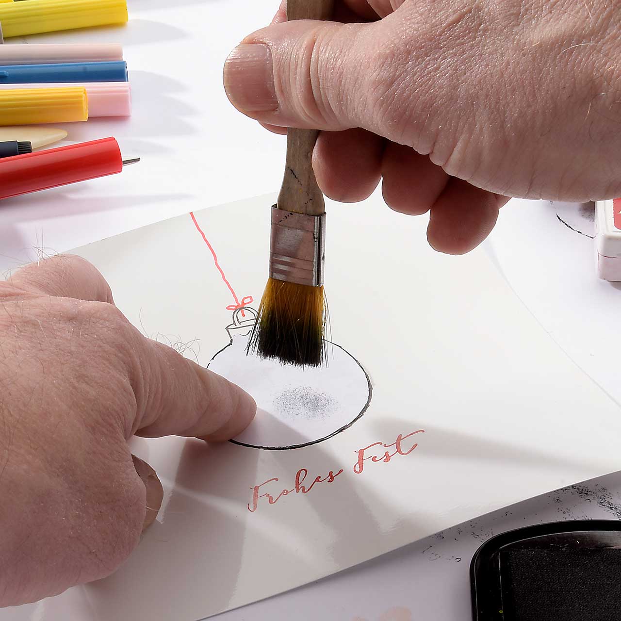 Ziehen Sie mit dem roten Faserschreiber eine Linie von dem Christbaumkugel Motiv zum oberen Kartenrand.
