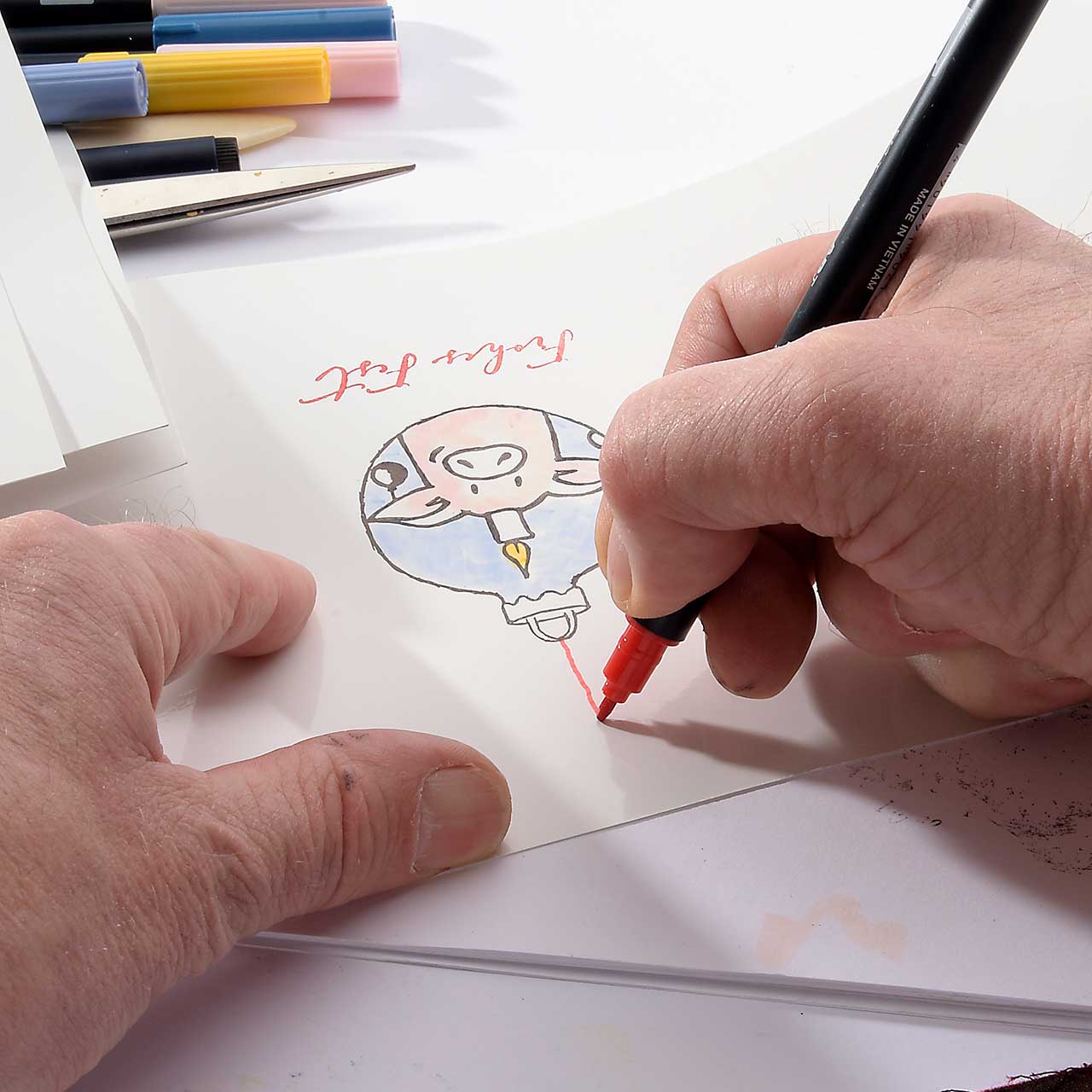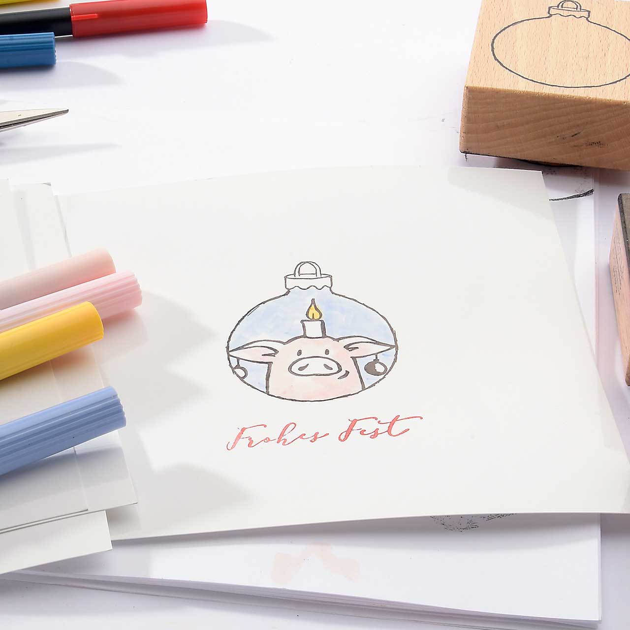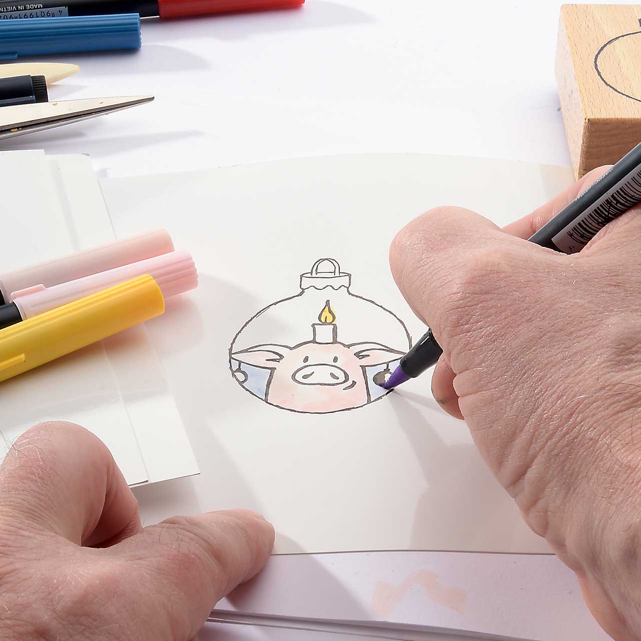 Ziehen Sie mit dem roten Faserschreiber eine Linie von dem Christbaumkugel Motiv zum oberen Kartenrand.