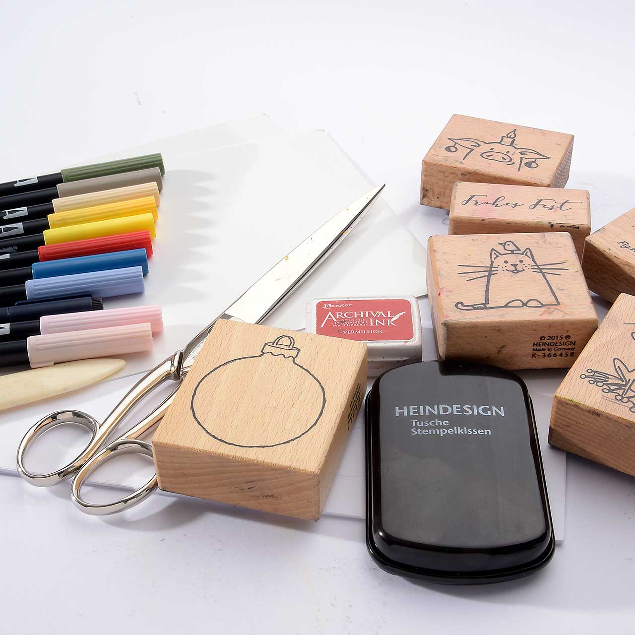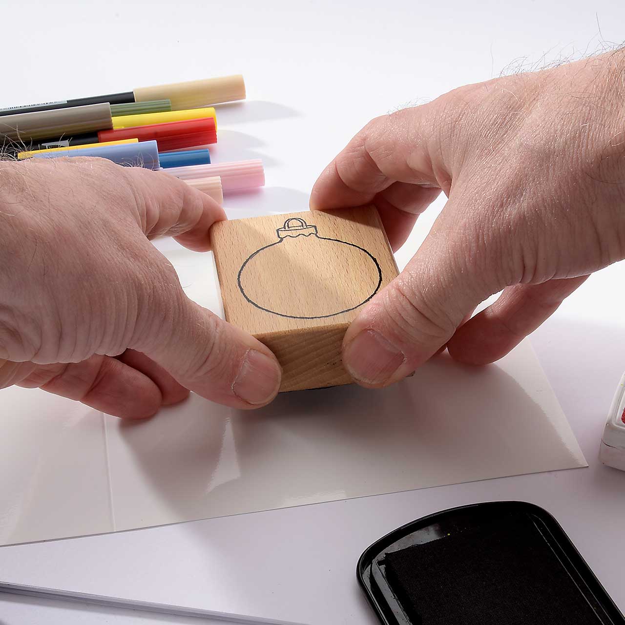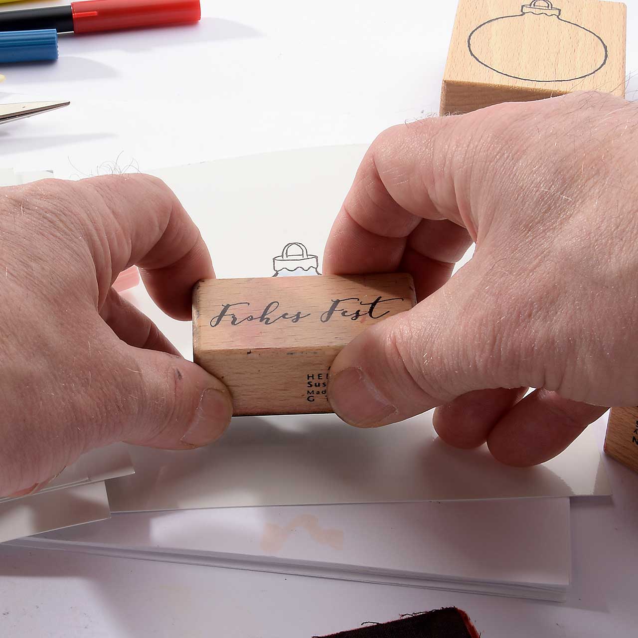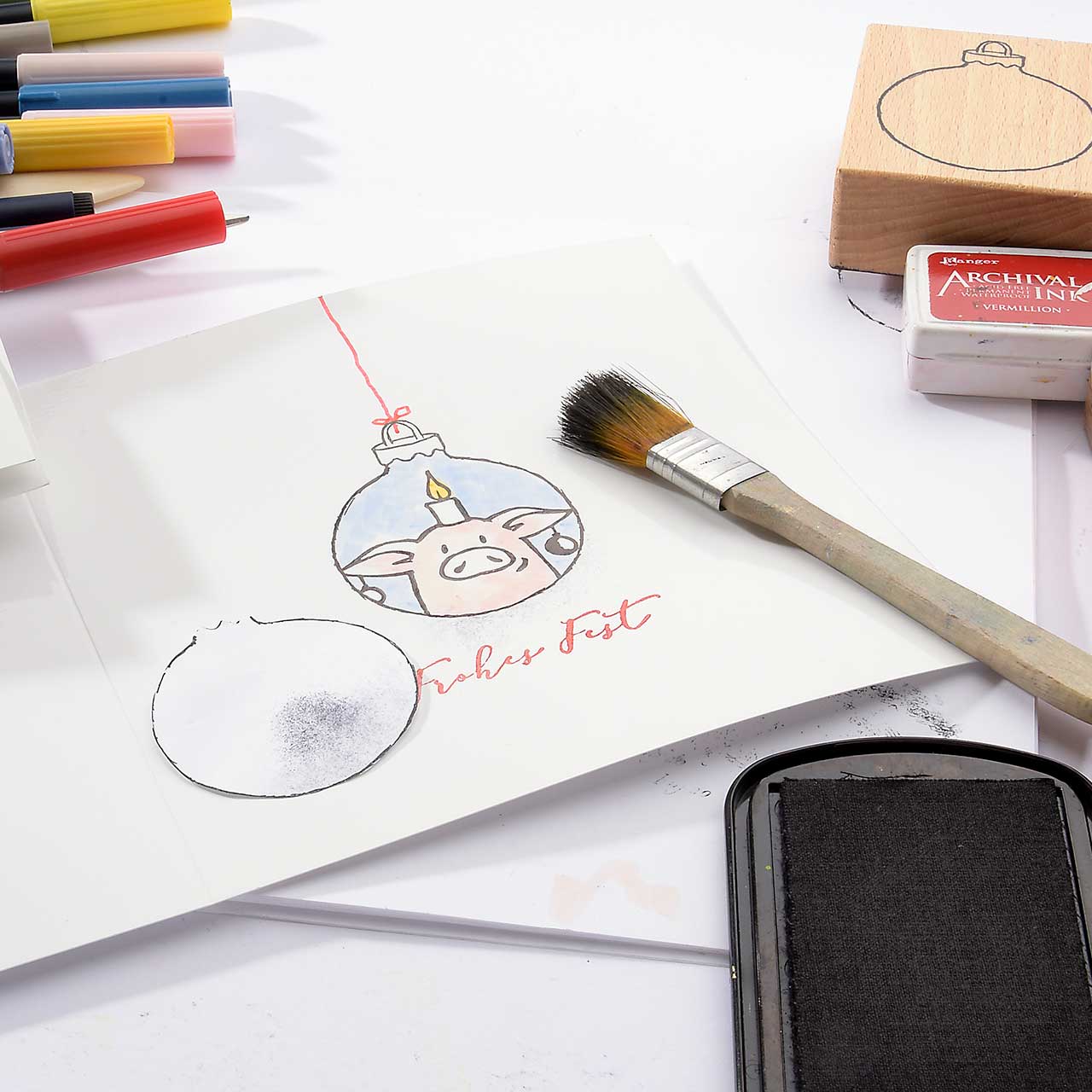 Stempeln Sie das Frohes Fest Textmotiv mit dem roten Stempelkissen unter das Christbaumkugel Motiv.