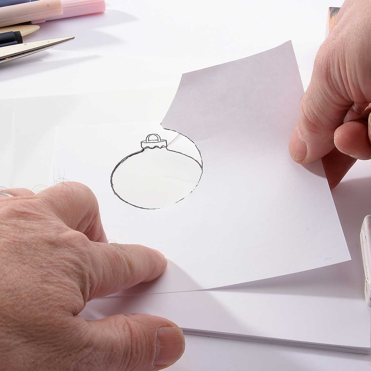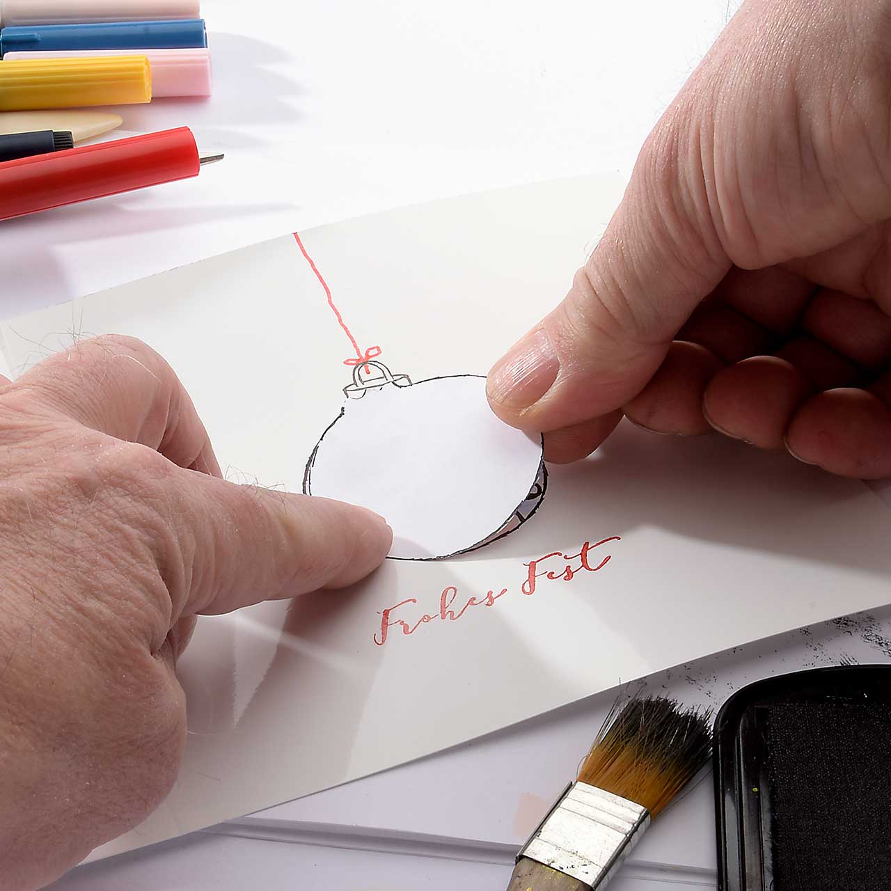 Legen Sie das Blatt mit dem Christbaumkugel Loch so auf Ihre Karte, dass die Karte um das Christbaumkugel Motiv abgedeckt ist.