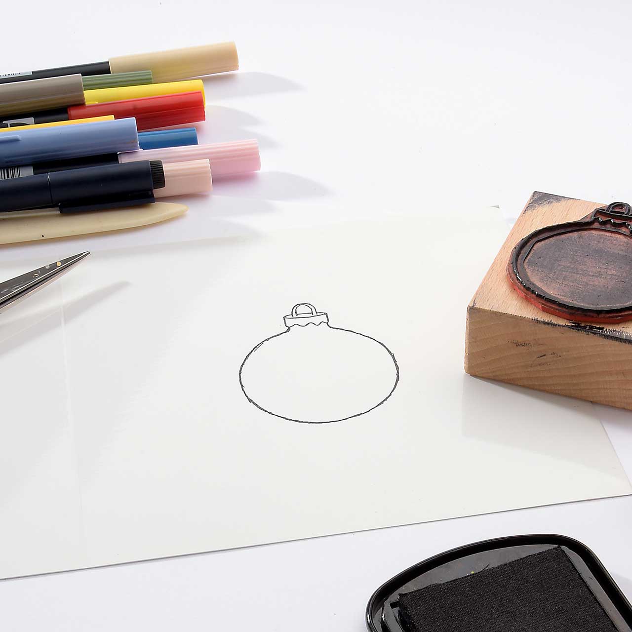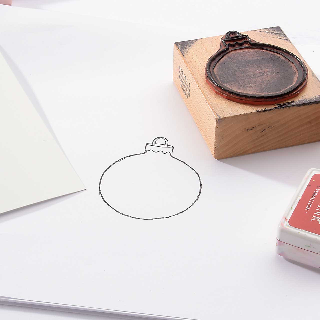 Stempeln Sie das Christbaumkugel Motiv mit dem schwarzen Stempelkissen in die Mitte Ihrer Karte und ein weiteres Mal auf ein Blatt Kopierpapier.