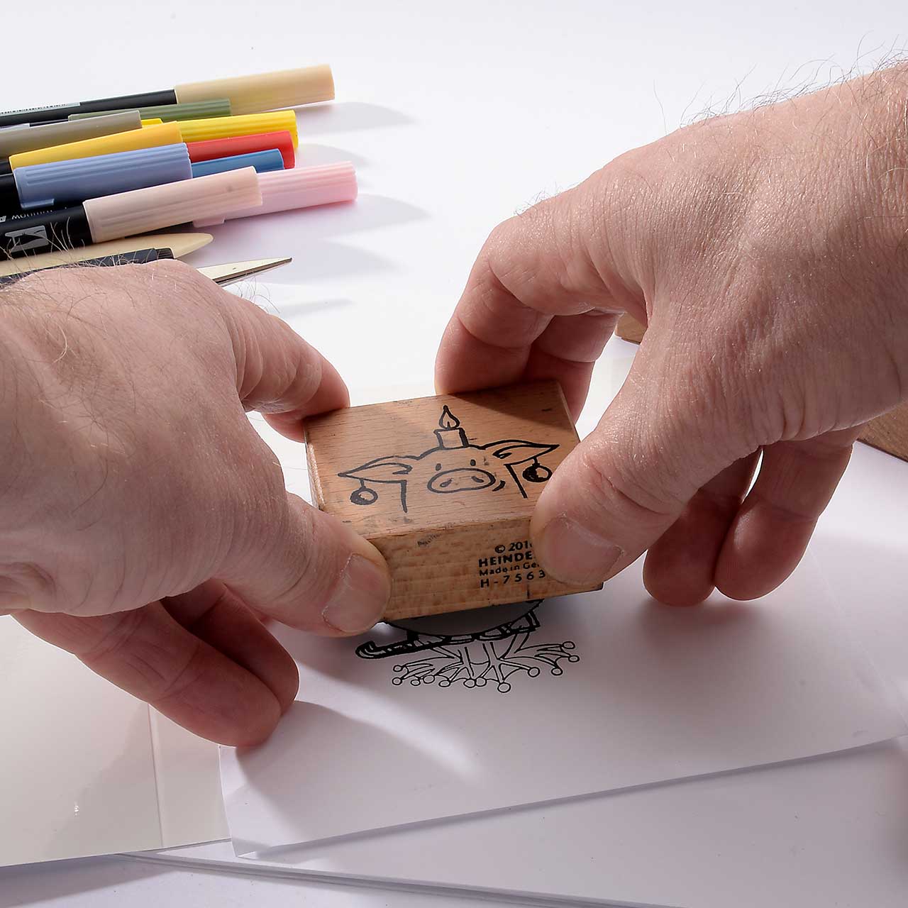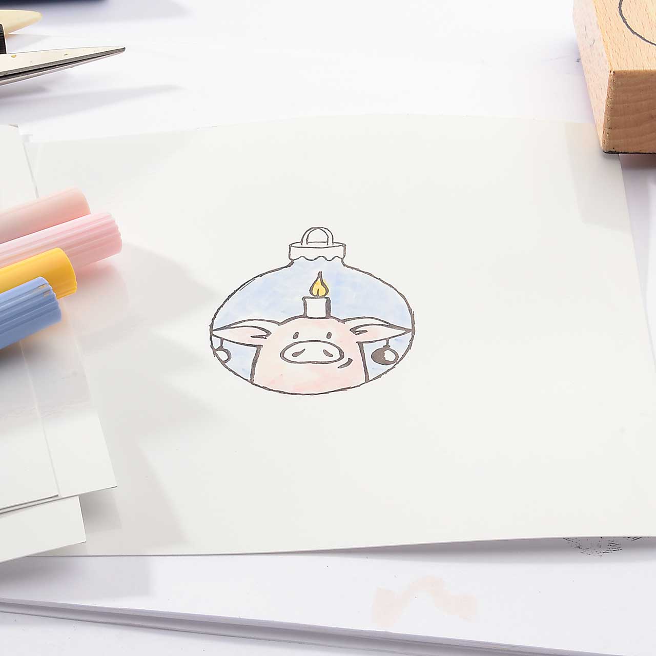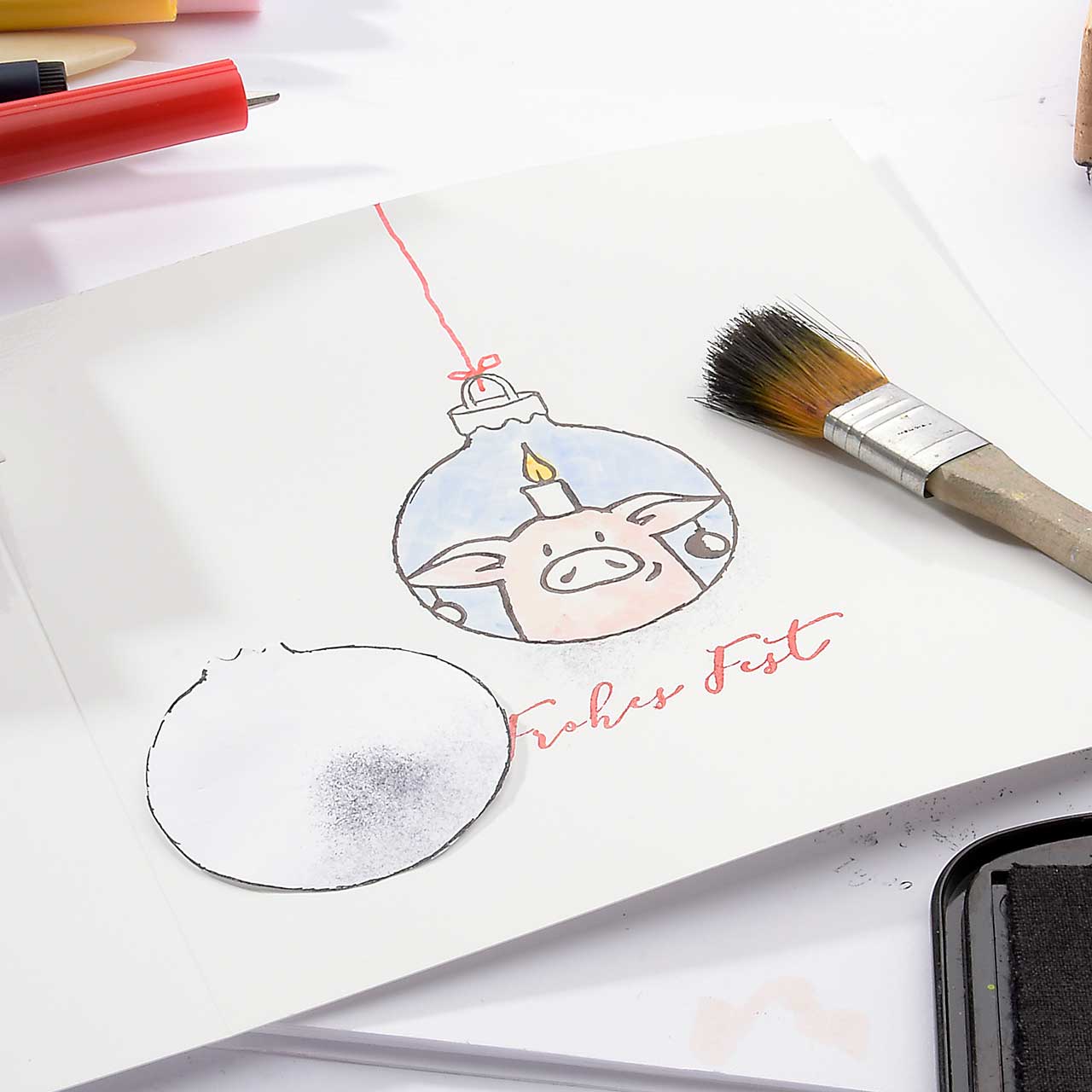 Stempeln Sie das Schweinische Weihnachten Motiv in die Mitte des Christbaumkugel Motivs.
