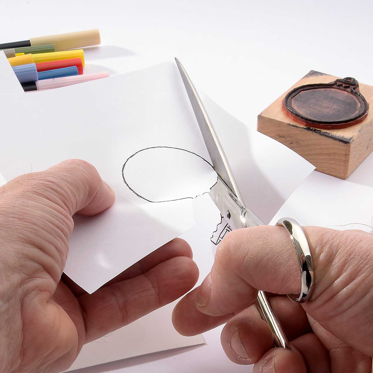 Schneiden Sie mit einer Schere das Christbaumkugel Motiv aus.