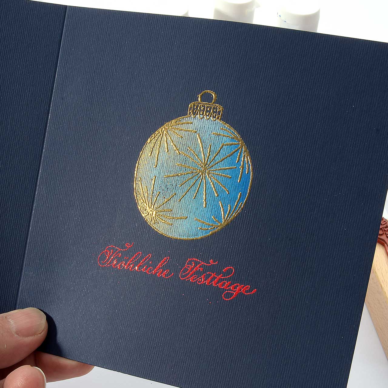 Stempeln und embossen Sie das „Fröhliche Festtage“-Textmotiv mit dem roten Sternenstaub unter das Christbaumkugel-Motiv.