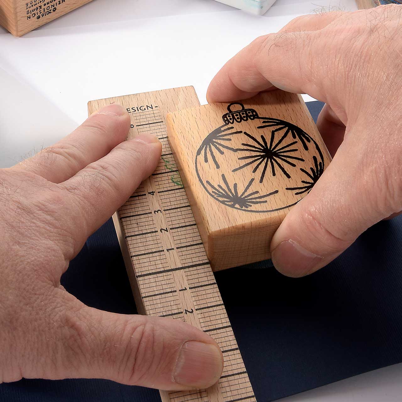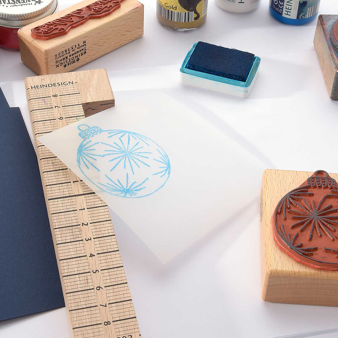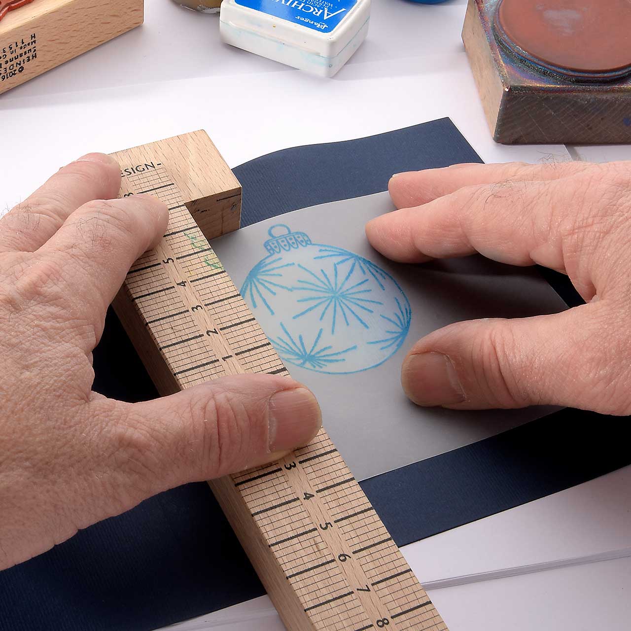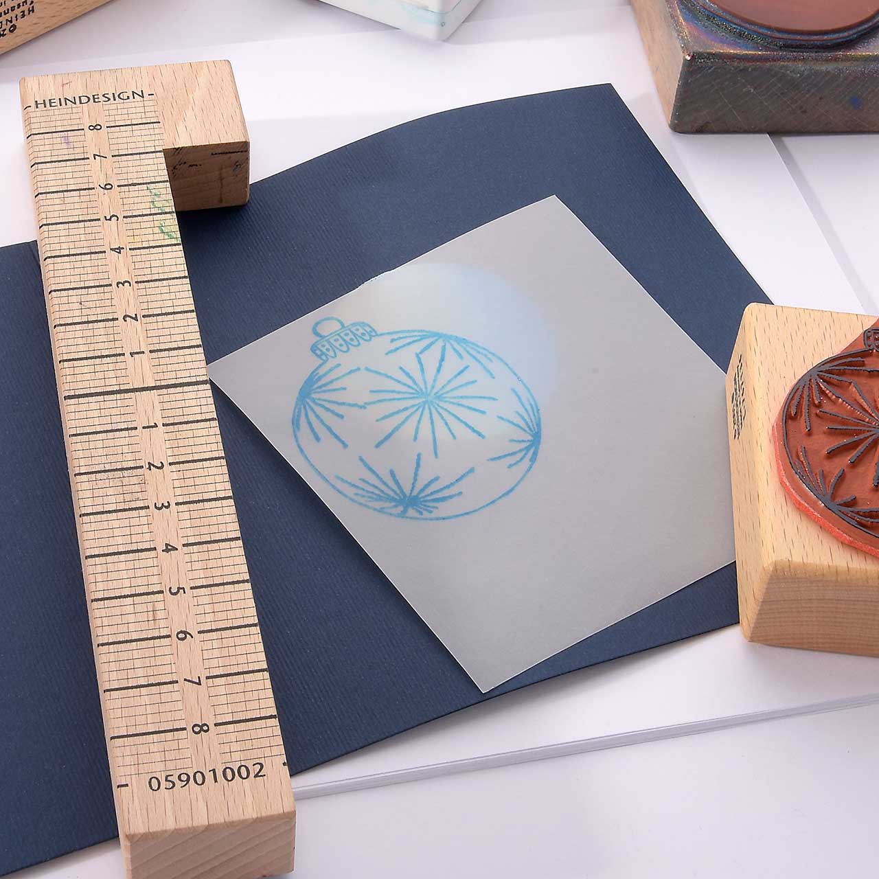 ** Legen Sie das Transparentpapier in die Ecke des Stempelanlegewinkels und stempeln Sie das Motiv darauf. Das Transparentpapier können Sie dann auf der Kreisfläche ausrichten und den Stempelwinkel erneut anlegen.