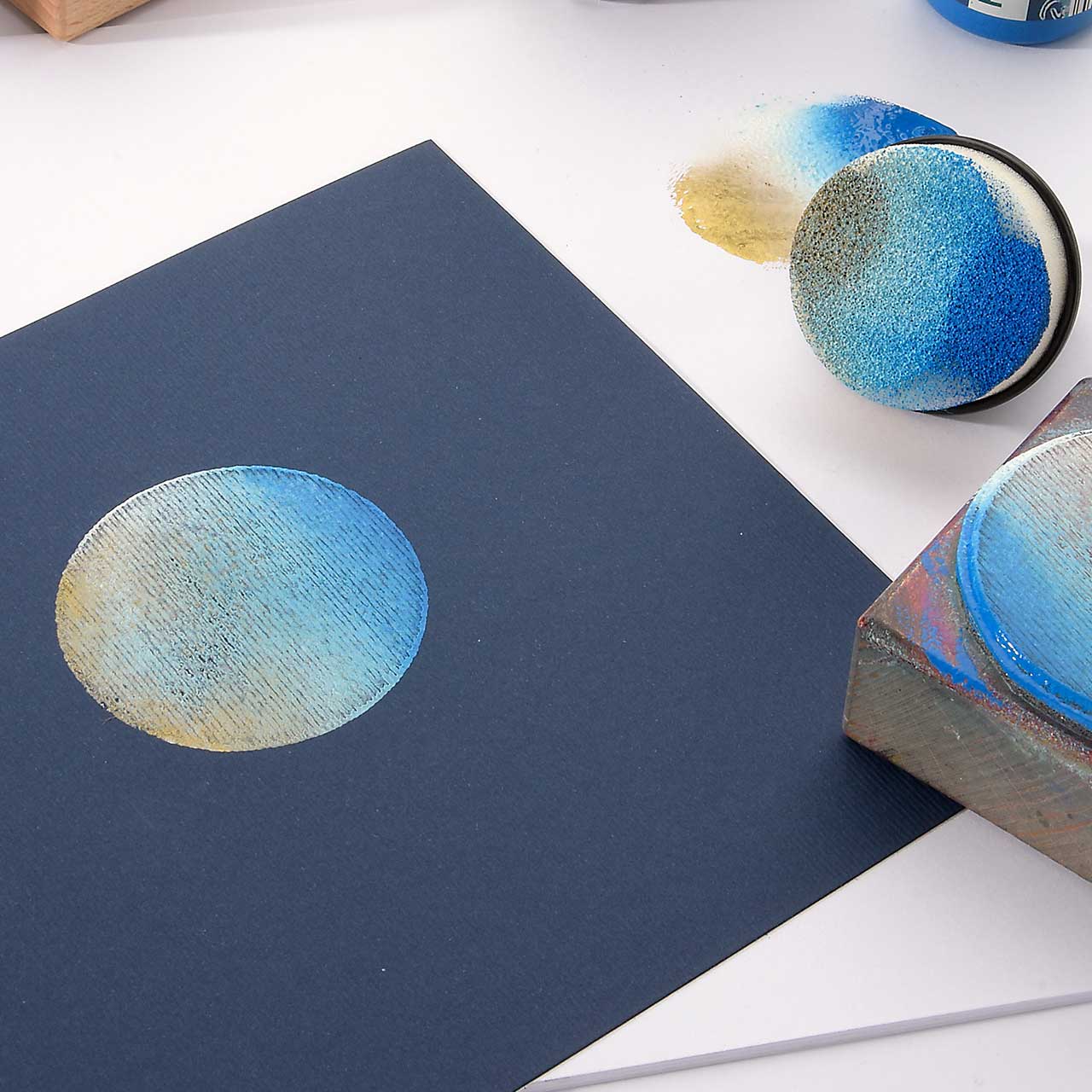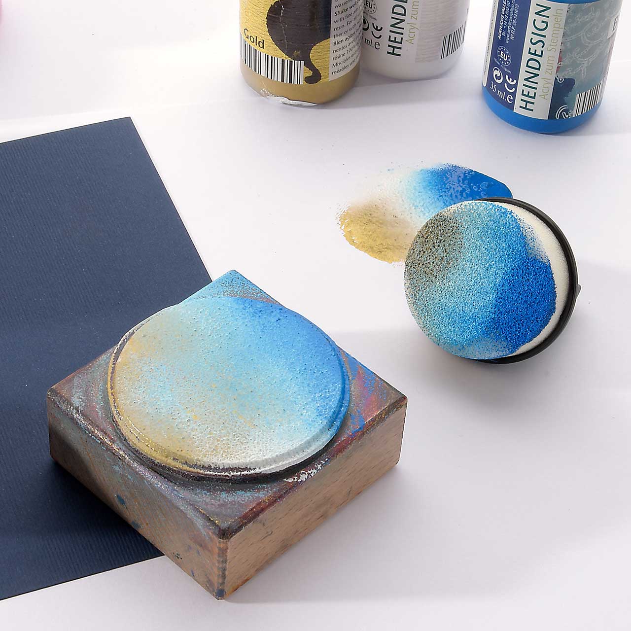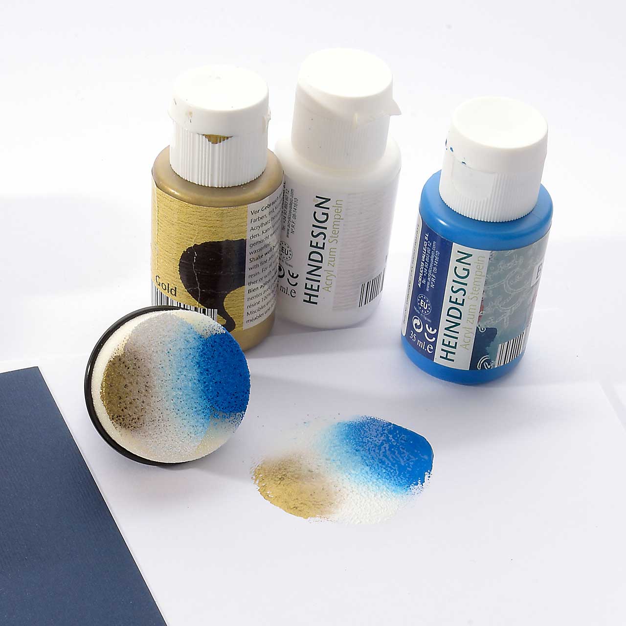 Nehmen Sie mit einem Farbtupfer Schwämmchen goldene, weiße und blaue Acryl zum Stempeln Farbe auf. Färben Sie mit dem Schwämmchen den Kreisflächen Stempel ein. Stempeln Sie das Motiv in die Mitte Ihrer Karte.