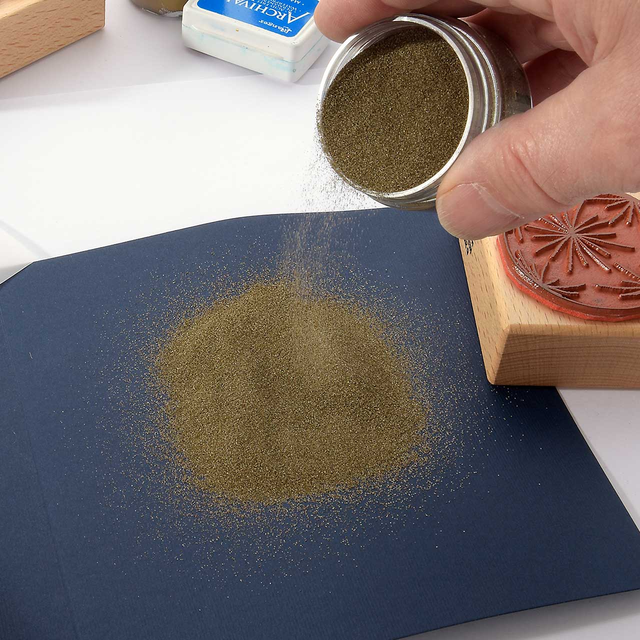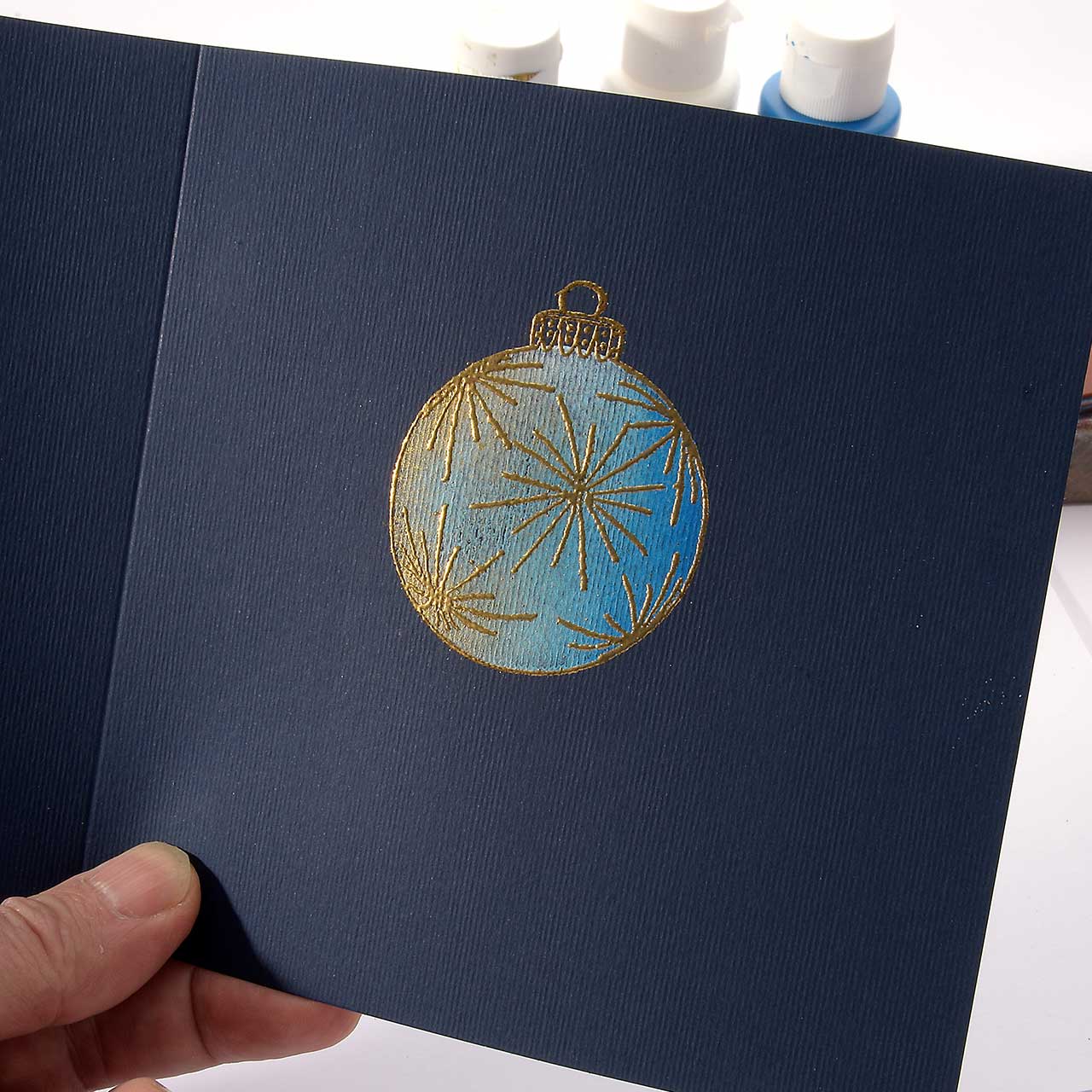 Stempeln und embossen Sie das Christbaumkugel-Motiv mit dem goldenen Sternenstaub passgenau auf die farbige Kreisfläche.