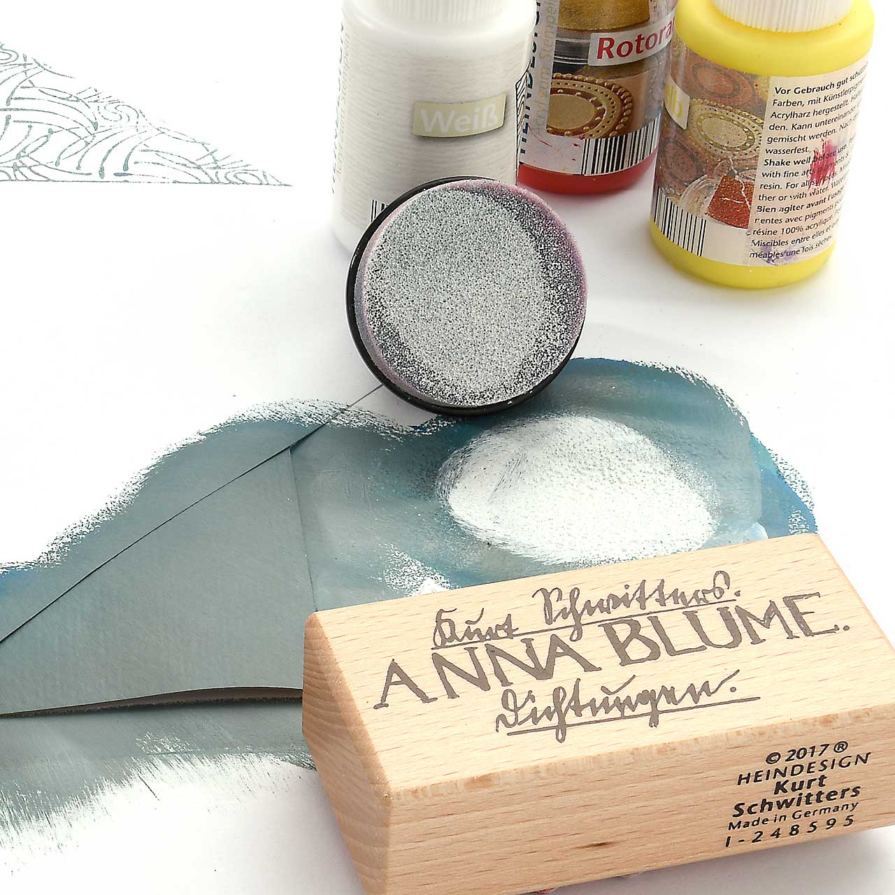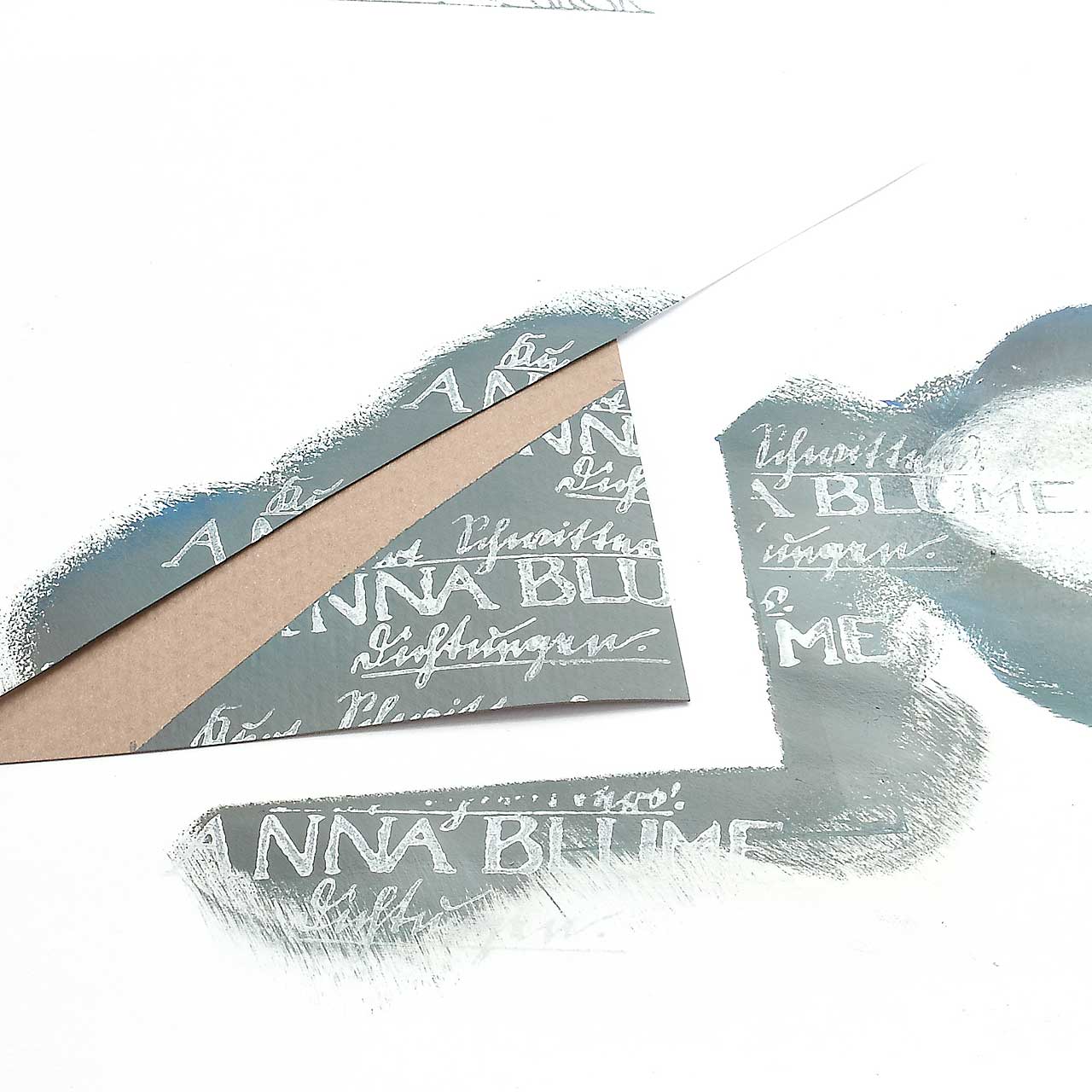 Nehmen Sie mit Ihrem Farbtupfer Schwämmchen weiße Acrylfarbe auf und färben Sie damit den Anna Blume Stempel ein. Falls das Kopierpapier verrutscht ist, richten Sie es wieder aus und stempeln Sie das Motiv mehrmals versetzt auf die blaue Ecke. (Vor jedem Abdruck den Stempel erneut einfärben.)
